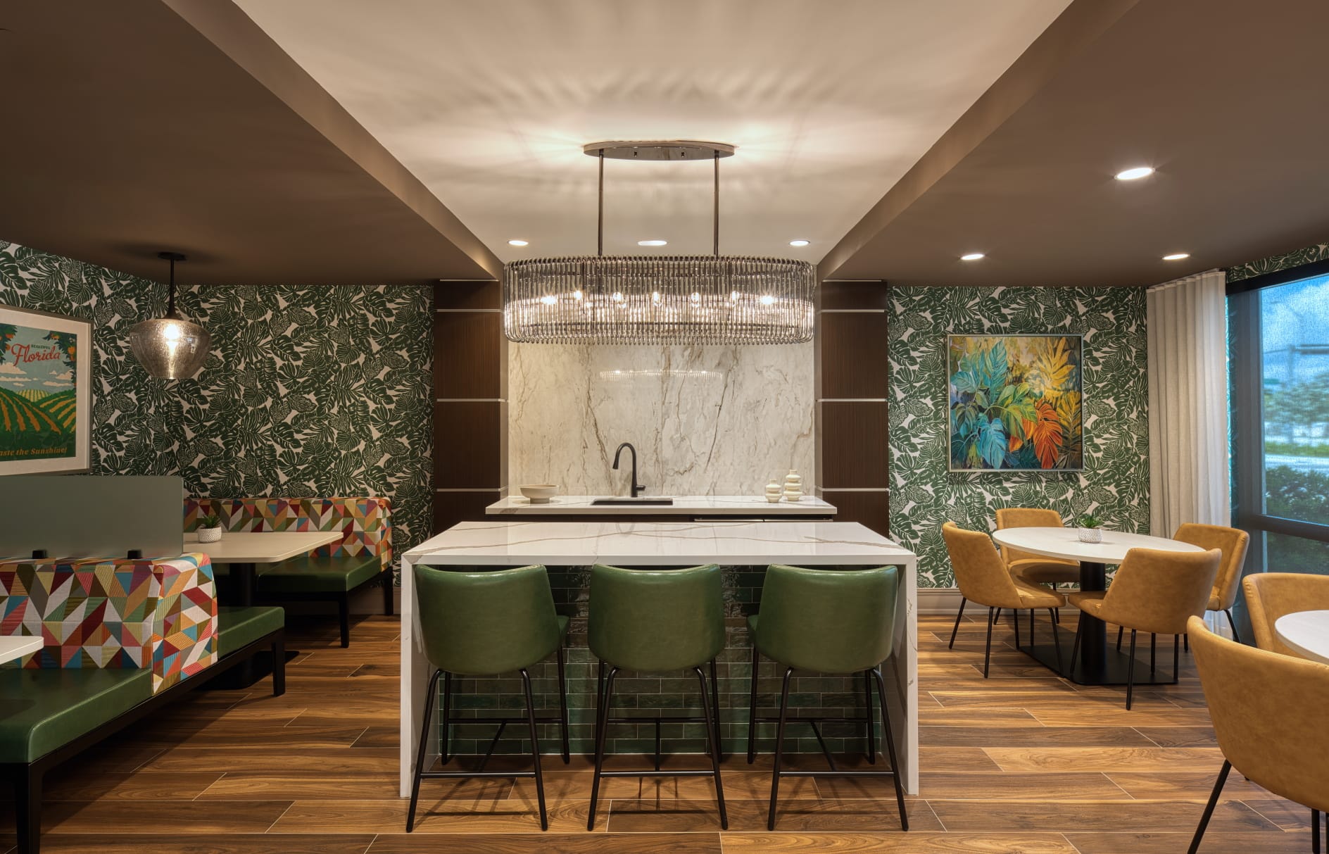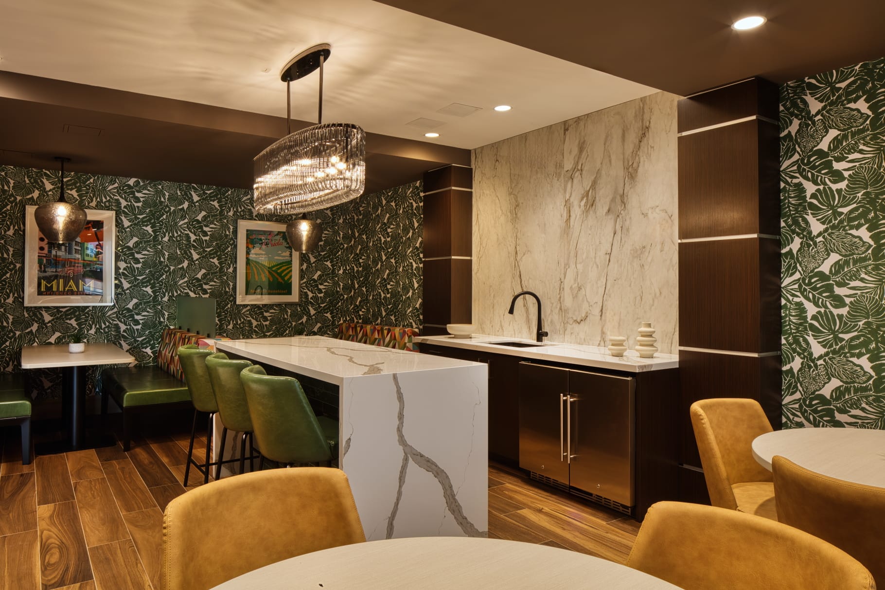 This Adult Living Facility in Miami exemplifies a fusion of functionality and design, providing a warm and welcoming environment for residents. The flooring throughout the facility incorporates a mix of luxury vinyl tile (LVT), tile, and intricate mosaics, creating a visually stunning yet durable foundation.
