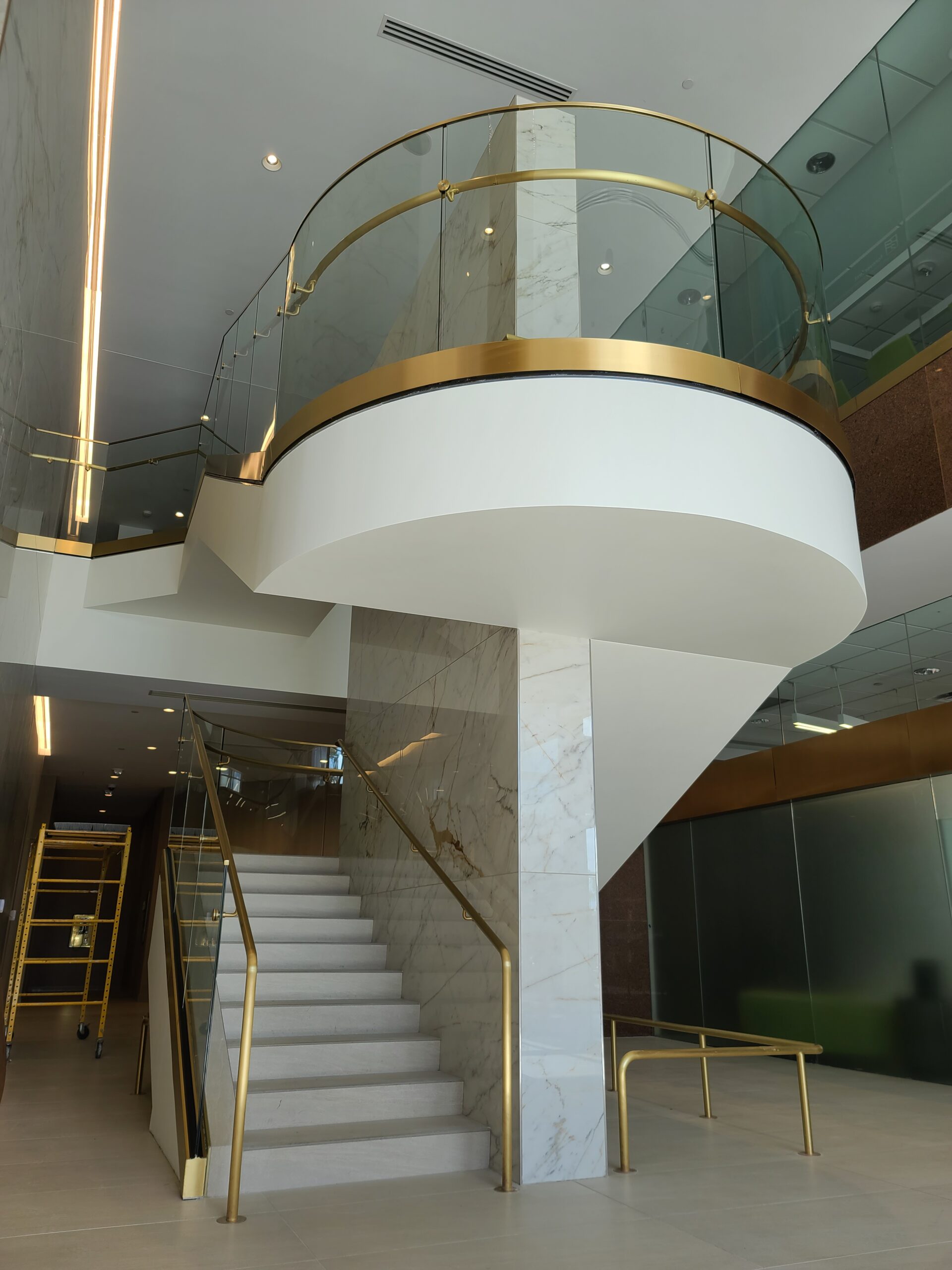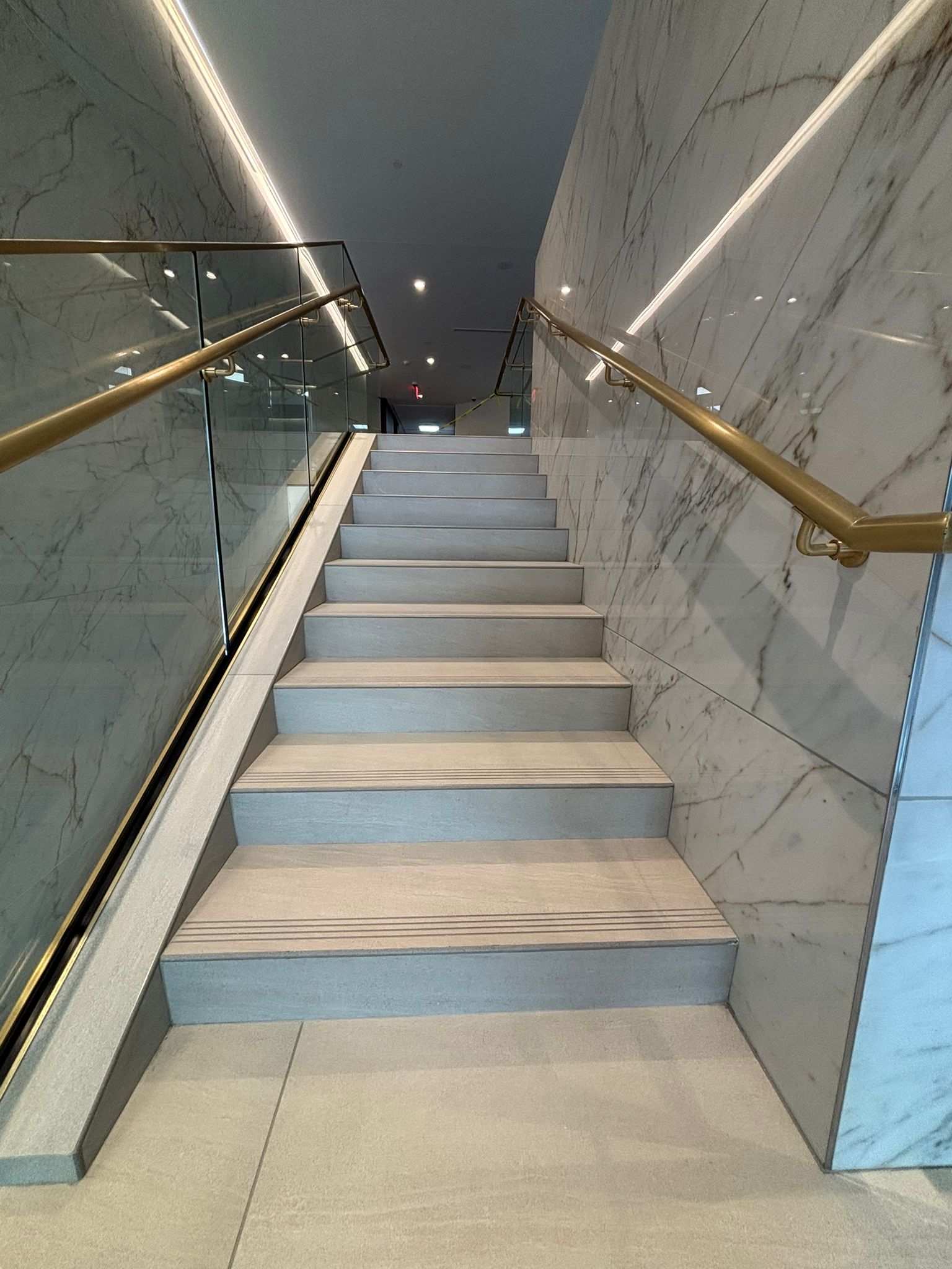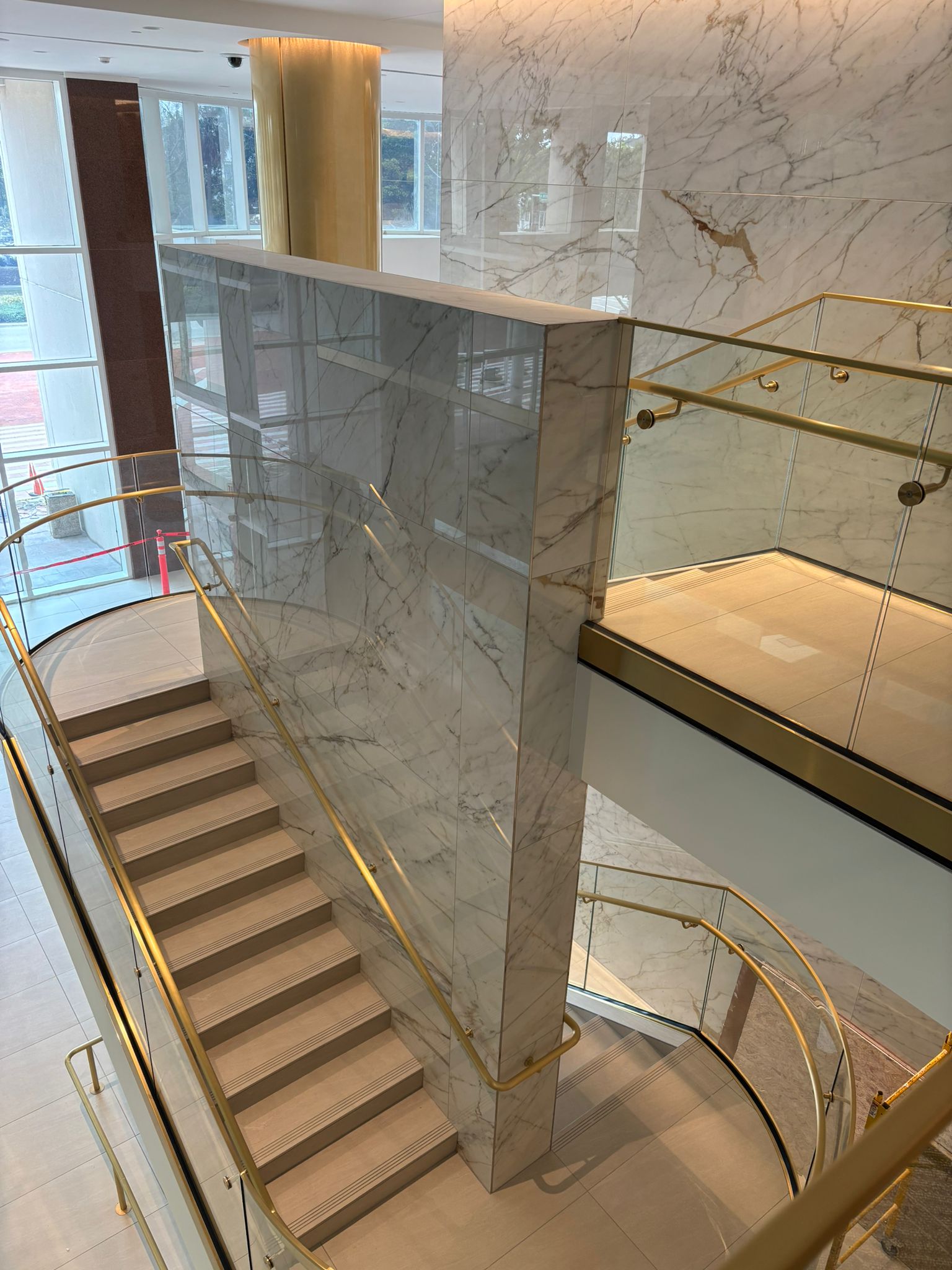 The successful execution of this project required meticulous preparation and innovative solutions to ensure the highest quality installation across all finishes. The lobby walls, where Calacatta slabs, 48″ X 110″, were to be installed, demanded extensive surface preparation to achieve a flawless and lasting result. The existing granite walls had to be thoroughly ground down to remove surface irregularities and create a suitable substrate for proper adhesion. This crucial step was essential to guarantee the durability and precision of the new installation. The impressive 30-foot-high ceilings posed an additional challenge for which we needed to find a suitable solution. The substantial weight of the slabs necessitated the use of specialized equipment, specifically a scissor lift, to ensure precise placement and secure installation while maintaining the highest standards of safety and efficiency.