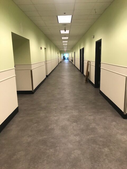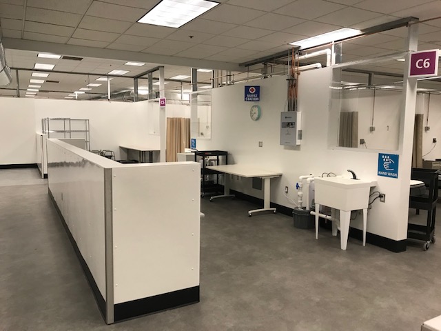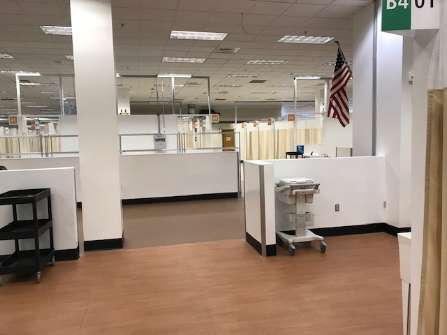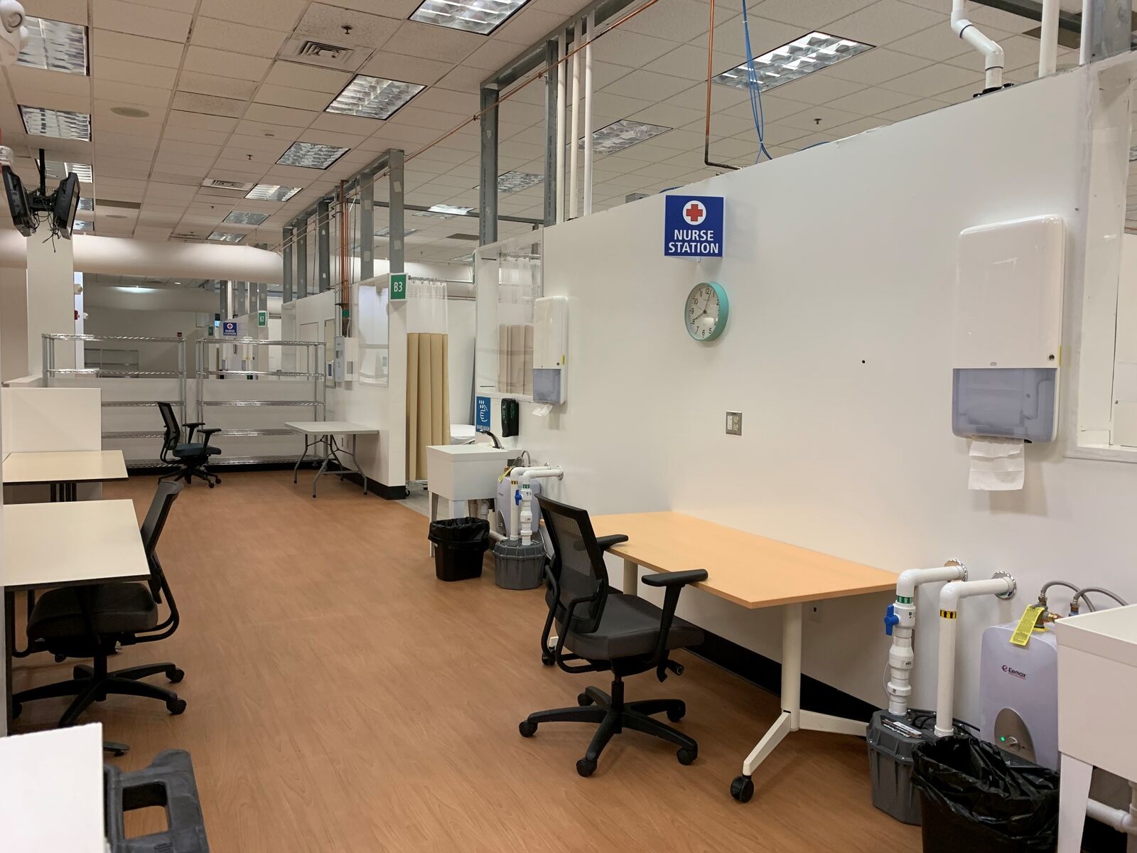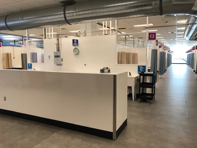 We were engaged on a Friday by one of our close General Contractors on a Temporary Rapid Response “hospital” to accommodate COVID-19 patients. The challenge was we had to commit to receiving 100,000 sq. feet of sheet vinyl for the following week. We worked through the weekend to price the job, find this material and line up deliveries (this was only possible because both Tarkett and the distributor were working from home due to the virus). Monday at 7am we were officially released, we had 40,000 feet delivered to our warehouse on Tuesday April 7th, the other 60,000 feet came in on Thursday.