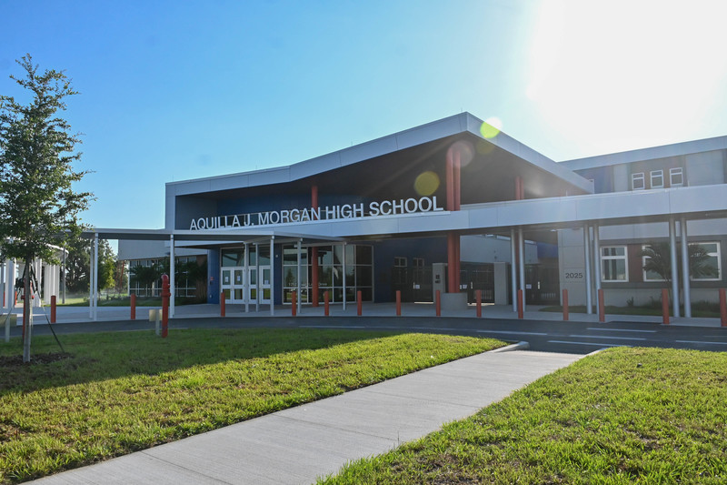 Aquilla J. Morgan High School is a state-of-the-art, 359,000-square-foot, three-story campus situated on an 87-acre site in southern Hillsborough County and designed to serve nearly 3,500 students. The campus welcomed students in August 2025, featuring a two-story media center, culinary and automotive labs, theater and auditorium with orchestra pit, cosmetology spaces, esports facilities, and a two-story gymnasium with indoor walking track. The broader site will ultimately include an elementary and middle school, forming a comprehensive educational hub for the community.