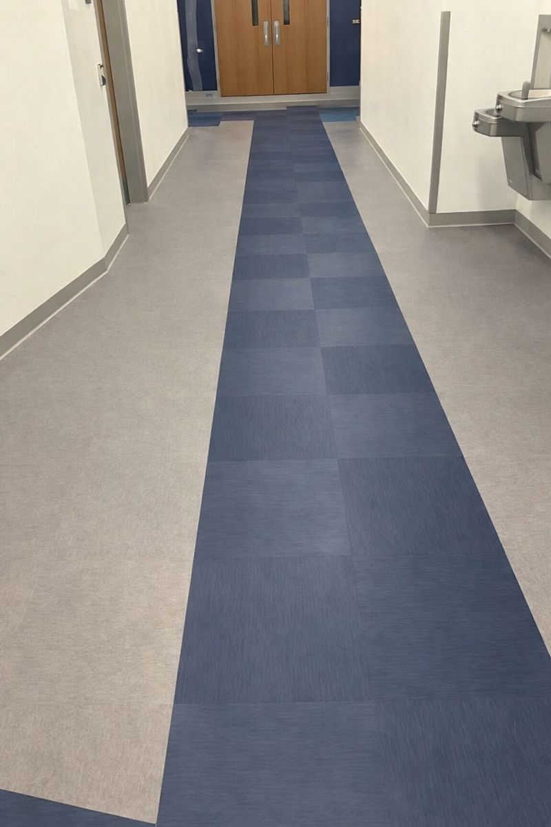 Once the correct boundary was identified, Certified Finishes adjusted the flooring layout patterns within each affected classroom so that the color transitions aligned precisely with the new safety line. This required: