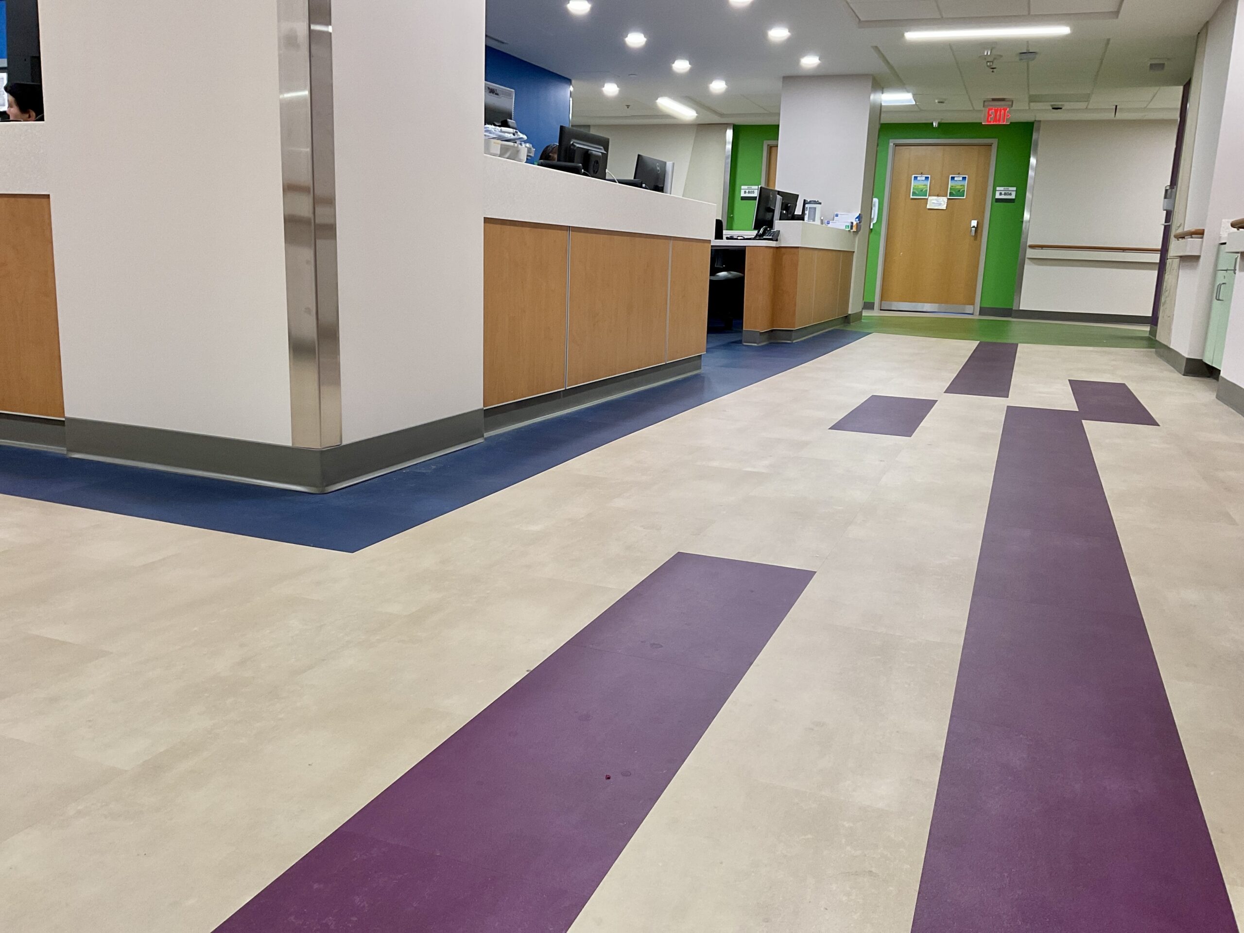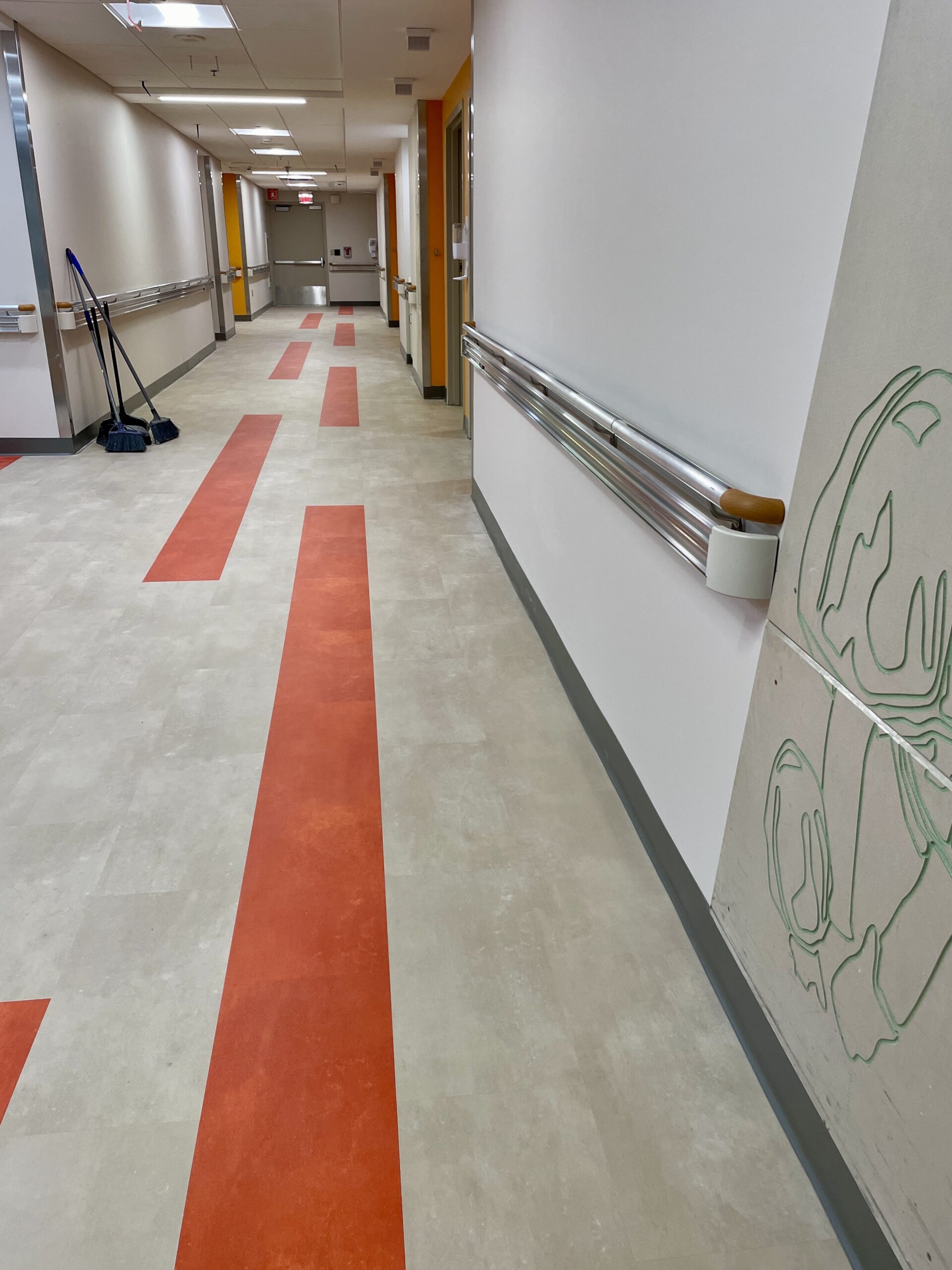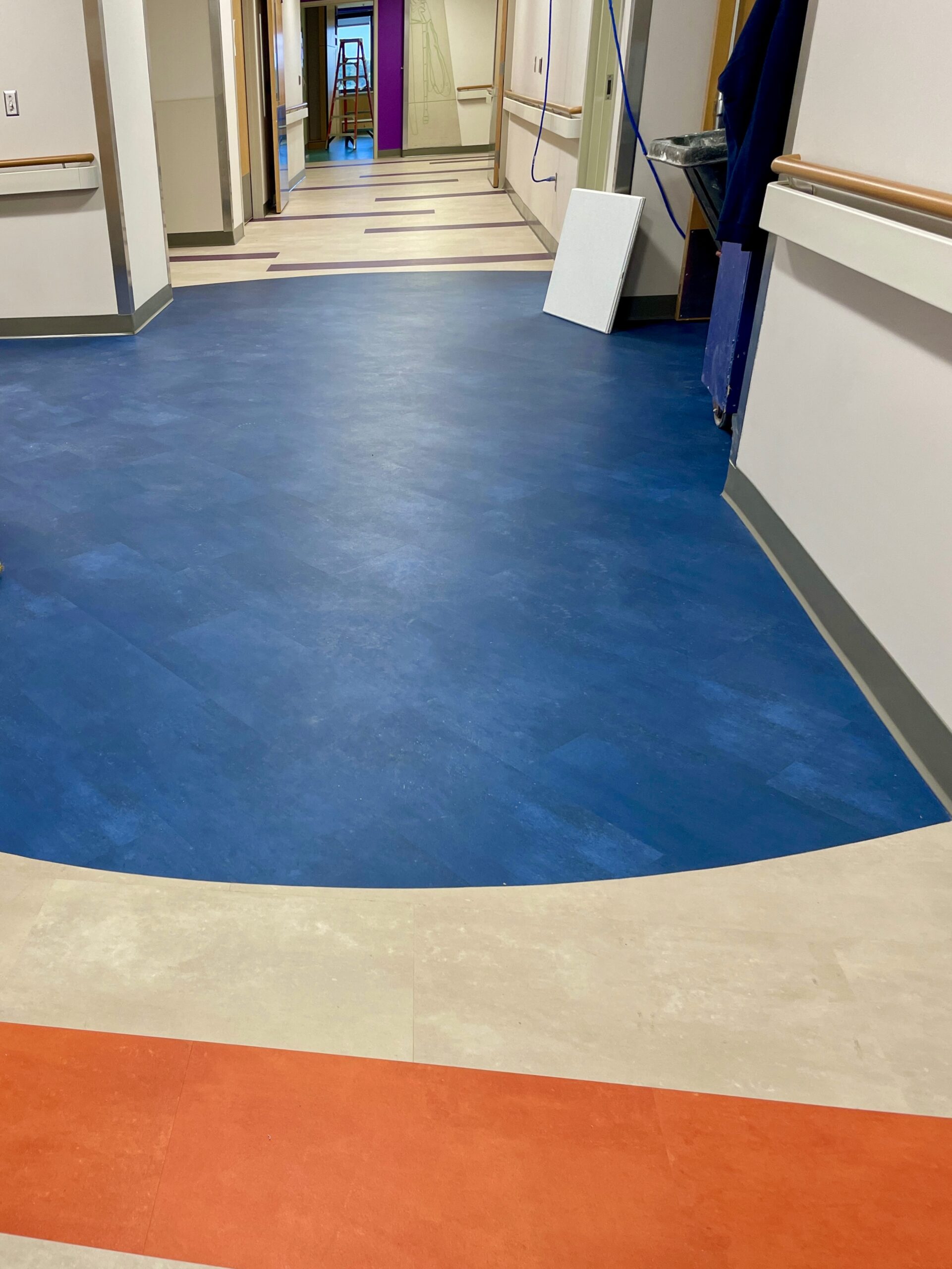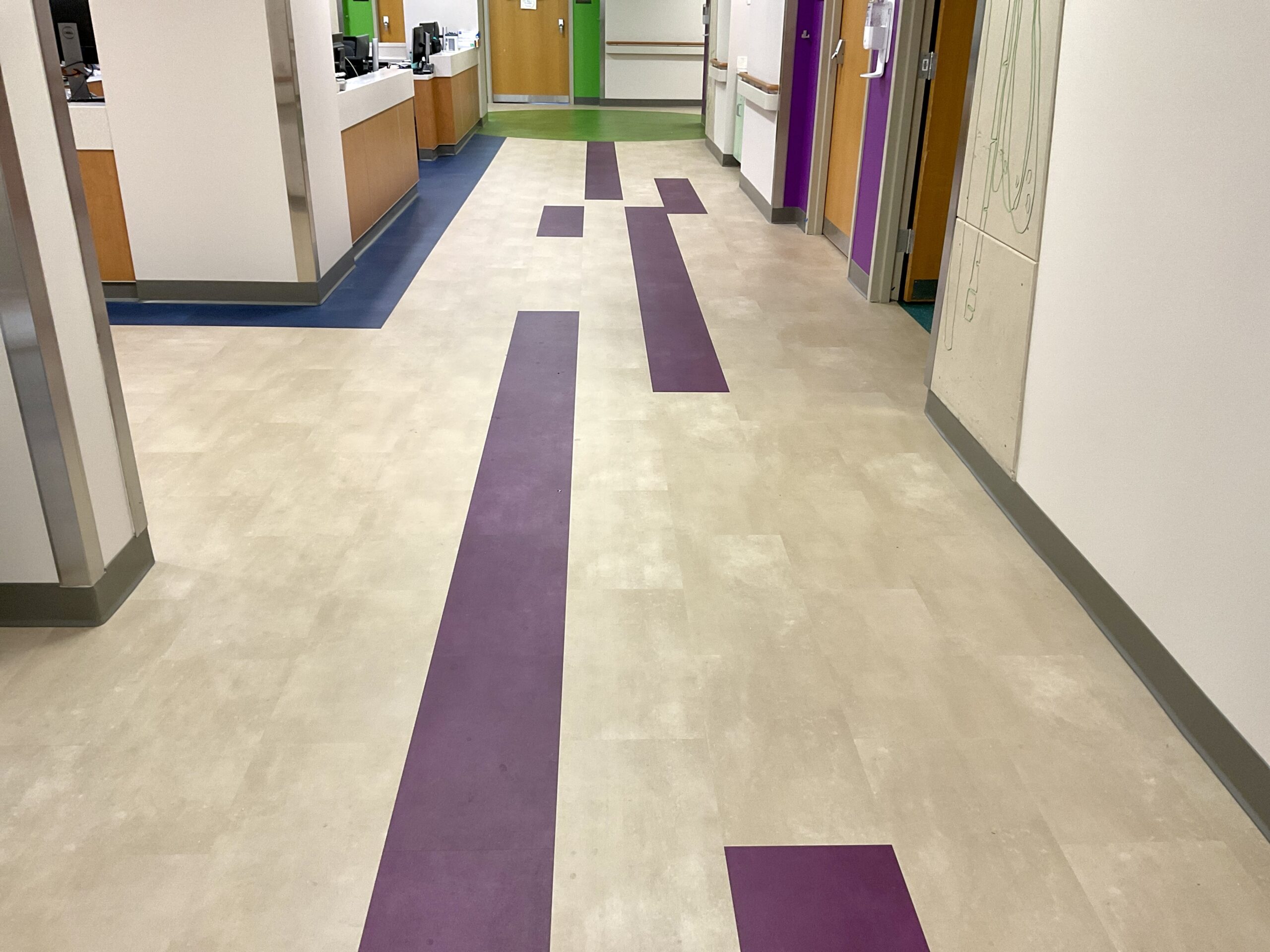 Originally designed for colorful sheet vinyl flooring with intricate patterns to run through the entire space, after collaboration with the design team, they opted to switch from sheet vinyl to Mohawk LVT in the corridor spaces. This still achieved the desired aesthetic while significantly reducing costs. This transition maintained durability, color vibrancy, and the seamless flooring solution needed, despite the phased nature of the project. Over 5,000lf of Johnsonite base was installed, alongside Daltile ceramic tile finishes in multiple restroom areas, ensuring a cohesive look and long-lasting quality across various hospital zones.