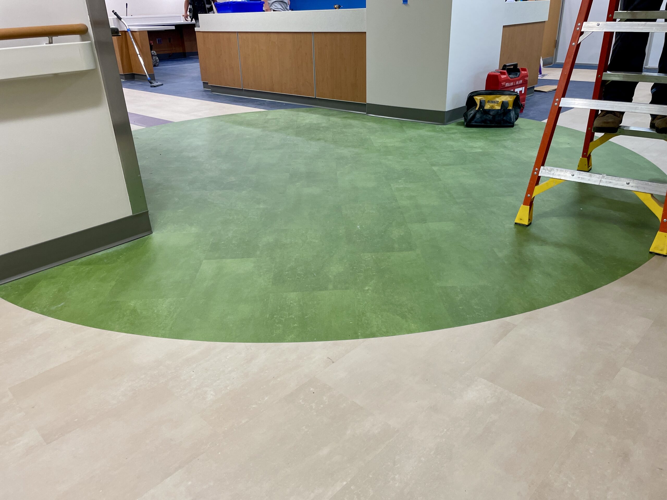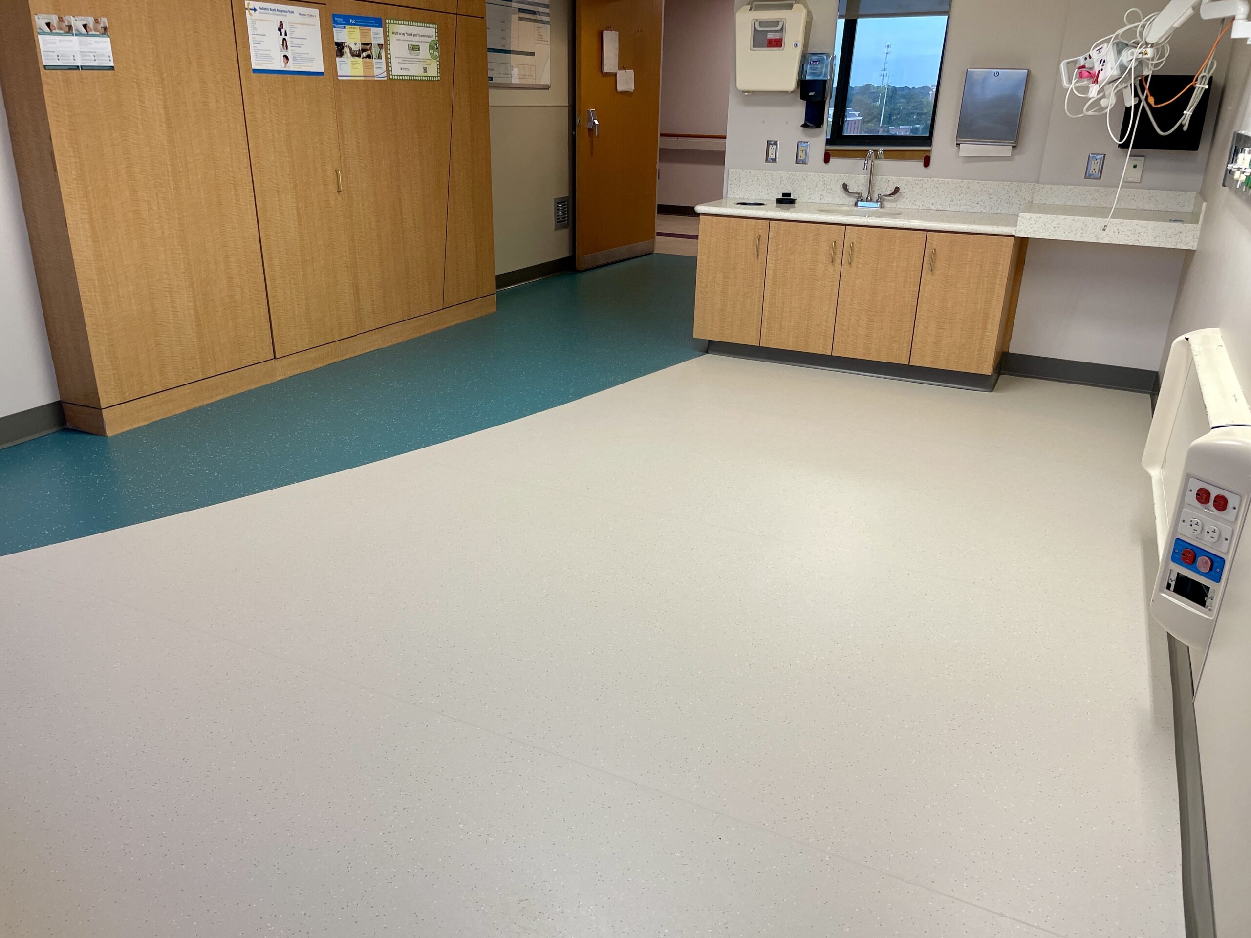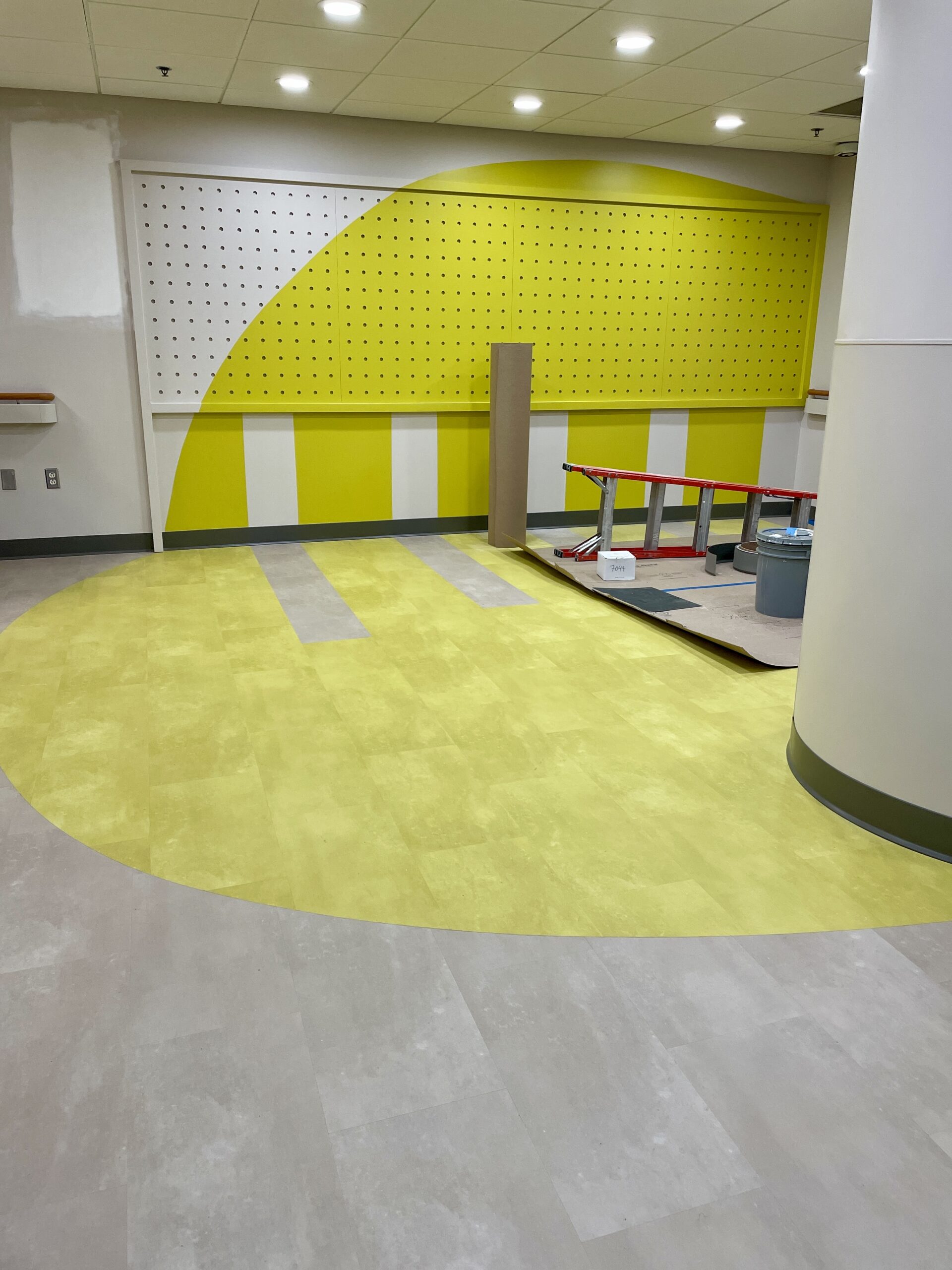 Originally designed for colorful sheet vinyl flooring with intricate patterns to run through the entire space, after collaboration with the design team, they opted to switch from sheet vinyl to Mohawk LVT in the corridor spaces. This still achieved the desired aesthetic while significantly reducing costs. This transition maintained durability, color vibrancy, and the seamless flooring solution needed, despite the phased nature of the project. Over 5,000lf of Johnsonite base was installed, alongside Daltile ceramic tile finishes in multiple restroom areas, ensuring a cohesive look and long-lasting quality across various hospital zones.