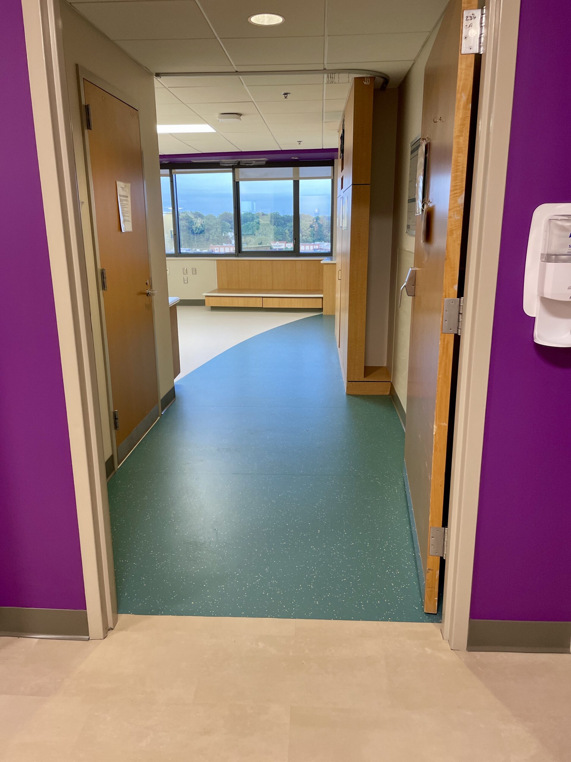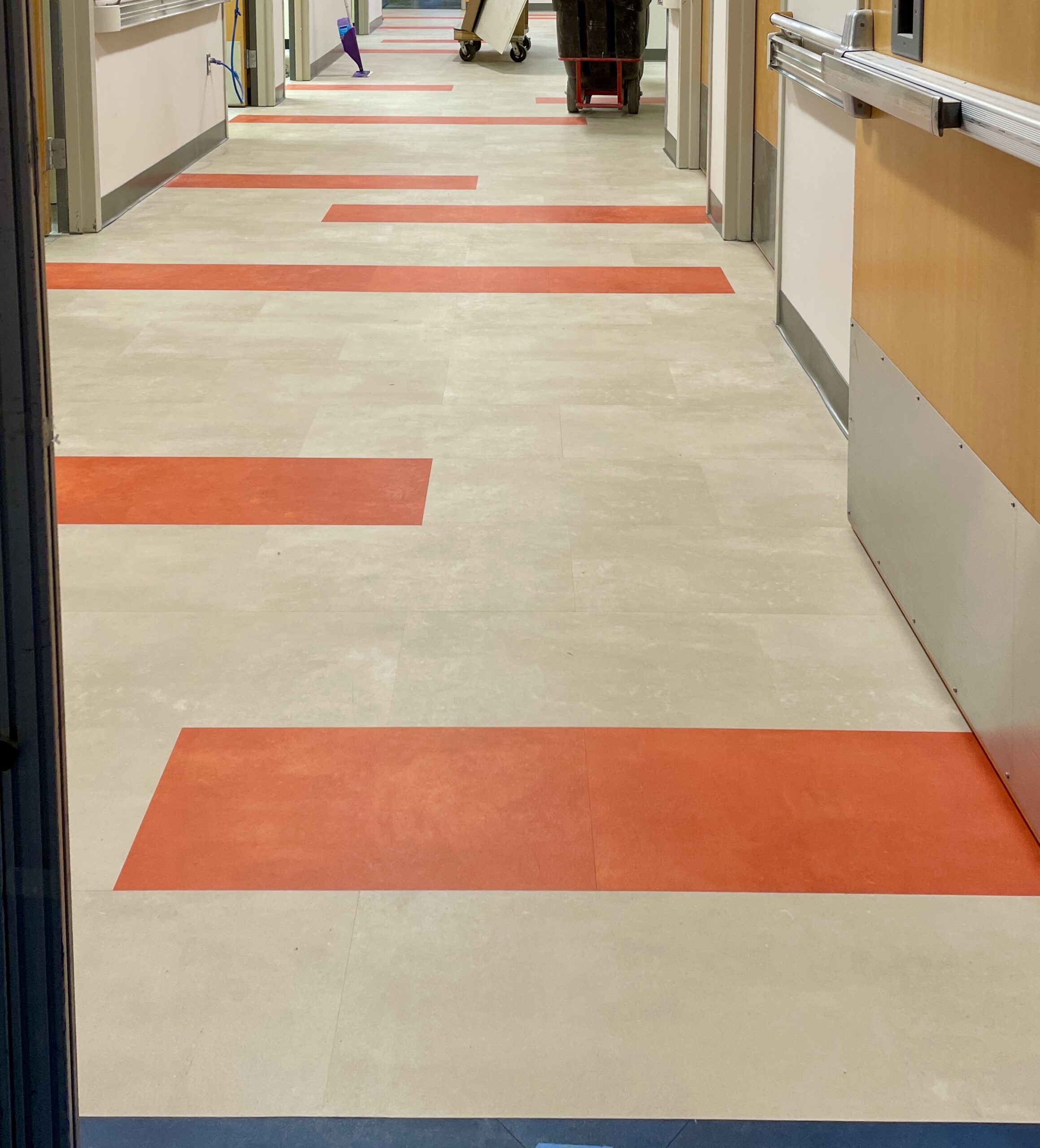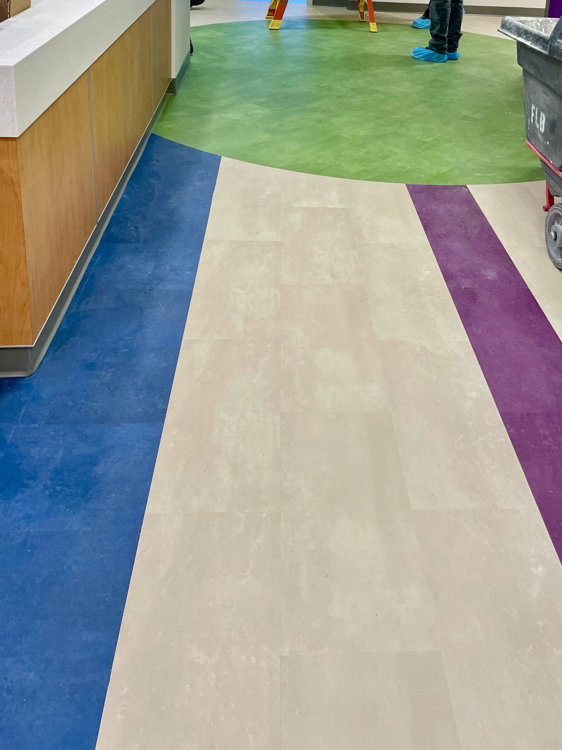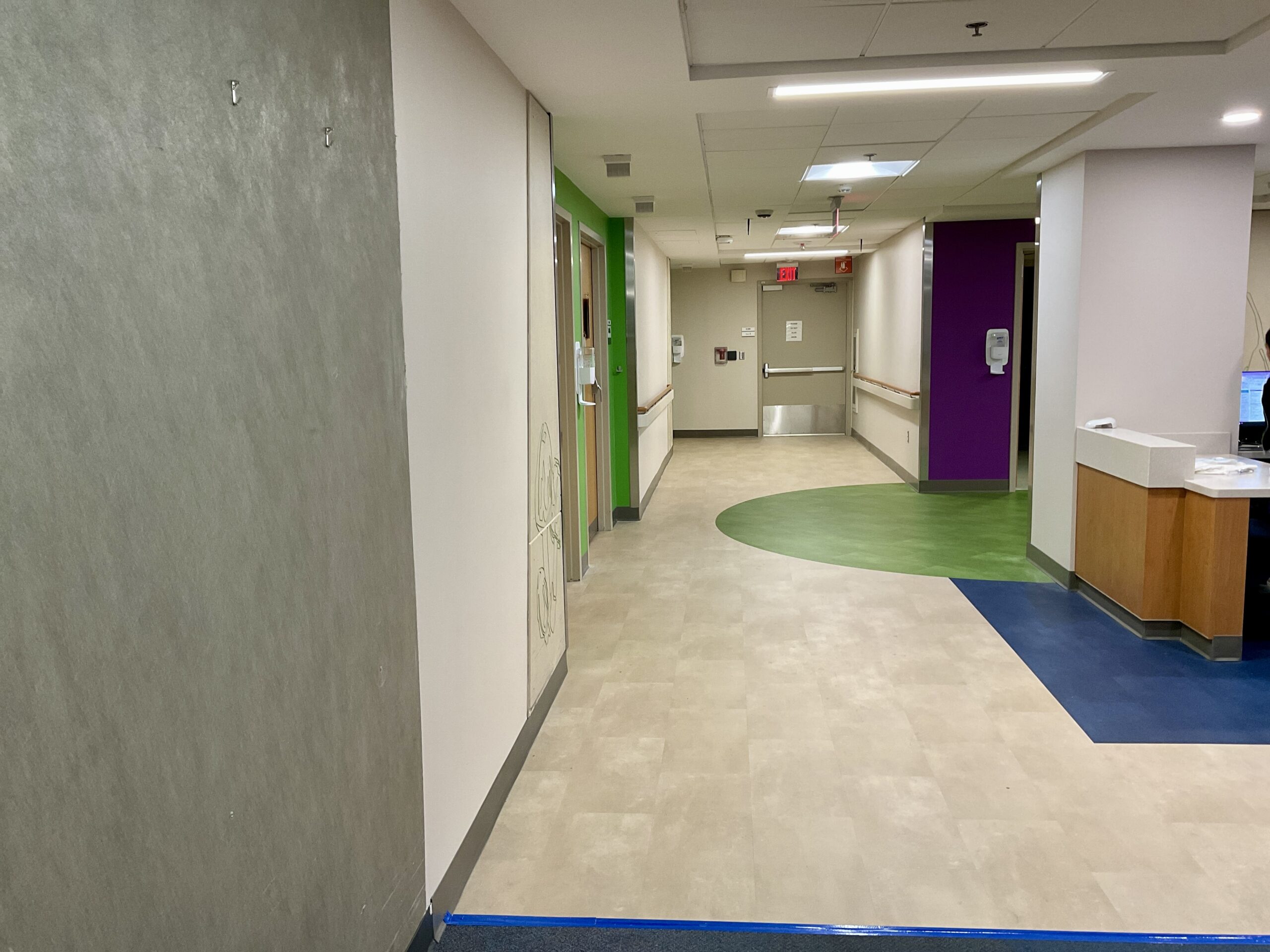 Originally designed for colorful sheet vinyl flooring with intricate patterns to run through the entire space, after collaboration with the design team, they opted to switch from sheet vinyl to Mohawk LVT in the corridor spaces. This still achieved the desired aesthetic while significantly reducing costs. This transition maintained durability, color vibrancy, and the seamless flooring solution needed, despite the phased nature of the project. Over 5,000lf of Johnsonite base was installed, alongside Daltile ceramic tile finishes in multiple restroom areas, ensuring a cohesive look and long-lasting quality across various hospital zones.