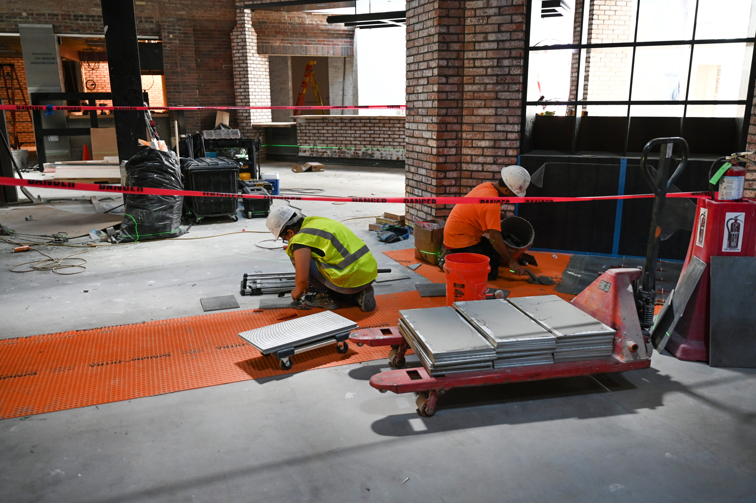 Beyond the carpet design, the project required a high level of technical precision across multiple flooring applications. Extensive brickwork installations demanded dedicated crews and exacting attention to detail, while large-format tile was installed in main entryways and throughout the sports betting rooms to create clean transitions and a sense of arrival. With multiple materials, substrates, and installation methods involved, Anytime Flooring carefully selected the appropriate products and procedures to ensure long-term durability and performance. The result is a cohesive, visually striking flooring package that supports Bally’s brand presence, enhances the guest experience, and is built to perform well into the future—making this project one the Anytime team is exceptionally proud of.