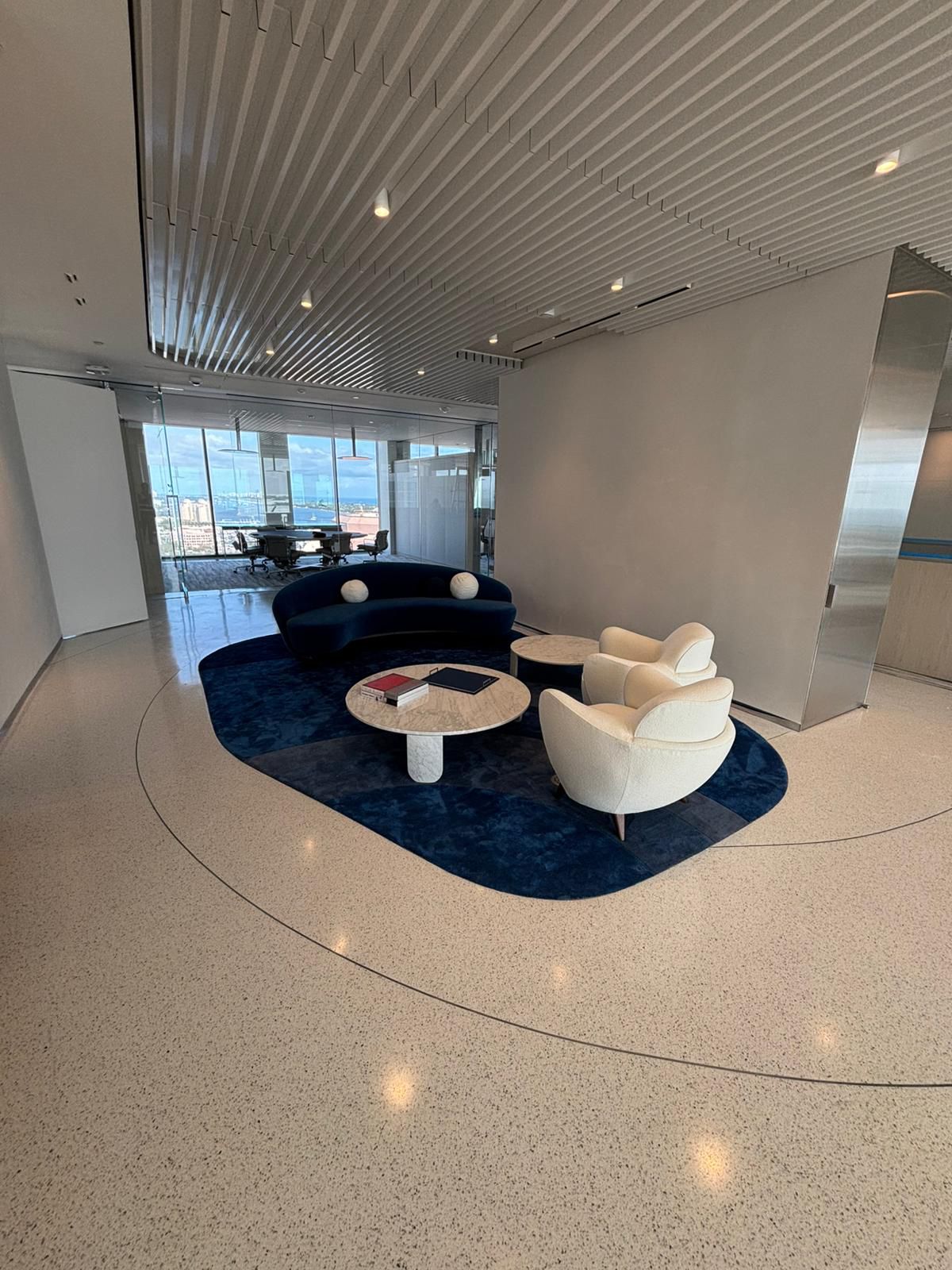 Installation of Jerusalem Stone on Walls, Wood Flooring, Terrazo and Carpet in a Class A Building on the 22nd Floor. This project presented some of the most challenging job conditions, requiring exceptional logistical planning, adaptability, and efficiency. One of the primary obstacles was the limited accessibility for the backsplash installation, which demanded meticulous coordination to ensure precision in execution despite space constraints.