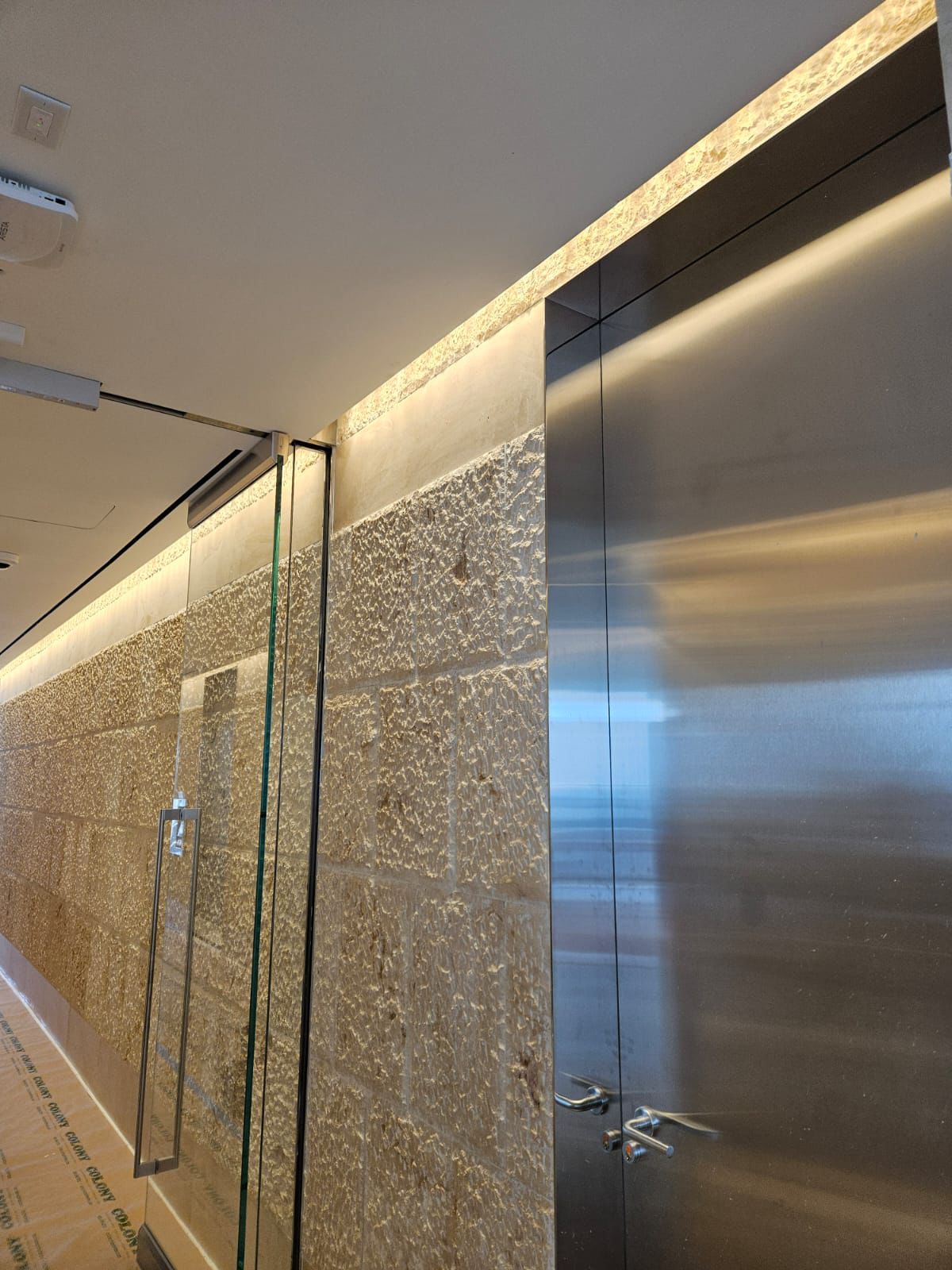 The installation of Jerusalem stone with anchors posed an even greater challenge along with the metered edges, as it took place on the fully occupied 22nd floor. Given the weight and fragility of the material, all cutting had to be conducted on the 11th floor, necessitating a labor-intensive and carefully orchestrated process to transport the pre-cut stone to its final destination without compromising quality or safety.