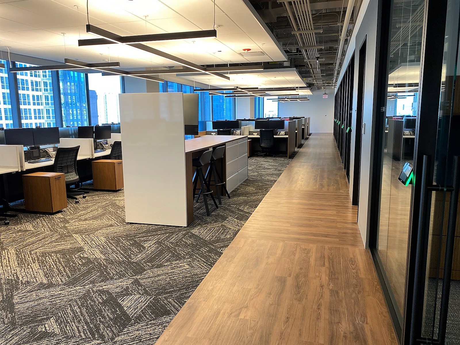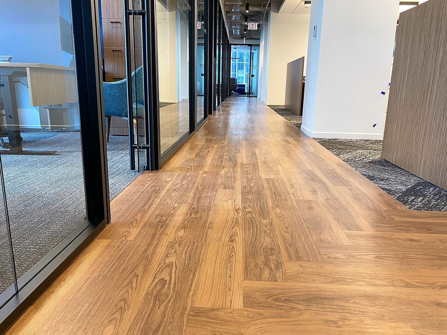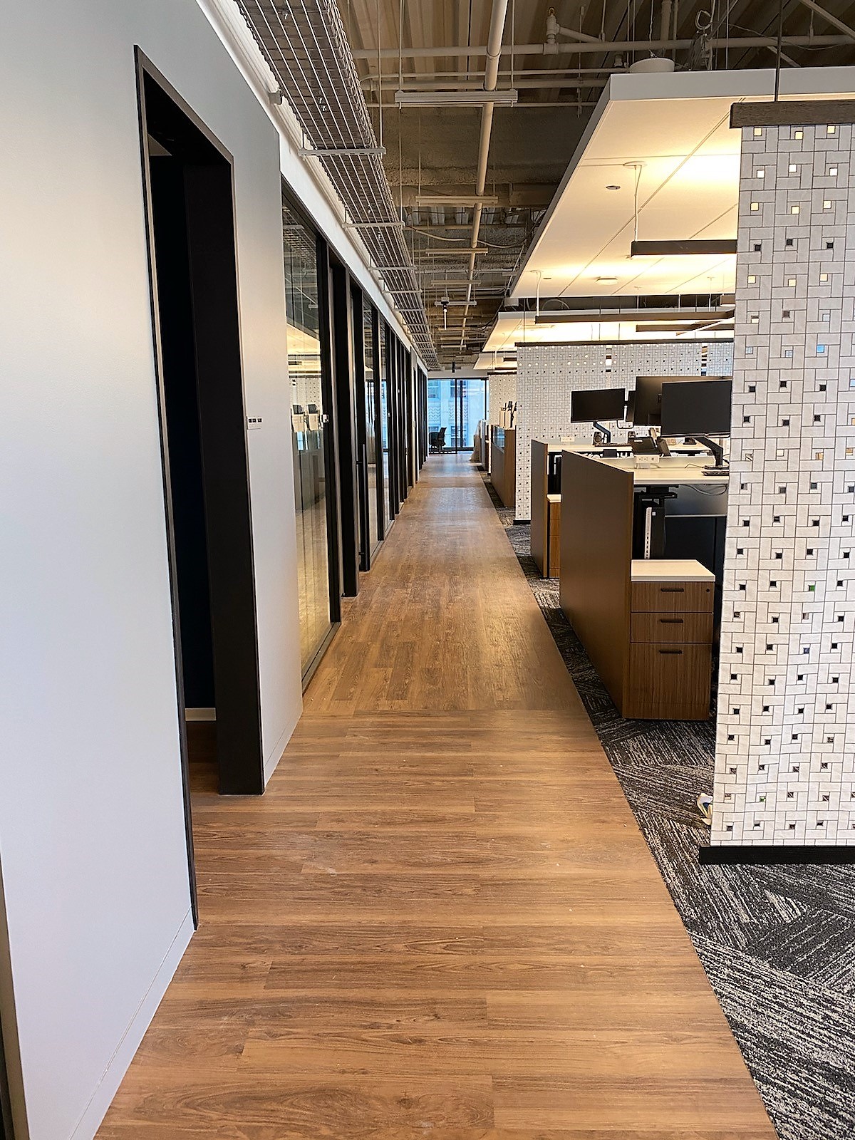 Even before discovering the obstacles 2020 would bring, we knew the original schedule for this job was aggressive to finish all of the work by the end of the year. Our plan was to complete thirteen floors of the building by starting on the 6th floor and then working our way up the stack, two half floors at a time, with mitigation and leveling. However, COVID-19 hit and caused a two week shut down. That shut down turned into a “soft start” with limited trades being allowed into the building. That delay required us to mitigate and level five floors all at once to get back on track. Once all trades were allowed back on site, we had to adapt and create a new schedule to work around the large amount of people on site. This new schedule had us installing four half floors of resilient in a day and if we were installing carpet that day, we would basically be installing four full floors at once. The sequence of floors also got switched on us during the adaptive scheduling and the GC surprised us by adding four more full floors to our scope.