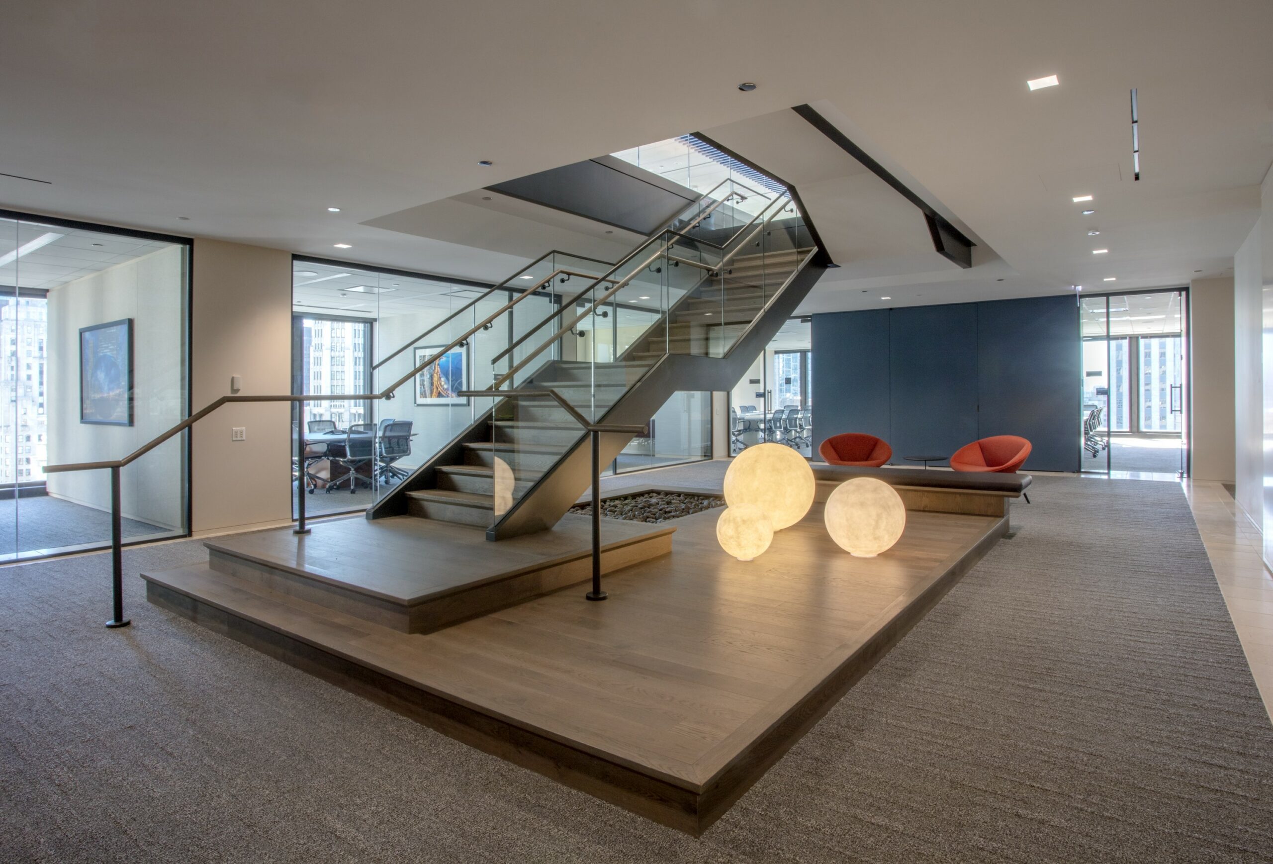 Key design features include a monumental stairway, crafted with steel framing and wood cladding, which serves as both a visual and functional connection between the floors. This central feature is complemented by rich wood flooring throughout the office. Additionally, over 3,000 square yards of Bentley carpet was installed, contributing to the space’s comfort and elegance.