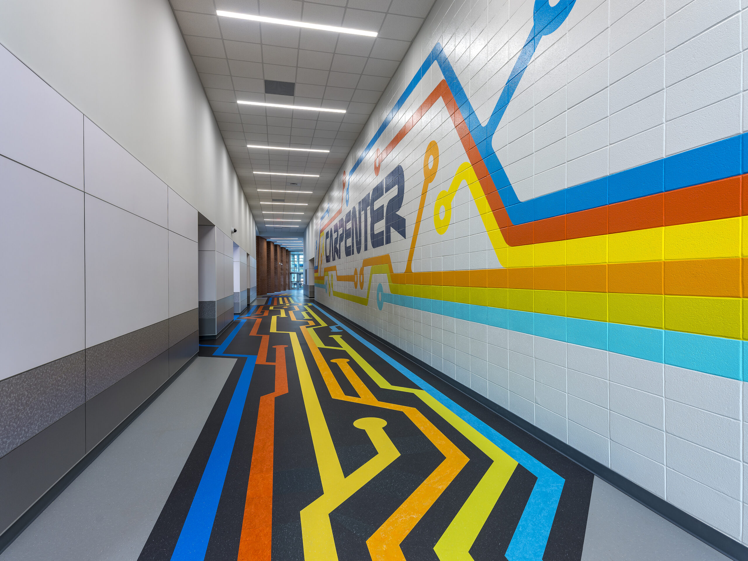 Carpenter Elementary was designed around the demanding needs of younger school children with brilliant color ways. Each color is actually a pathway to the next adventure for that particular grade. By following your grades color on the floor, it allows the students to locate their next destination easily and at the same time engaging their imagination with a vibrant colorful display. Our estimation & project management teams were able to make sure the designer’s intent was actualized by recommending cost saving items in areas to keep the project under the proposed budget.