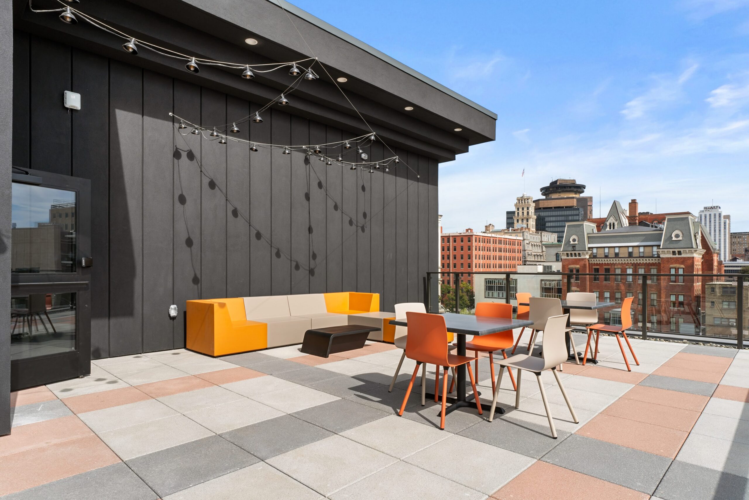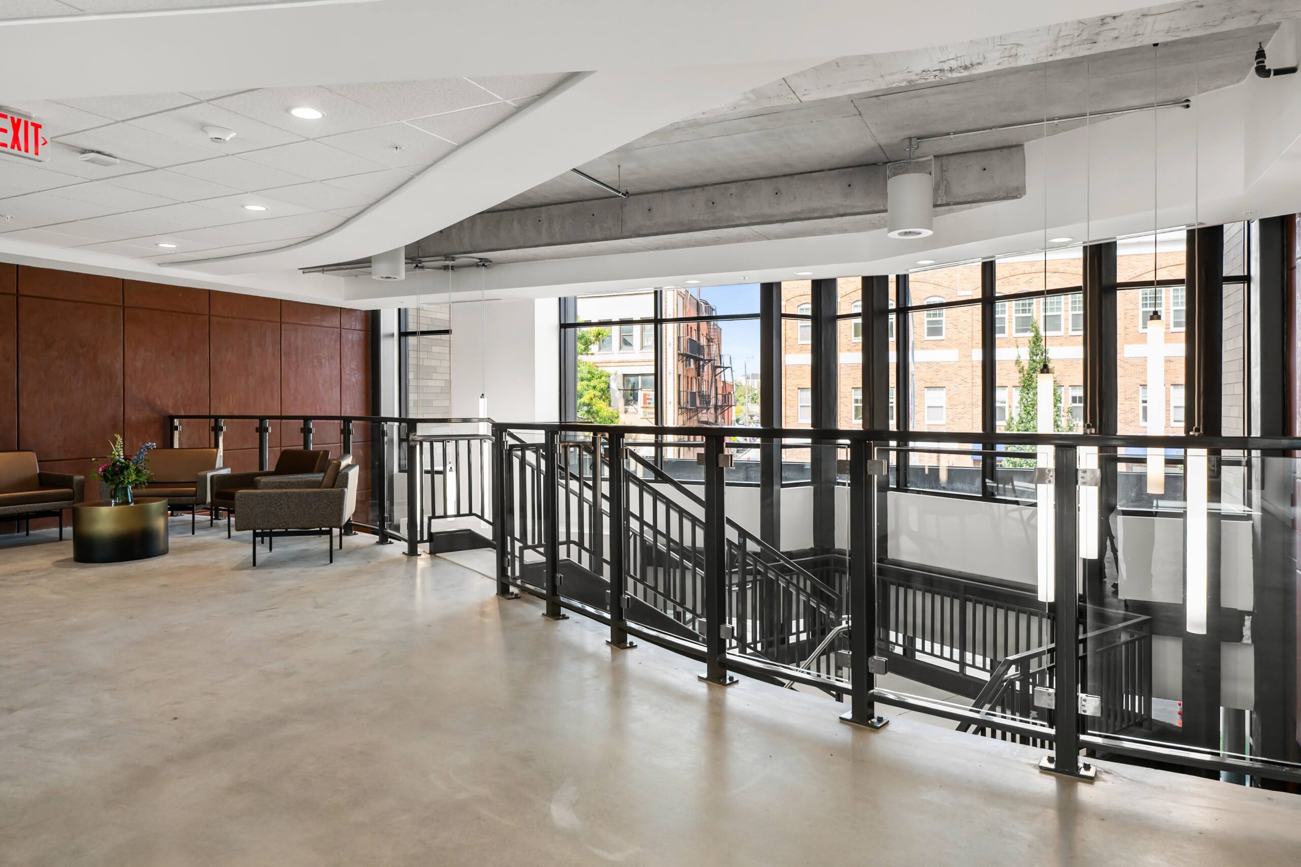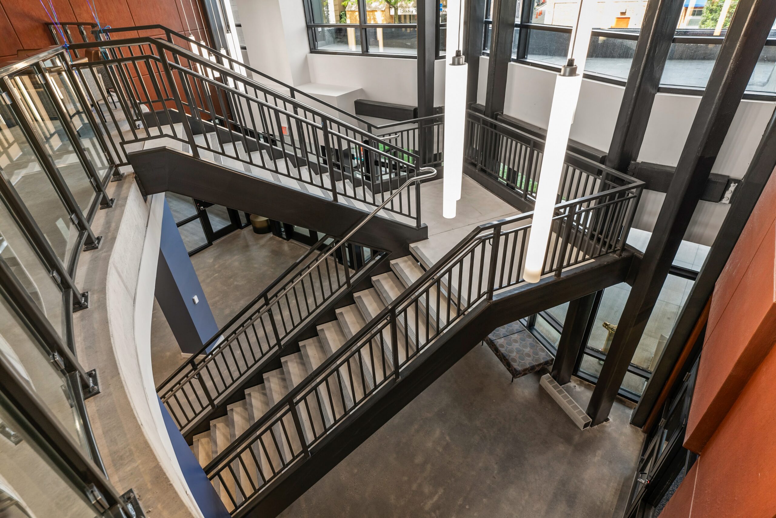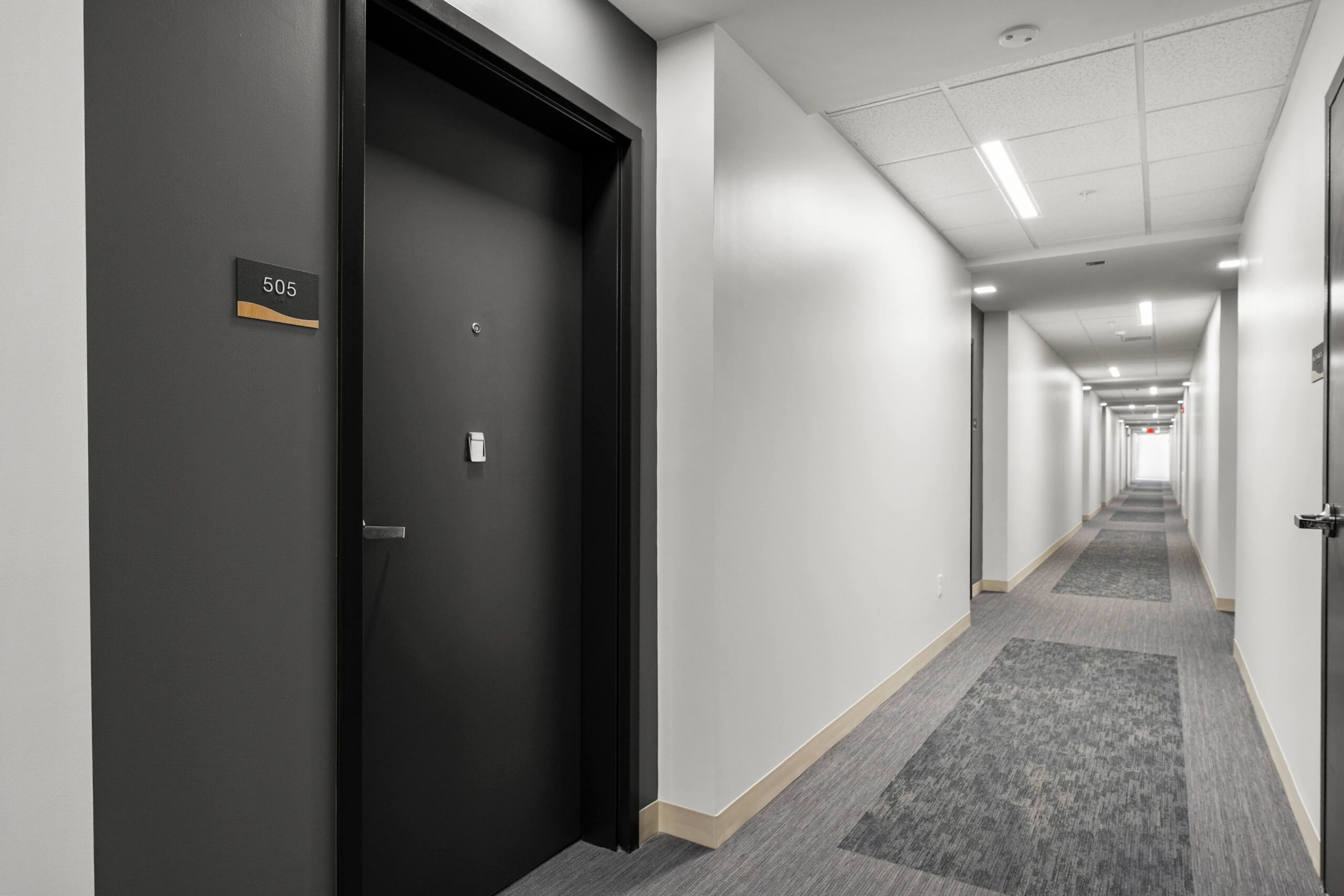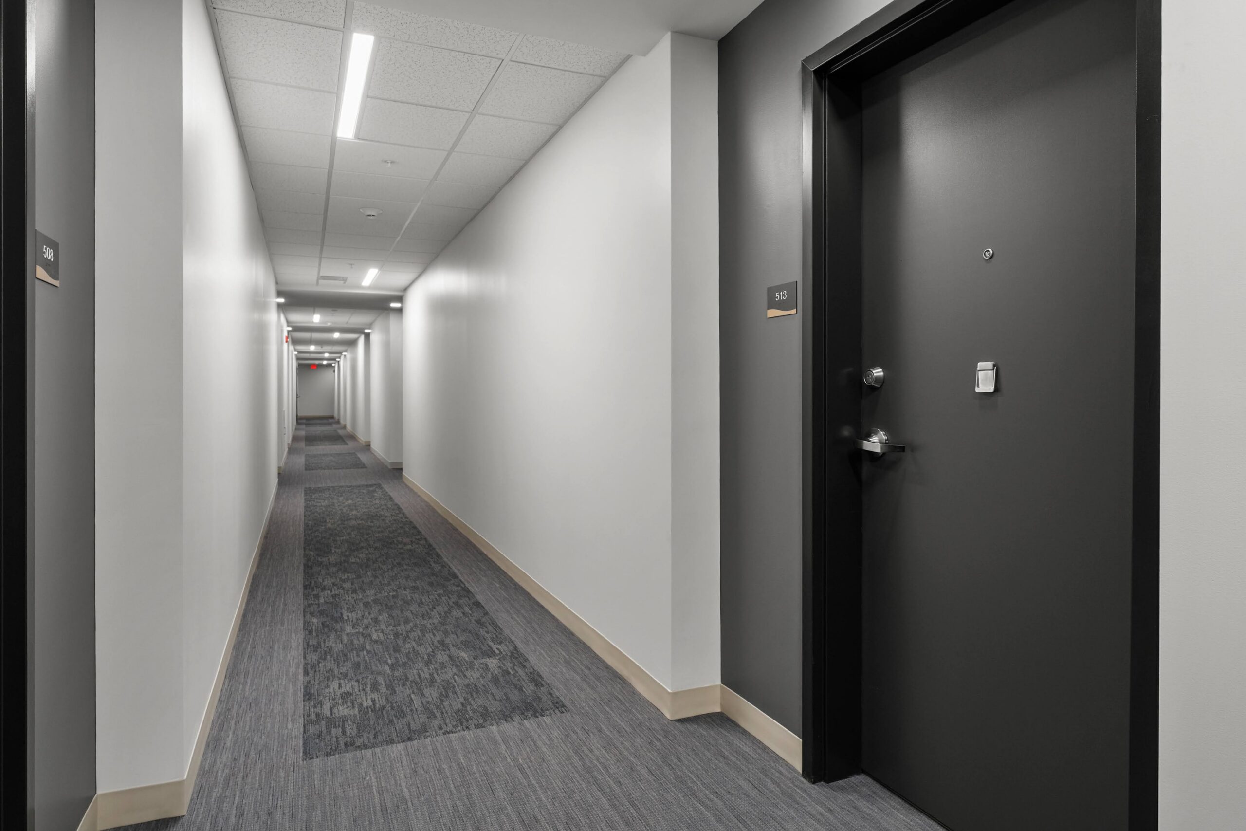 To elevate the visual impact of the common spaces, the corridors were finished with J&J Kinetex in a vibrant, engaging pattern that brings energy and movement to the project’s circulation paths. High‑traffic zones and restrooms feature Daltile ceramic for long‑term resilience, while polished concrete and Roppe wall base and stair treads add a clean, contemporary finish throughout the interior. The result is a thoughtfully executed flooring package that marries value engineering with design innovation—delivering miles of durable, visually compelling surfaces that reflect a truly maximized budget without sacrificing style.