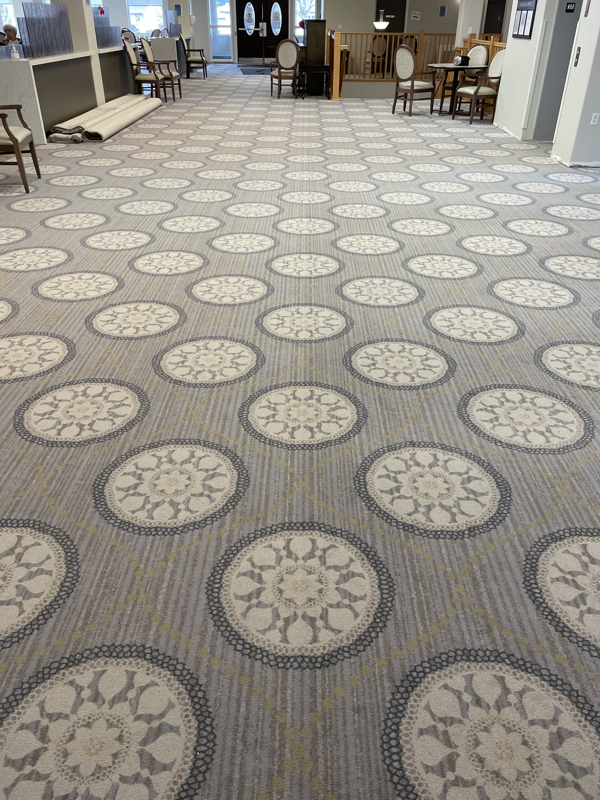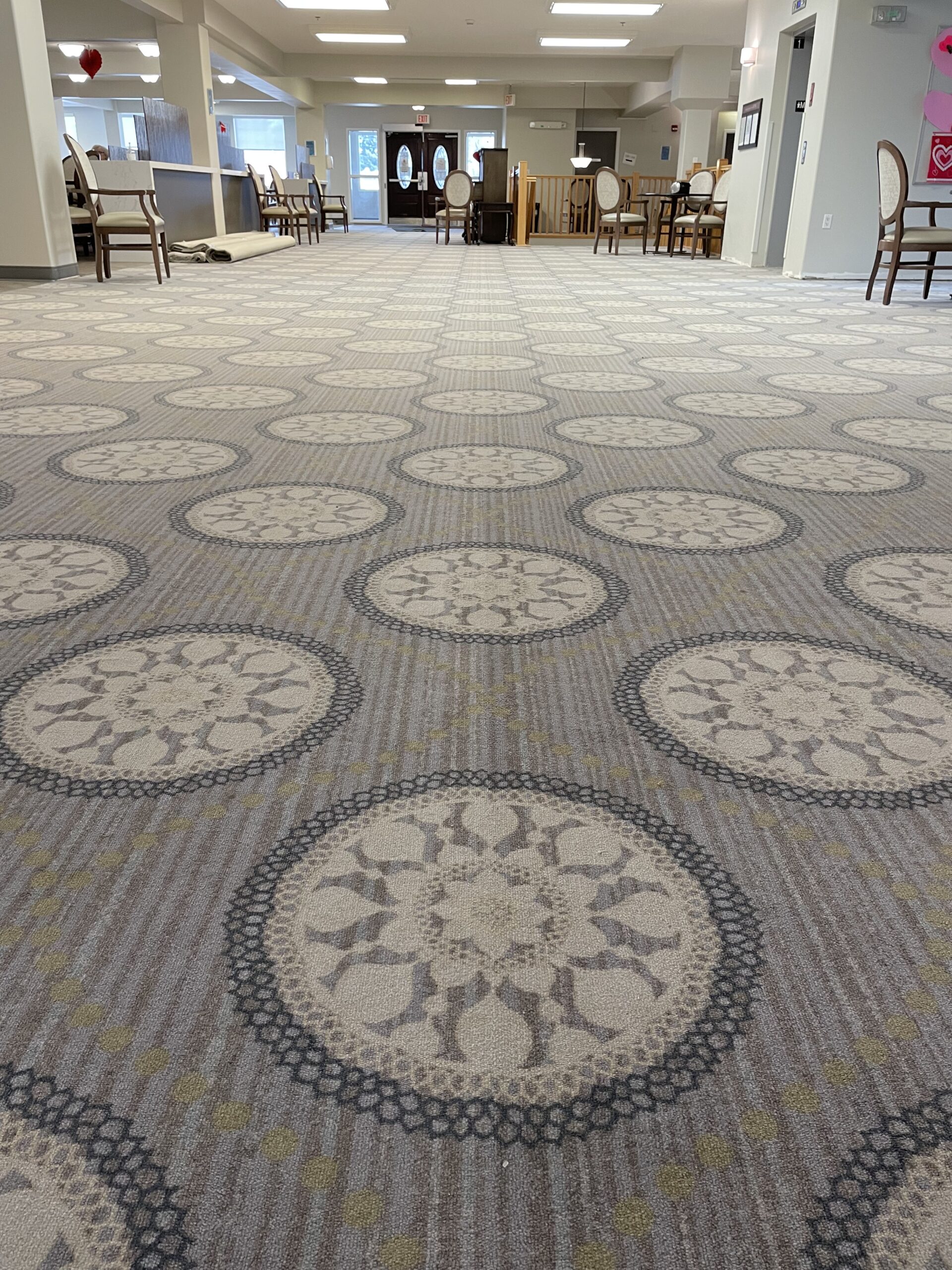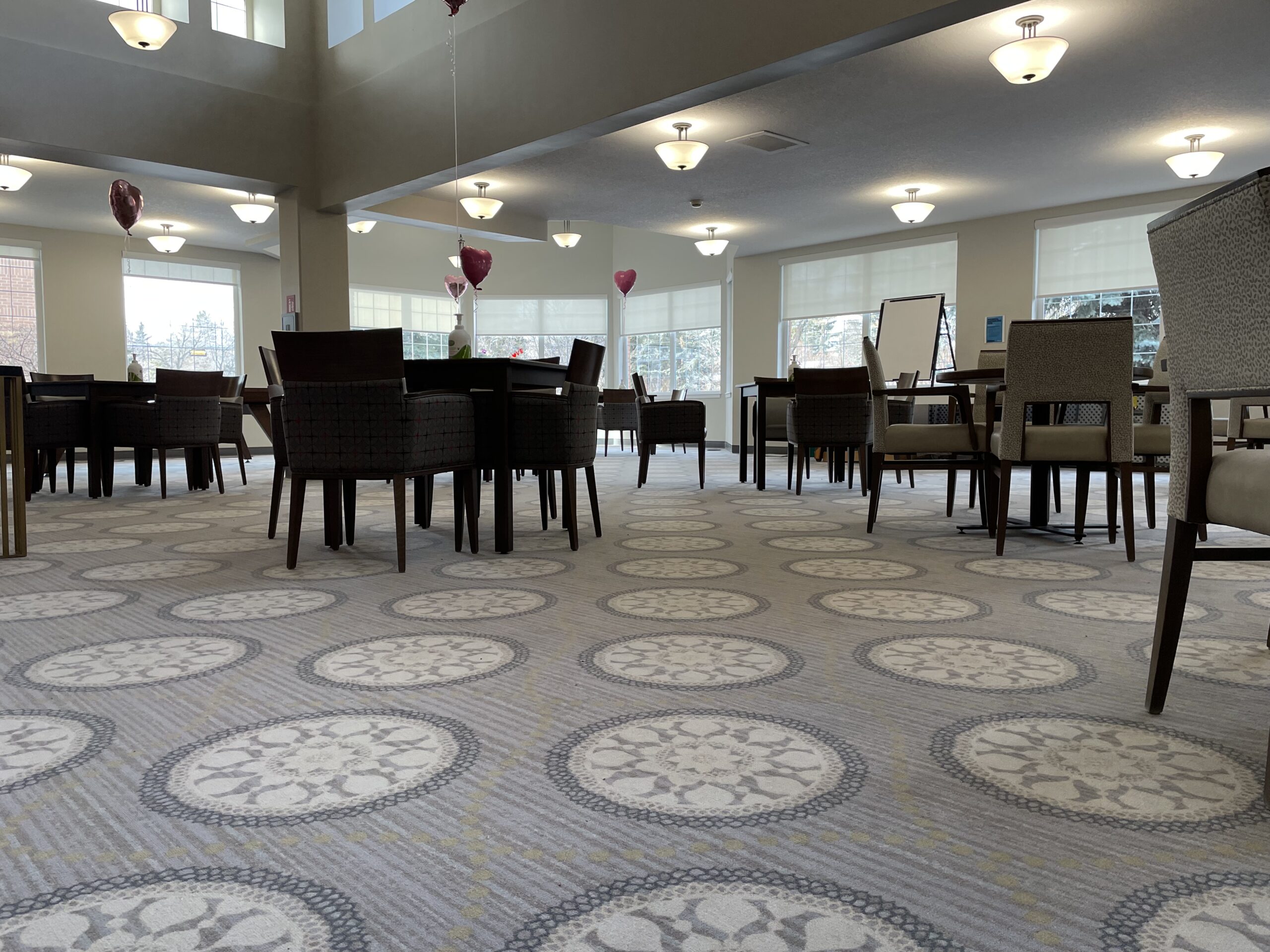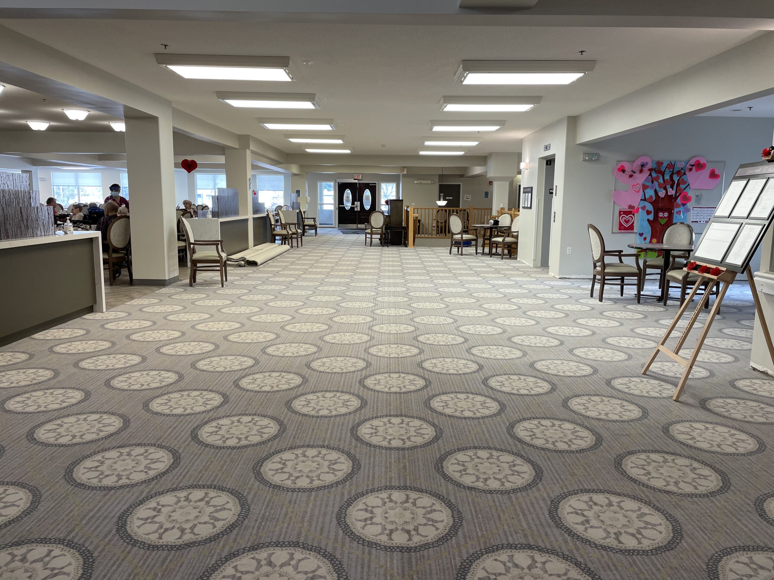 The tired appearance of this facility was in dire need of an update. The old ceramic tile was cracked in many places and the old carpet was dated and worn, fraying at the seams. Patterned Durkan Hospitality carpet from Mohawk was selected along with Tarkett Perceptions 4.5″ cove base to cover wall damage from removing the older 4″ wood base. Daltile ceramic tile in the servery, and Ardex GPS was used throughout for the floor prep. The update has been very well received by the residents.