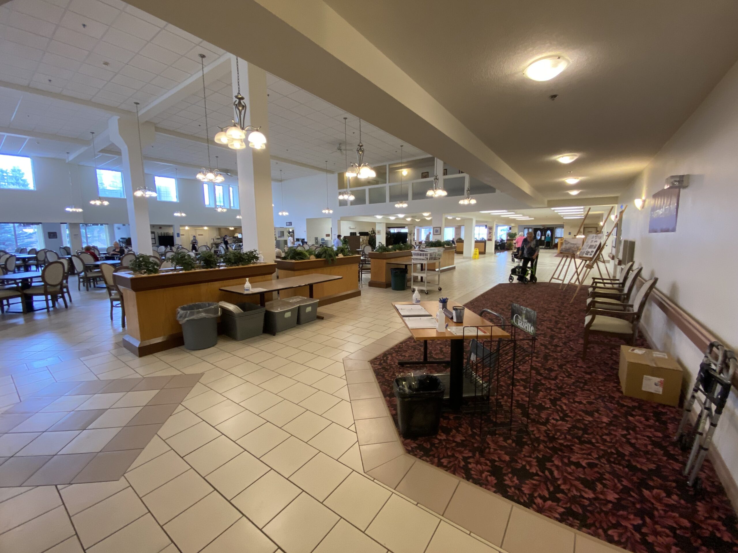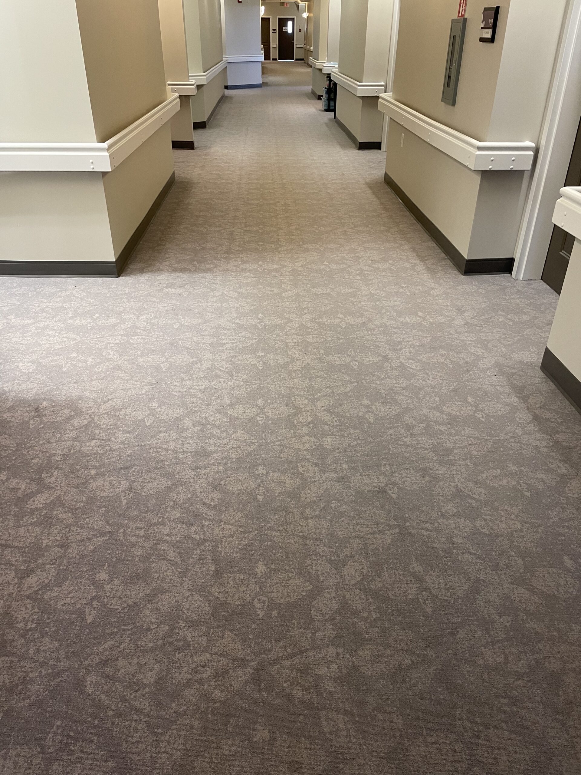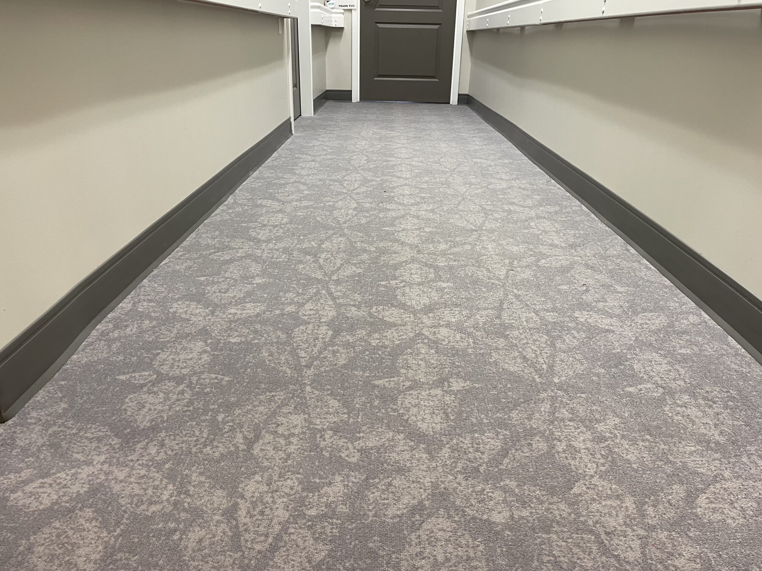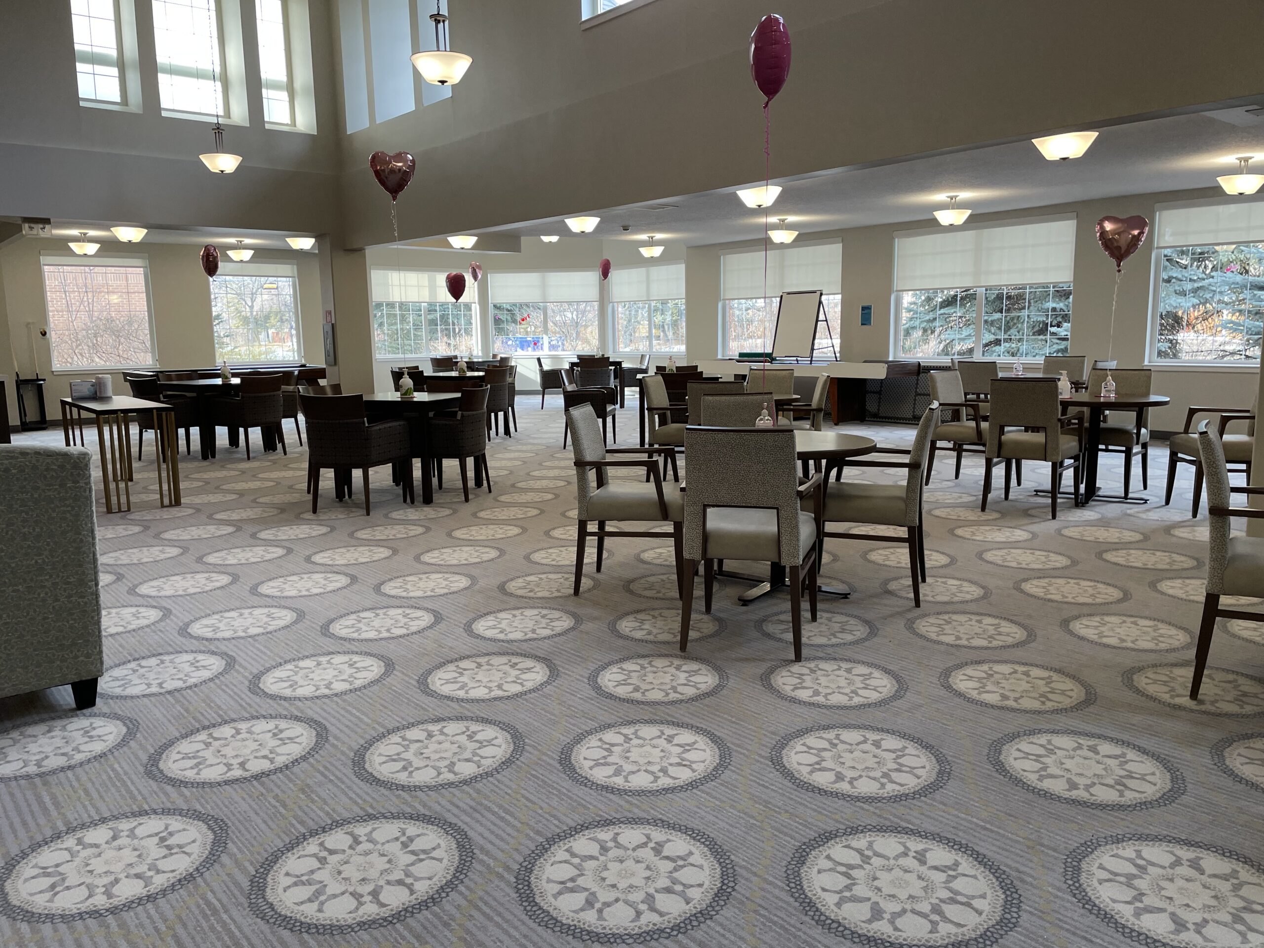 The tired appearance of this facility was in dire need of an update. The old ceramic tile was cracked in many places and the old carpet was dated and worn, fraying at the seams. Patterned Durkan Hospitality carpet from Mohawk was selected along with Tarkett Perceptions 4.5″ cove base to cover wall damage from removing the older 4″ wood base. Daltile ceramic tile in the servery, and Ardex GPS was used throughout for the floor prep. The update has been very well received by the residents.