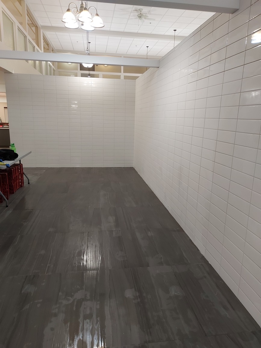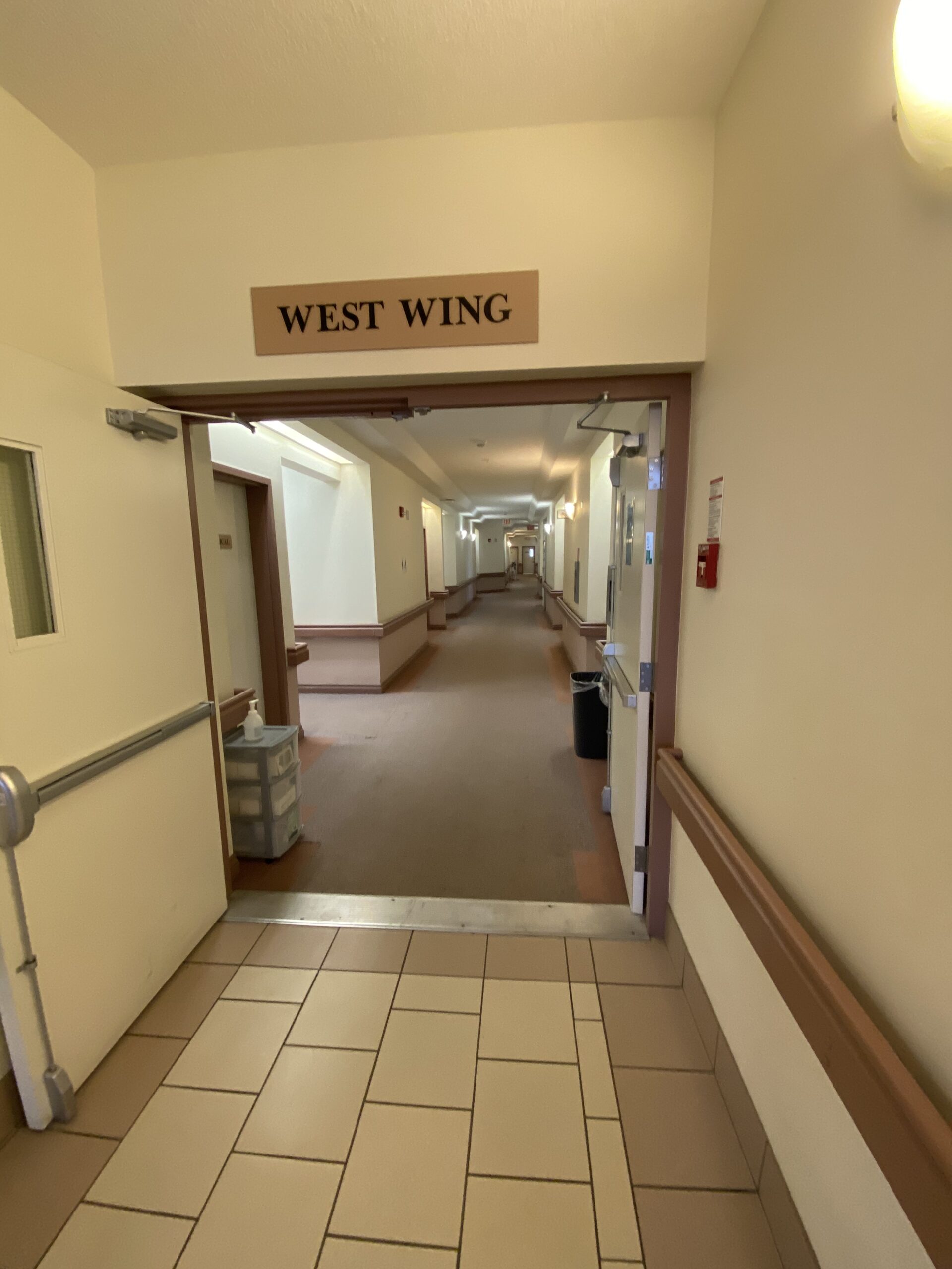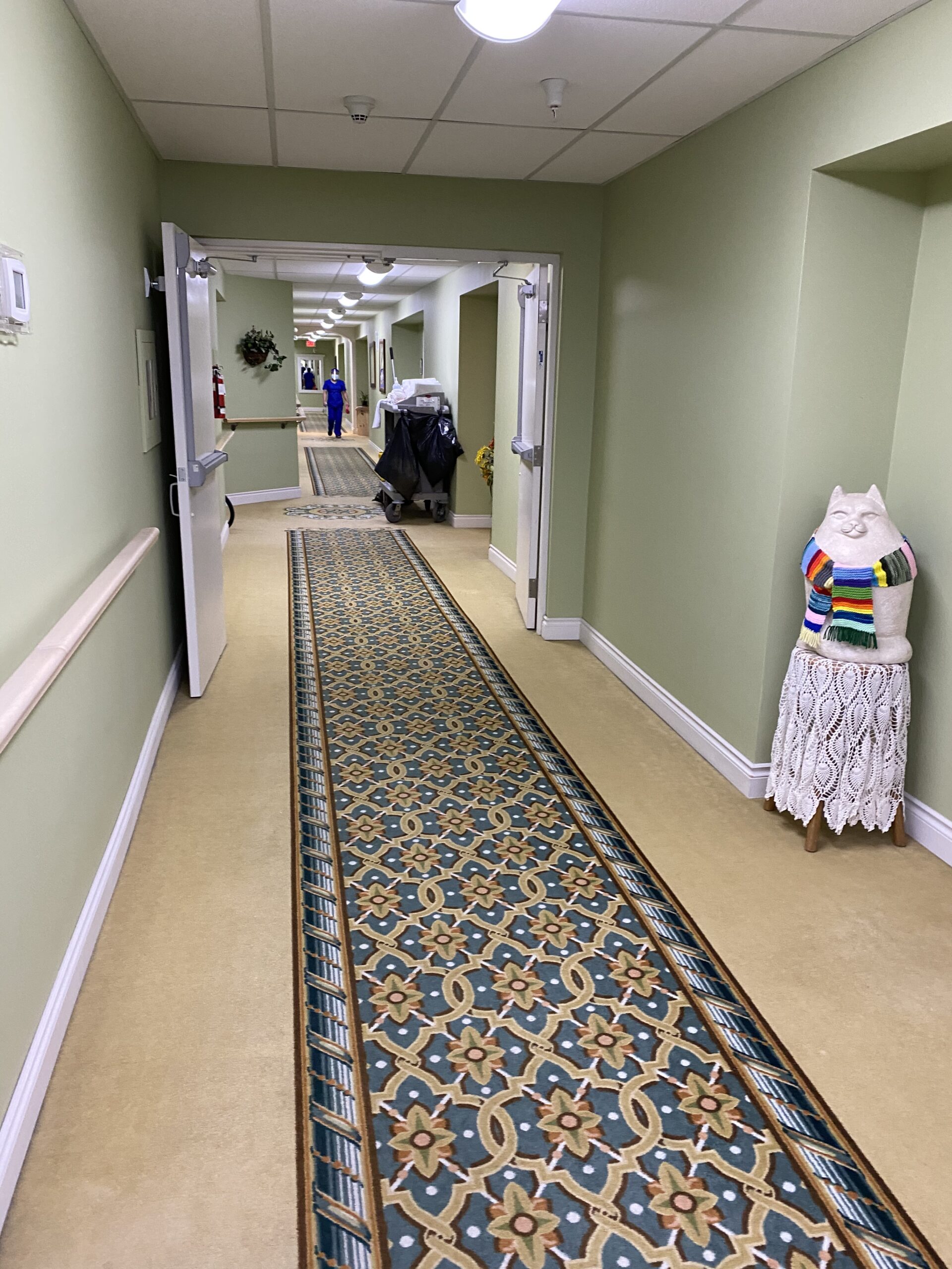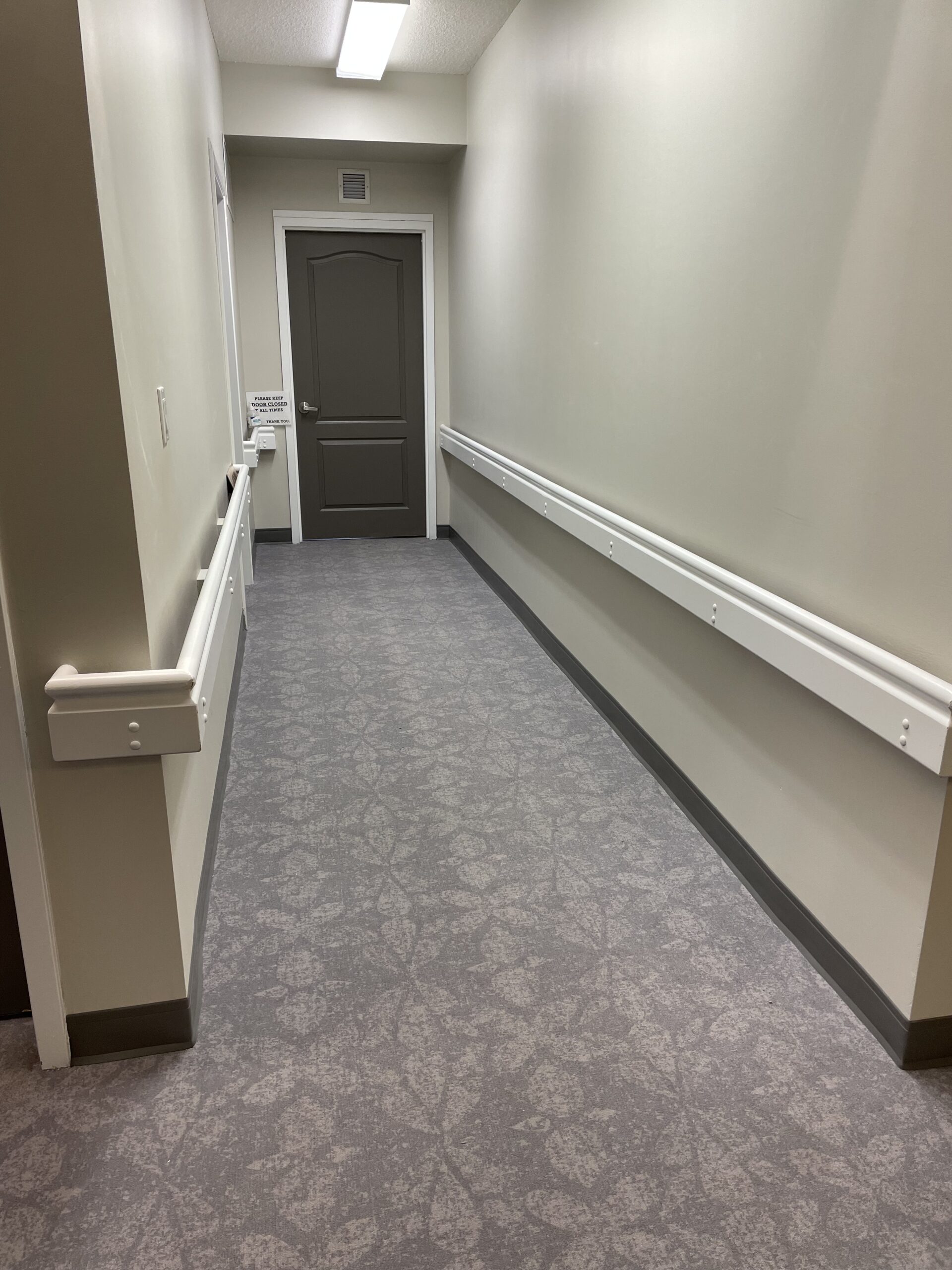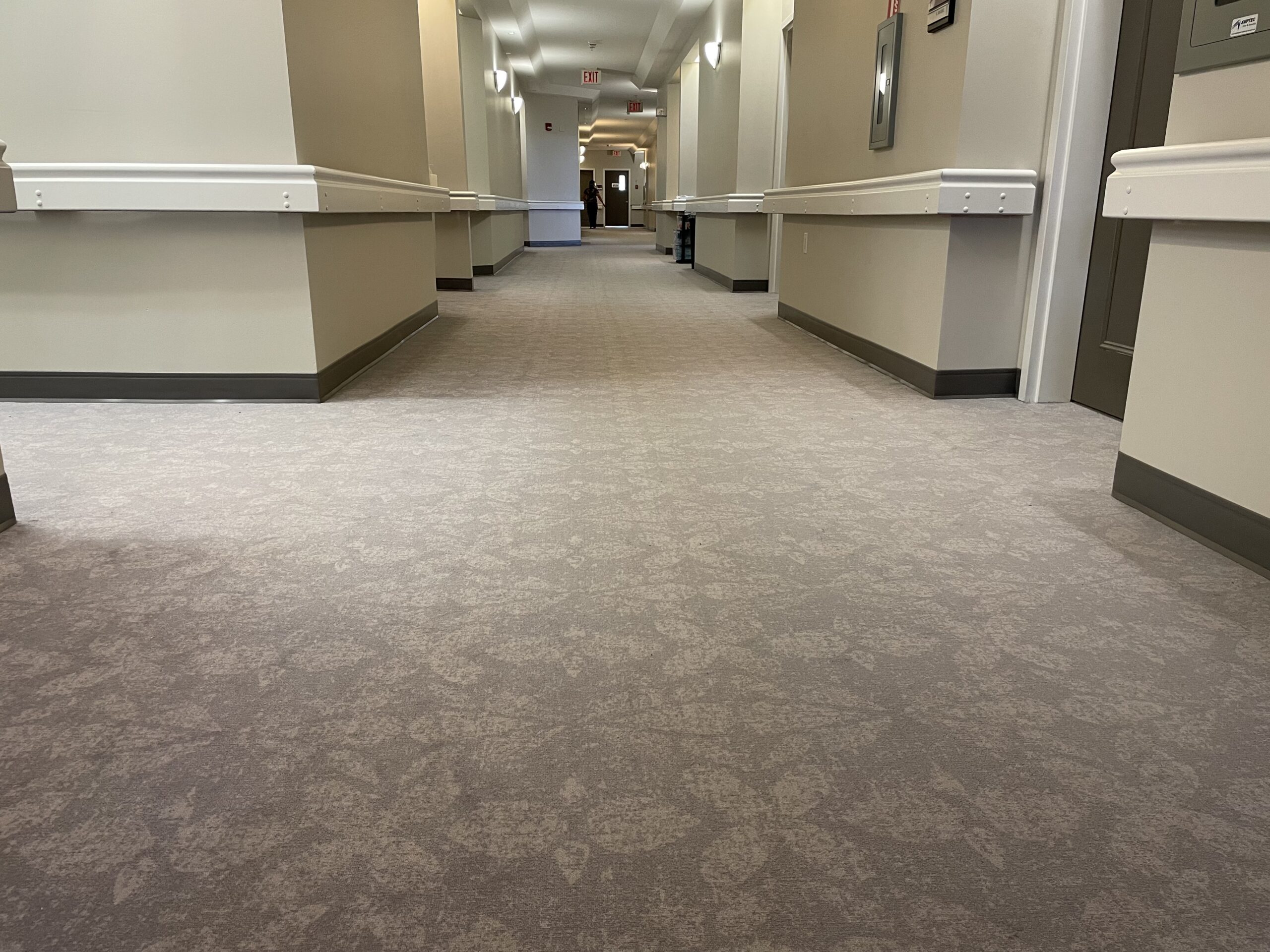 During the COVID Pandemic, our installers were required to wear masks and face shields to protect the elderly occupants of this facility, which was fully open throughout the renovation. Work had to be completed in phases, mostly at night, and turned over in short time frames in order to keep the kitchen and dining facilities open. Dust from the demolition had to be completely contained. Suite doors had to be constantly monitored and caution taped so residents would not be exposed to slip and trip hazards during the installation in the hallways, and noise had to be kept to a bare minimum as the work was performed after hours right outside the suites.