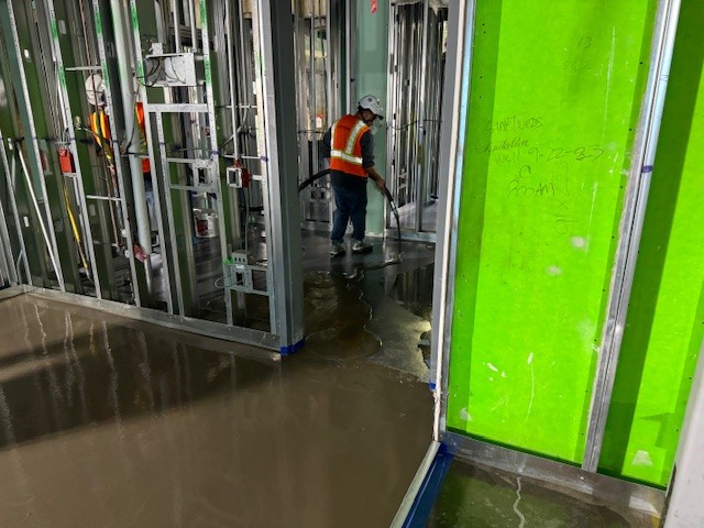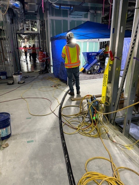 Nine stories, 330,000 square feet of medical office space. A time of concrete pour, the building experienced a massive amount of deflection caused by a decrease in the steel metal decking. Most floors throughout the building had roughly 2.5″ of out of level conditions significantly affecting not only flooring but major MEP trades as well. Signature was brought onto the project and consulted regarding what the client could utilize for subfloor conditions. Due to the amount of self leveling needed, the building would need a lightweight SLU as a traditional leveling prodiuct would have added too much weight to the concrete decks. Signature presented Mapei’s Ultraplan Lite SLU weighing only 25 lbs per bag but getting a coverage equivalent to a 50 lb bag product. Eight of the nine floors required significant leveling so Signature invested in it’s own self leveling pump – a Graco MP 40 – which could mix and pump over 3 bags per minute. We also hired a pump specialist to fly in and train our team as well as using a consulting firm to test the PSI strength of the product. In total on the project alone, Signature’s team used over 35,000 bags of Mapei Ultraplan and Ultraplan Lite. Once completed with all prep, the MEP trades could come in and perform their scope as well as finish drywall etc. Signature then completed it’s floor covering scope of installation across the 9 story building.