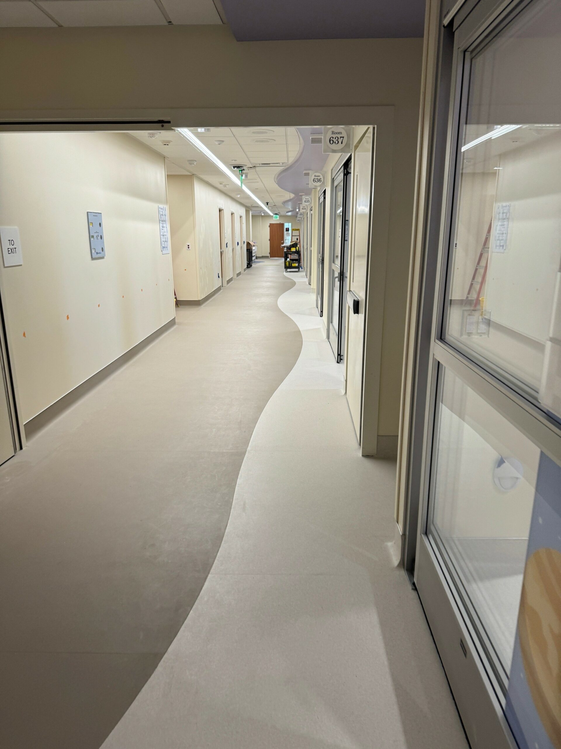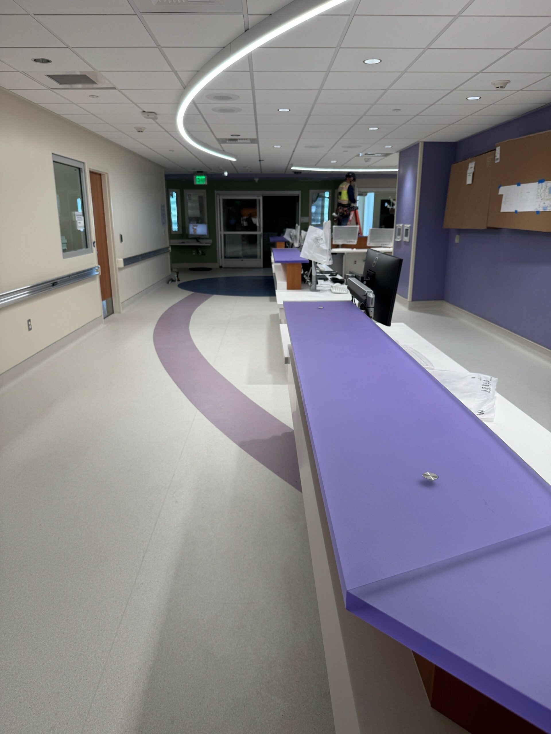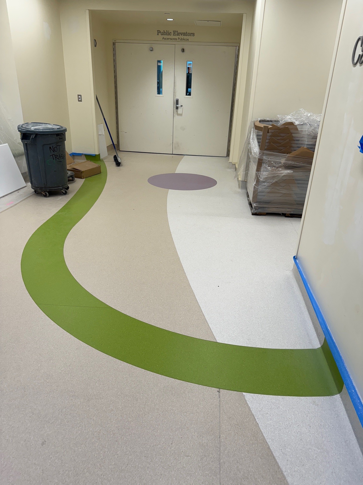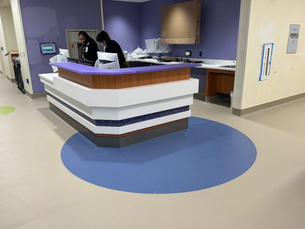 Full floor buildout of the 6th floor at CHOC Children’s Hospital in Orange County. Teamed w/ Jacobs CM and Cannon Design to continue successful relationship with the hospital and creative design needs for this pediatric intensive care unit. We successfully advise and crossed over the old Armstrong Medintech line with Mohawk’s Medella Hues and Fleck sheet vinyl to keep the campus aesthetic the same. Floor plan measured 20,000 SF and contained challenging concrete floor prep issues that were mitigated with Ardex Americas products including Ardifix, Ardex K15, Ardex K10 and Ardex SDP. Roughly 14 different colors of Mohawk sheet vinyl were used to create the floor patterning and designs. Completing the look and design were Patcraft Carpet Tile and LVT.