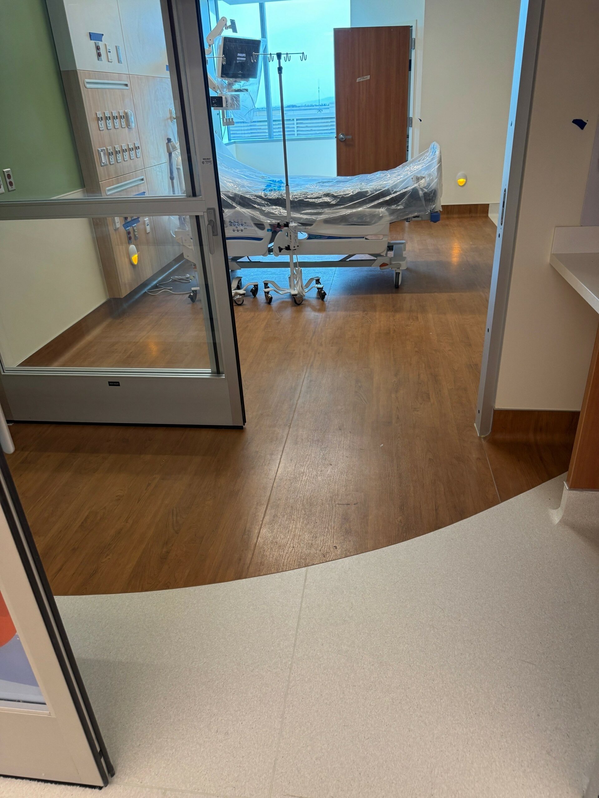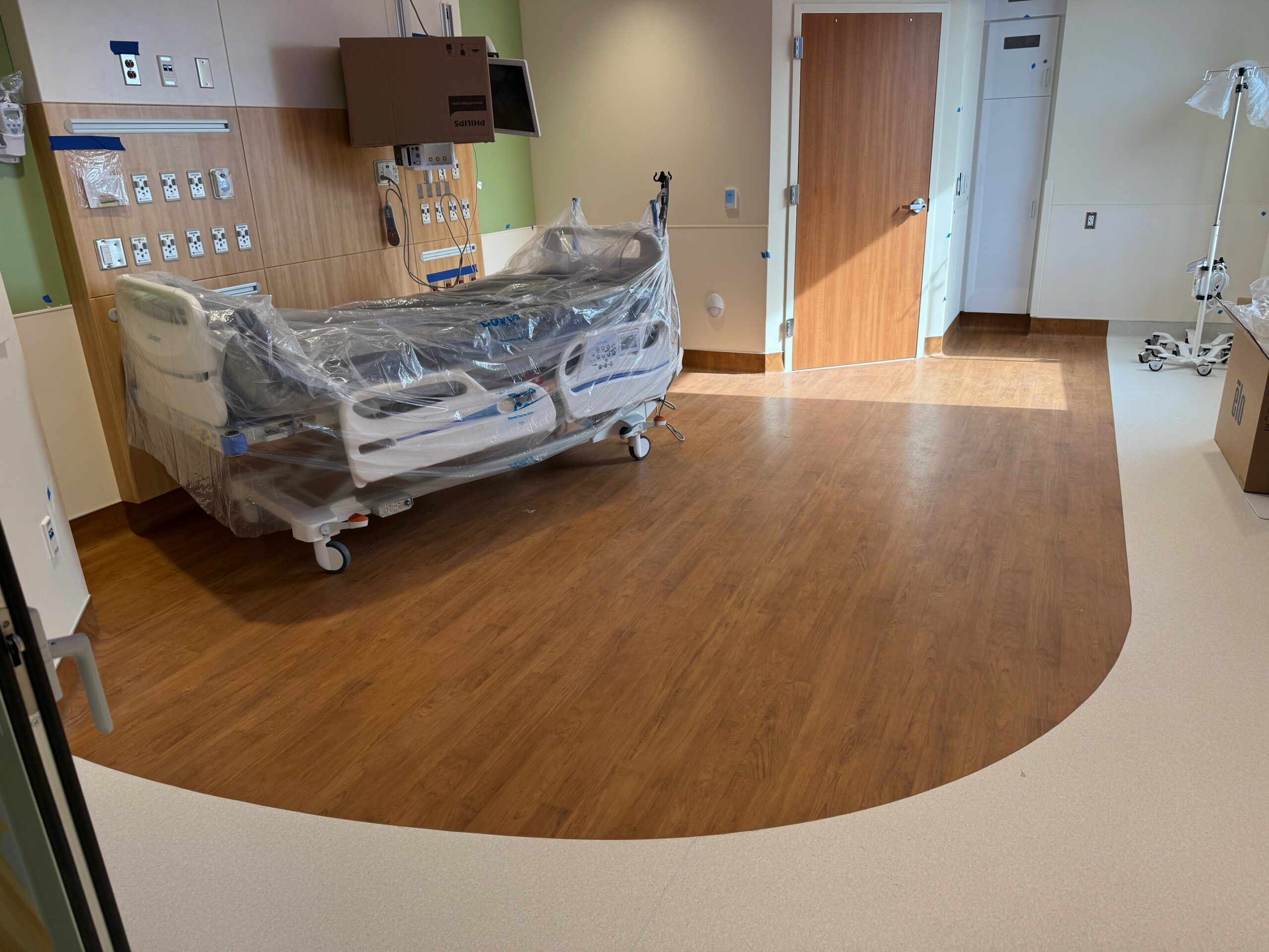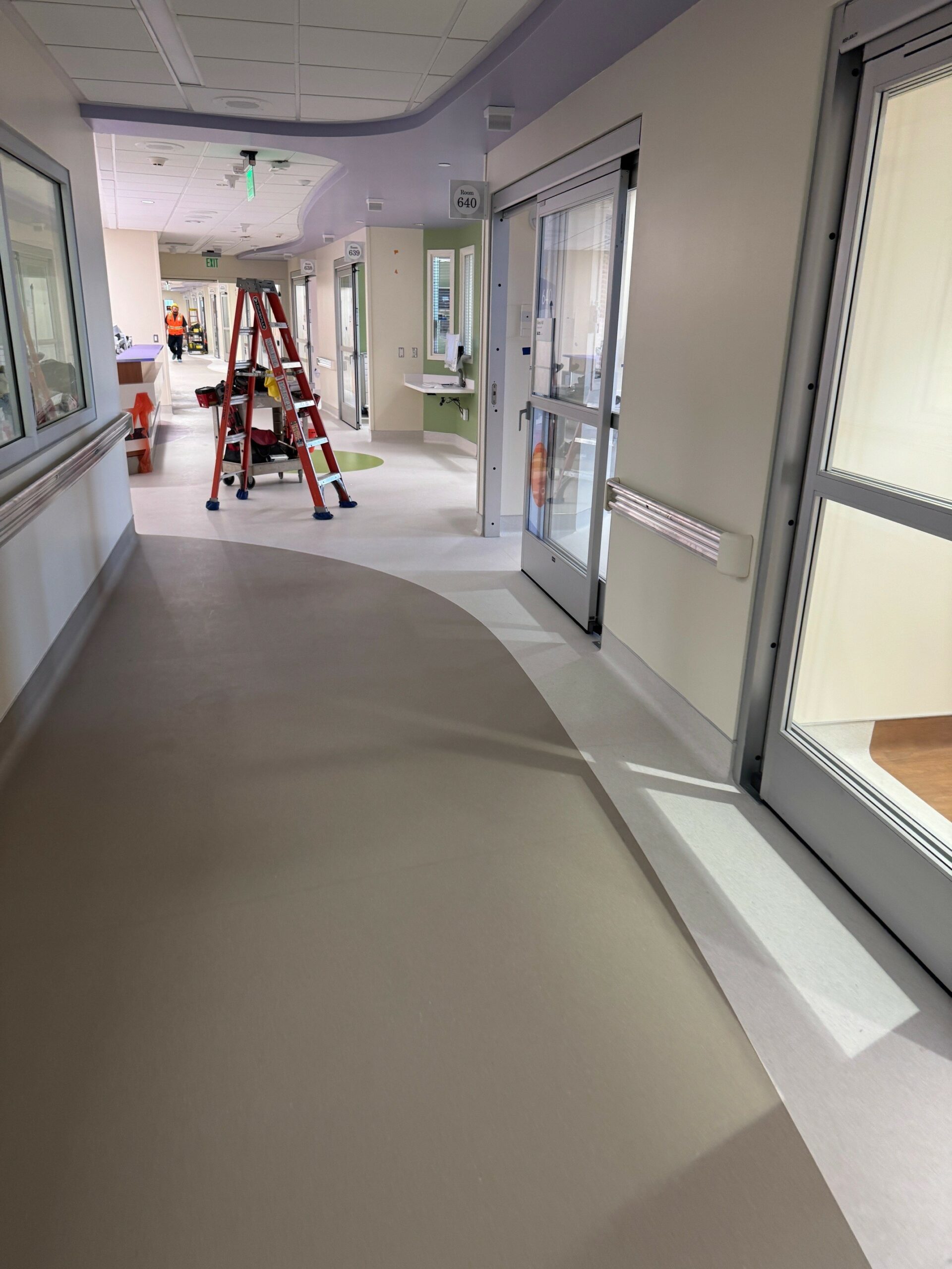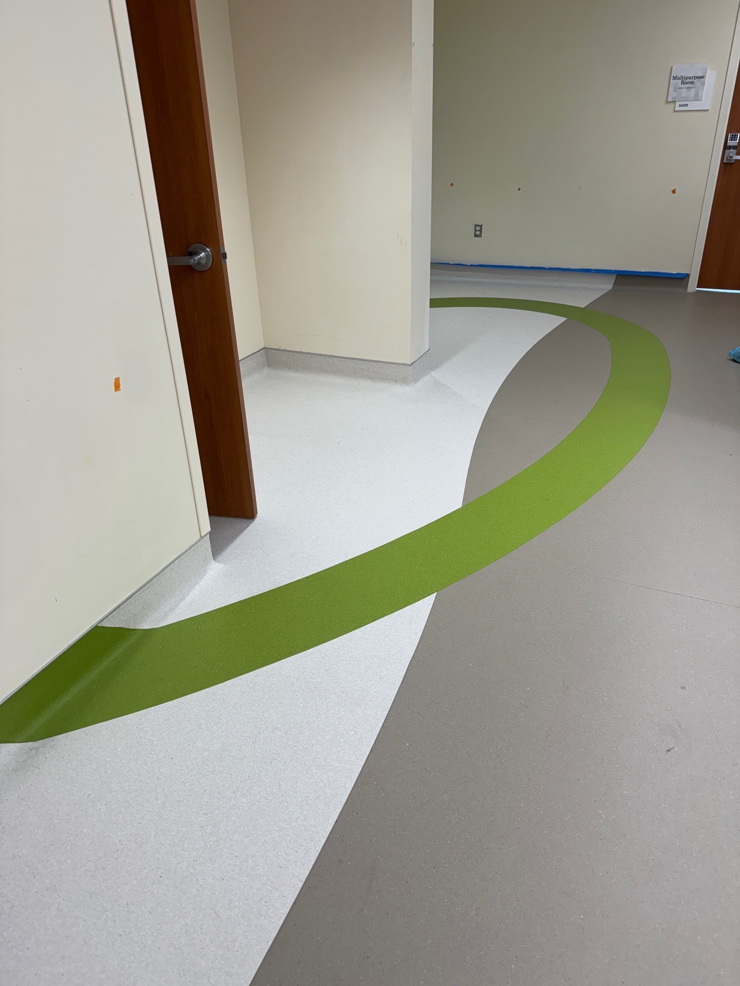 Full floor buildout of the 6th floor at CHOC Children’s Hospital in Orange County. Teamed w/ Jacobs CM and Cannon Design to continue successful relationship with the hospital and creative design needs for this pediatric intensive care unit. We successfully advise and crossed over the old Armstrong Medintech line with Mohawk’s Medella Hues and Fleck sheet vinyl to keep the campus aesthetic the same. Floor plan measured 20,000 SF and contained challenging concrete floor prep issues that were mitigated with Ardex Americas products including Ardifix, Ardex K15, Ardex K10 and Ardex SDP. Roughly 14 different colors of Mohawk sheet vinyl were used to create the floor patterning and designs. Completing the look and design were Patcraft Carpet Tile and LVT.