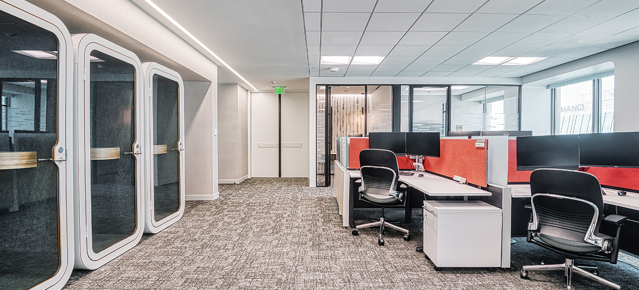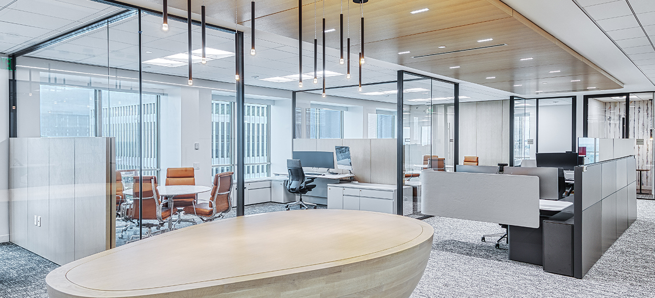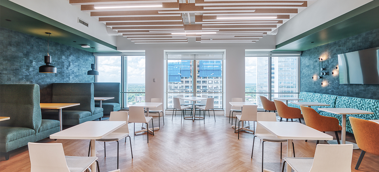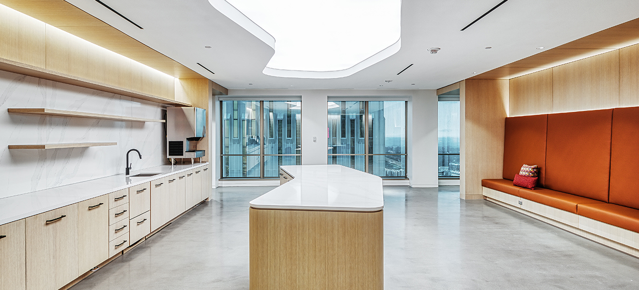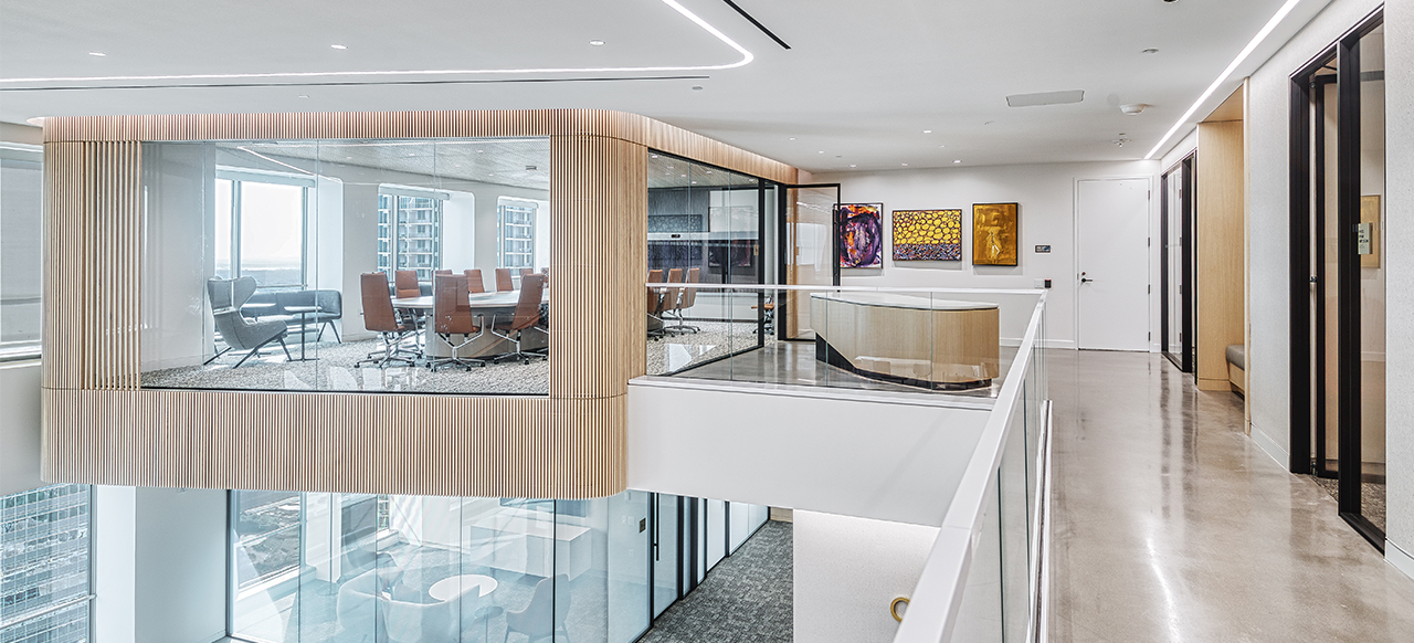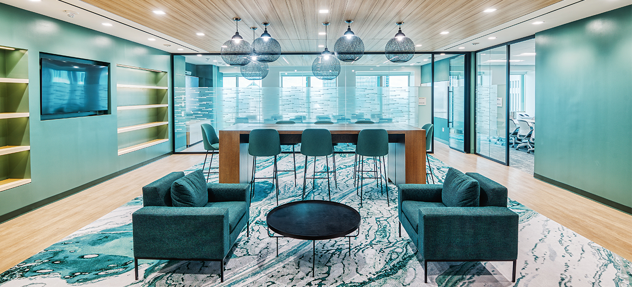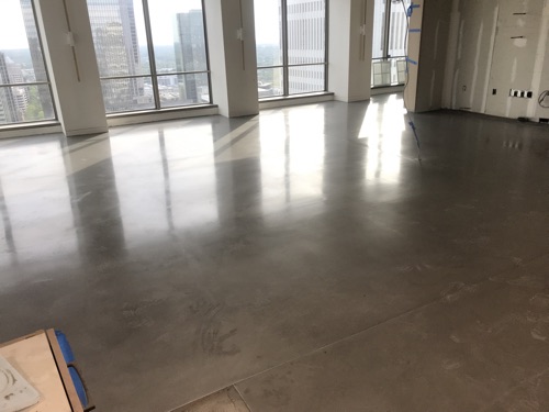 Given that this was a renovated space in a highrise building, with an elevated slab. Garmon & Company installed Tarkett carpet tiles in the open office areas and office spaces. For the concrete areas, we used Ardex polishable concrete toppings to provide the look and feel of the design intent. Finishing touches with minimal transitions and Johnsonite – Tarkett wall base.