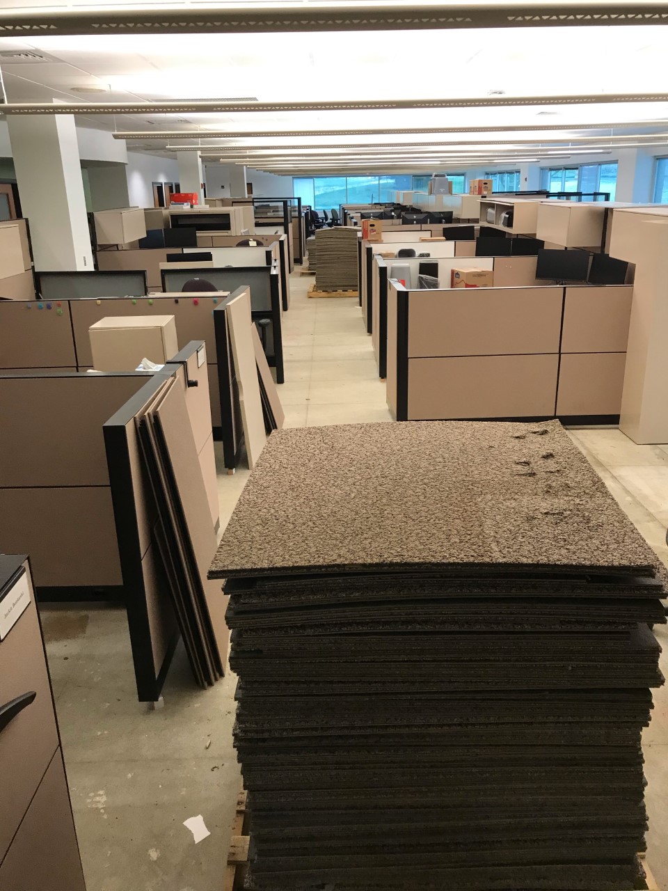 •Supply and Install 9,980.98 of five different colors of 13×36 Mohawk Group carpet tiles in specified pattern under systems furniture, standard office furniture, and conference room tables