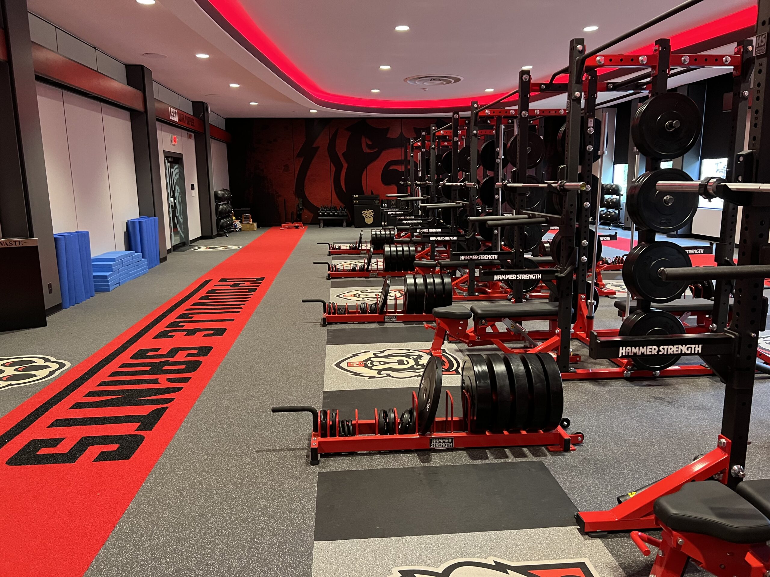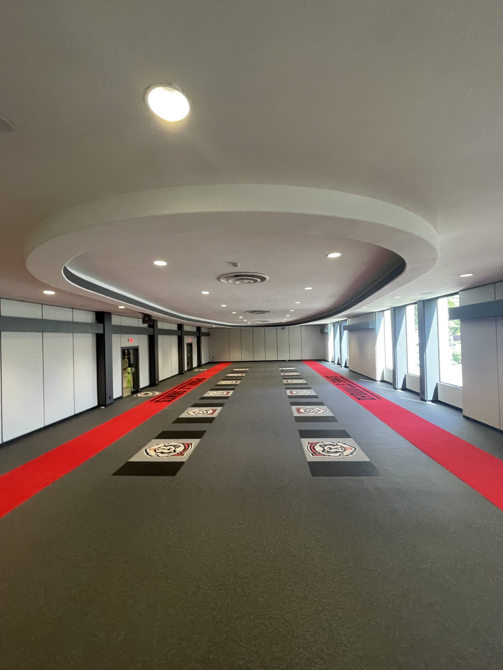 The new gym floor boasts a spirited and modern design, with high-end logos and intricate details that add an extra touch of style and elegance. The logos are carefully crafted, featuring vibrant colors and crisp lines, making them instantly recognizable. The flooring is durable and able to withstand heavy activity traffic, making it the perfect choice for our client. The flooring surface provides a comfortable feel for athletes, allowing for seamless movements and maximum performance. The new gym floor is sure to impress visitors and make a statement about the quality of the university’s facilities