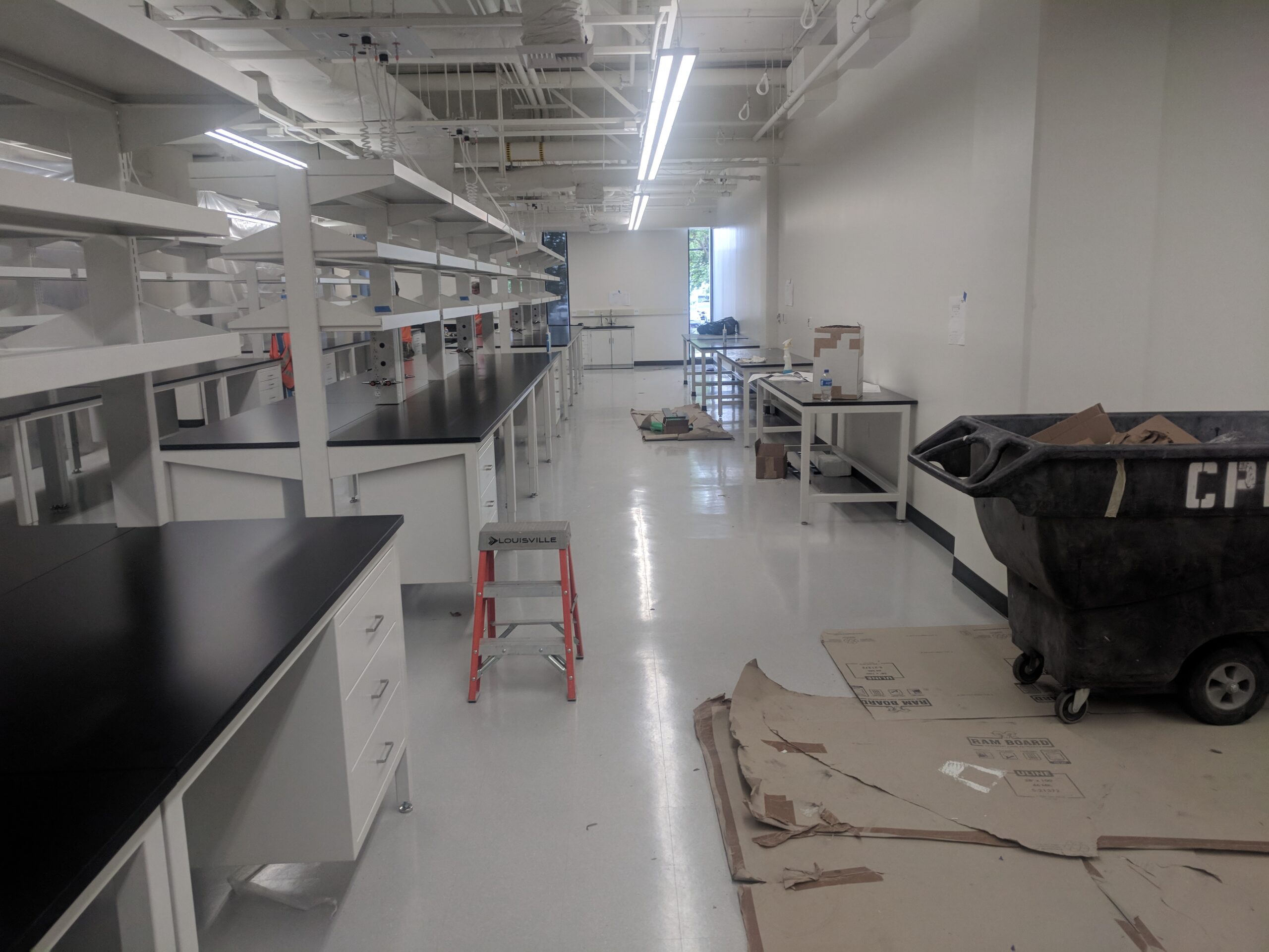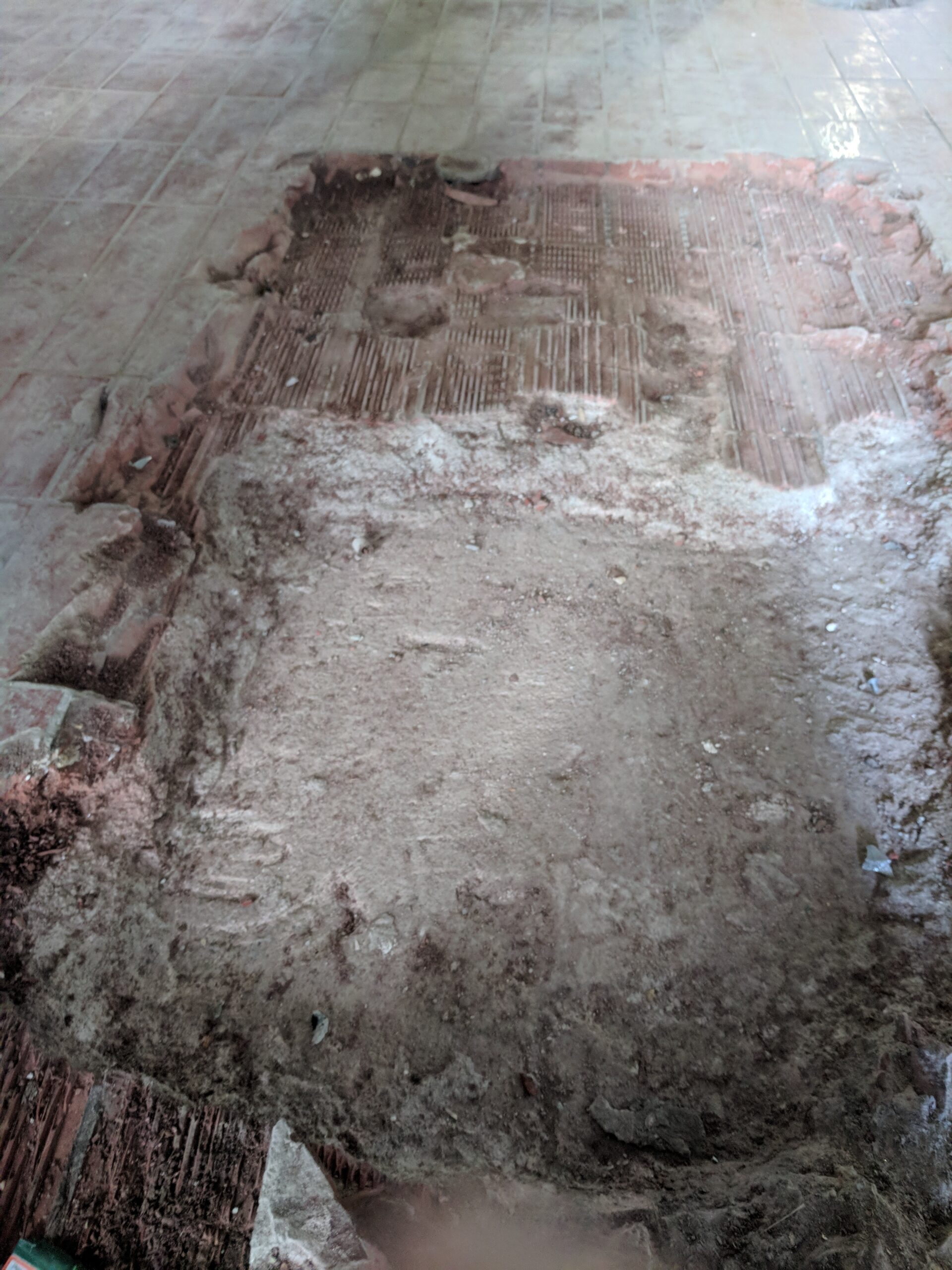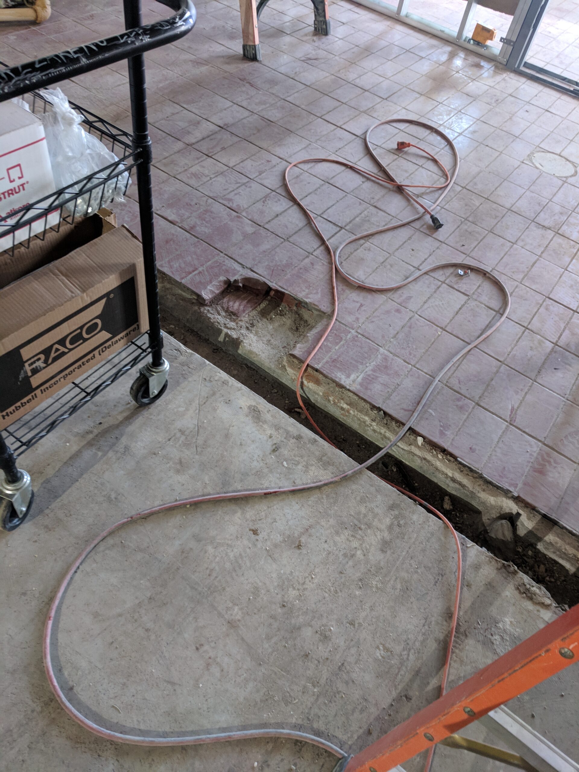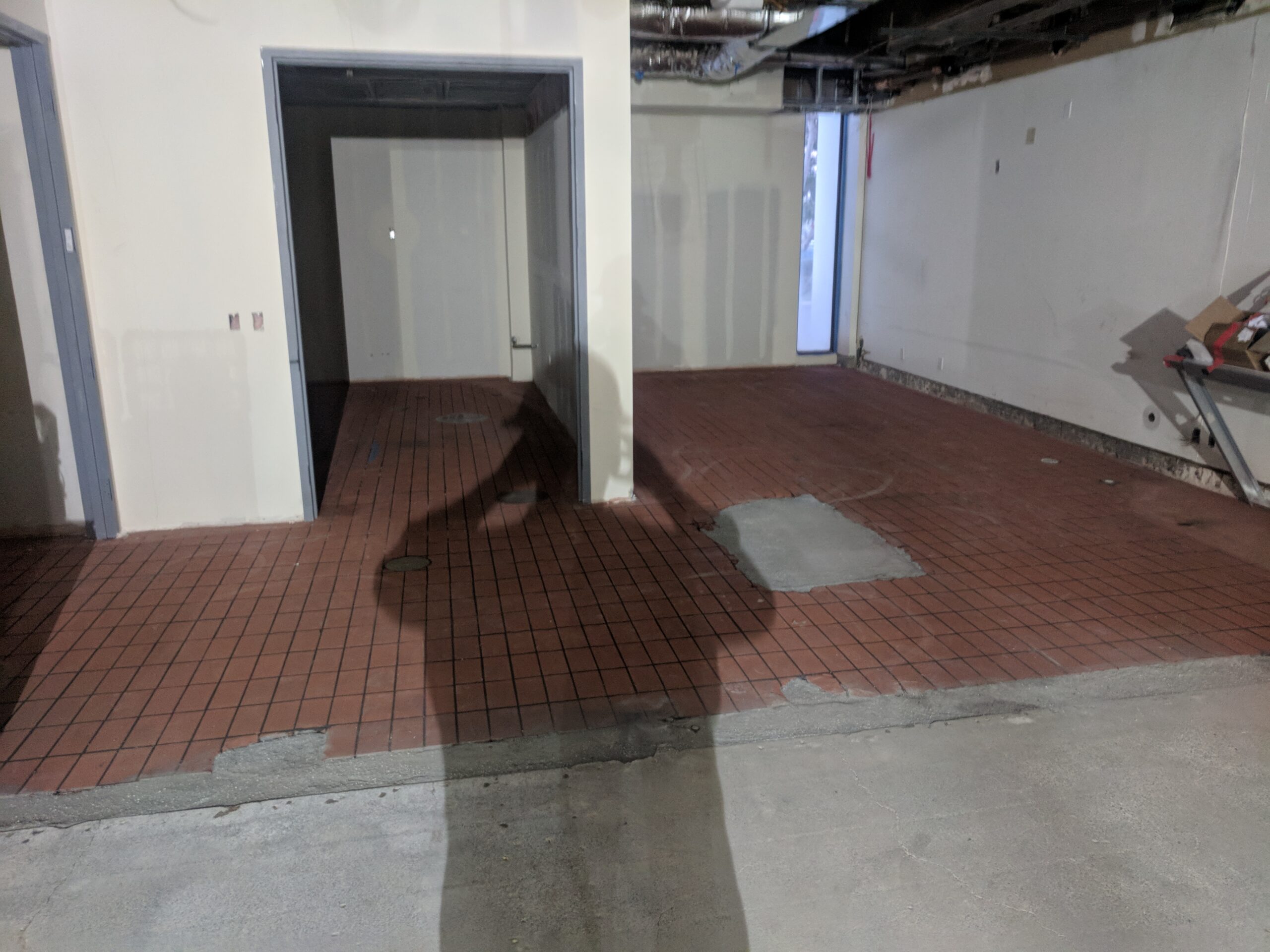 1. The existing quarry tile was barely budging after demo attempts, so we opted to install the Armstrong VCT over it…which also meant we had to patch the portion of the quarry that actually had been successfully demo’d to ensure a smooth surface for the VCT.