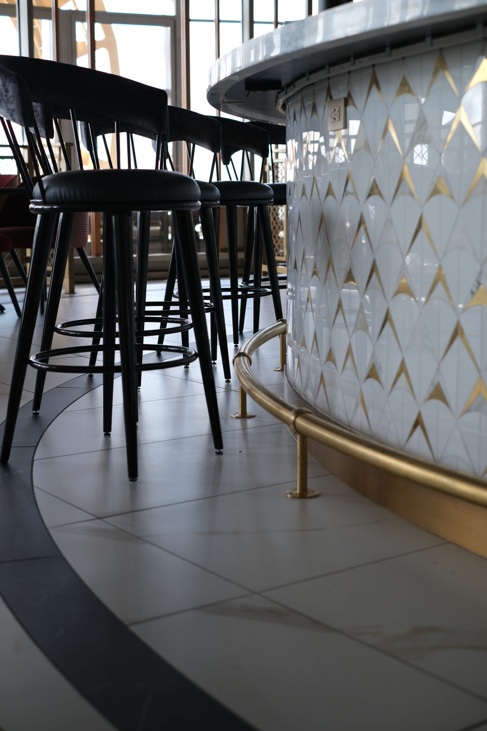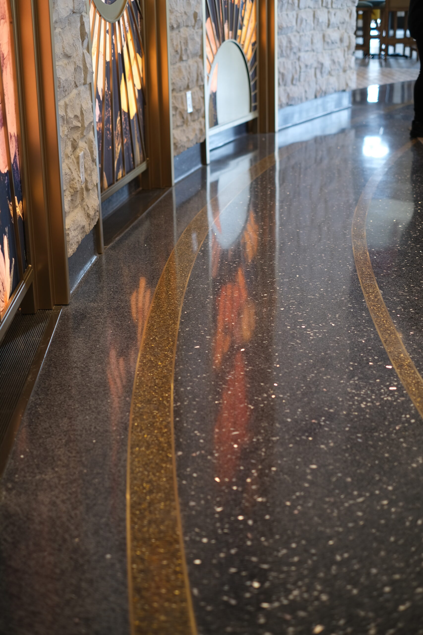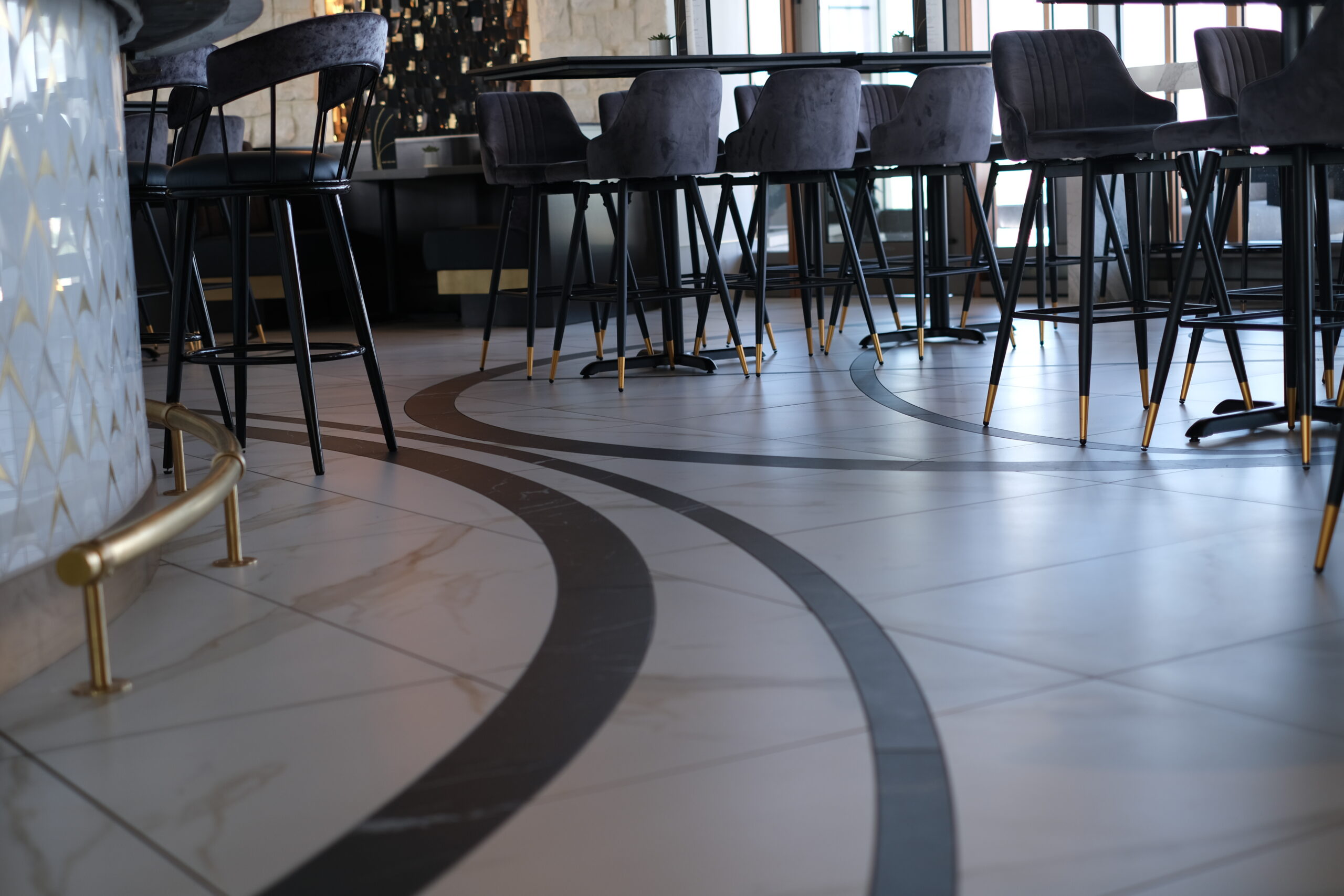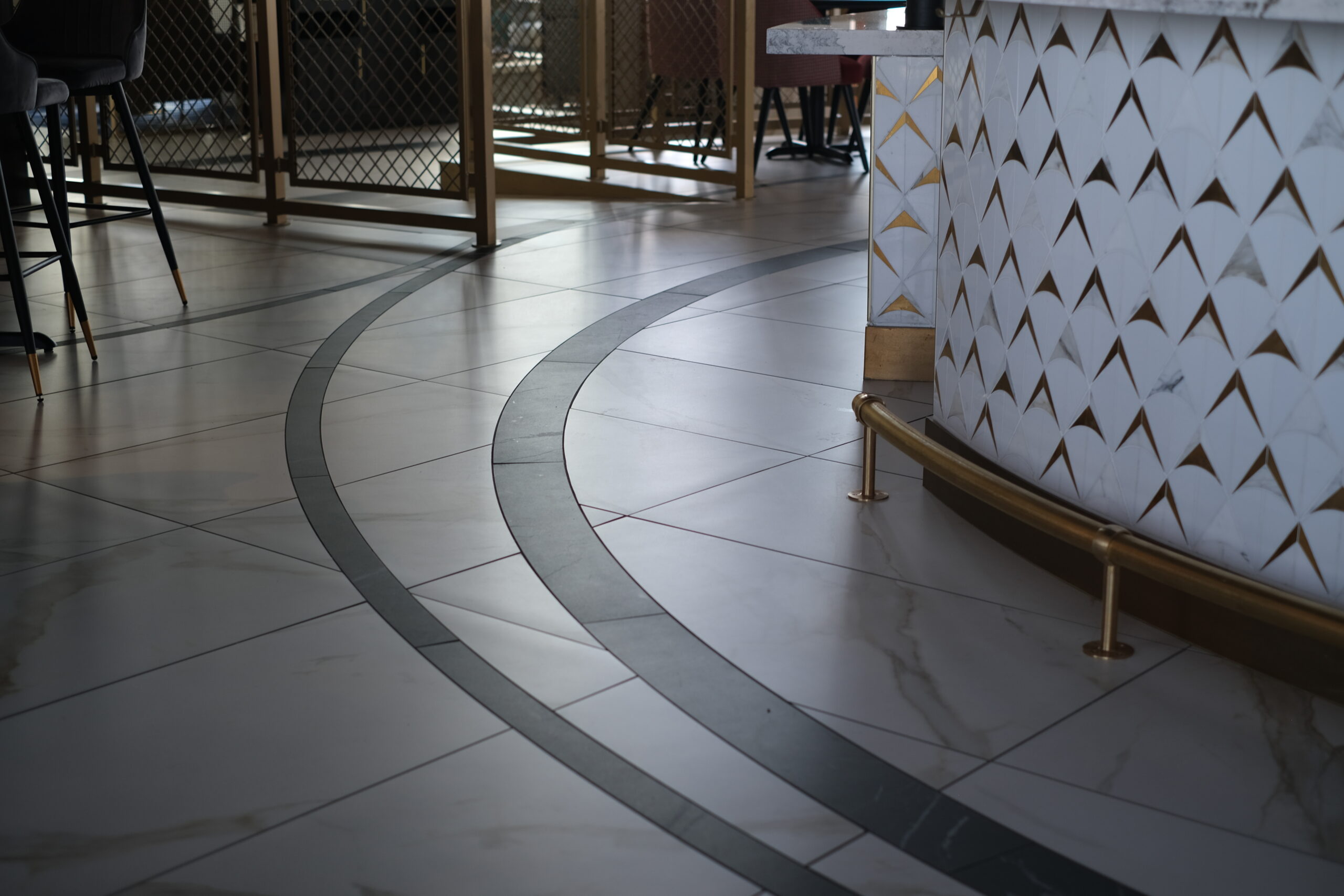 The tile scope for the Grand Helios Hotel at Universal’s Epic Universe represents one of the most extensive and technically demanding ceramic and stone installations completed by David Allen Company. Spanning over 92,000 square feet, the project encompassed tile and stone across 500 guestrooms, 58 showers, multiple rooftop bars, eight locker rooms, corridors, dining venues, and retail environments. The work included large-format porcelain, ceramic wall tile, custom mosaics, gauged porcelain panels, and stack stone, all installed using thin-set direct bond methods. Custom-fabricated transitions were critical to accommodating prefabricated POD bathrooms, especially in guestrooms where height differentials required custom thresholds. In high-impact areas like the Level 10 rooftop bar, tile was waterjet cut and dry-laid for layout verification before final installation, allowing precision alignment across radiused layouts. Complex carpet insets, multi-height patterns, and expansion joint transitions demanded continuous coordination with millwork, ceiling trades, and Universal Creative. Despite ongoing design revisions and a compressed schedule, David Allen Company delivered a flawless tile installation that supports the hotel’s celestial theming while meeting strict aesthetic, structural, and ADA compliance requirements.
