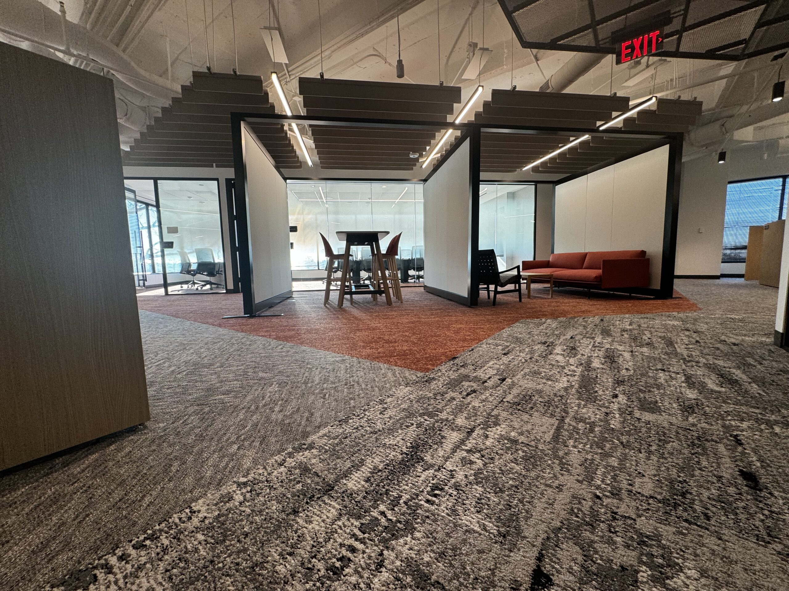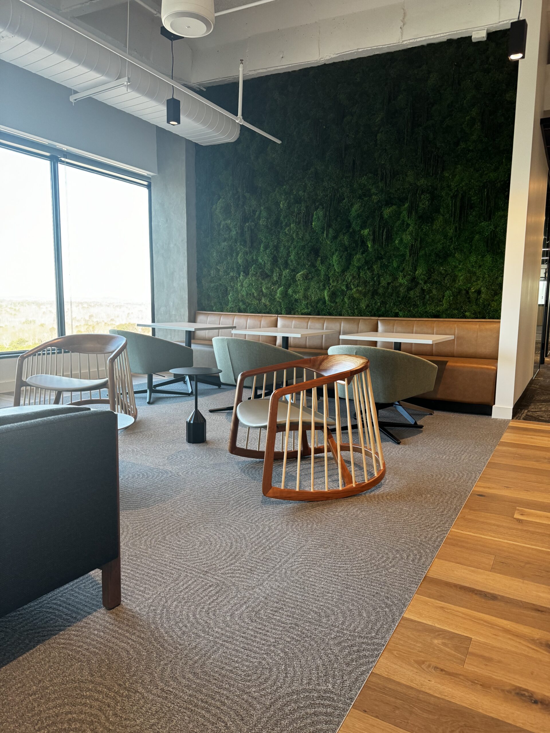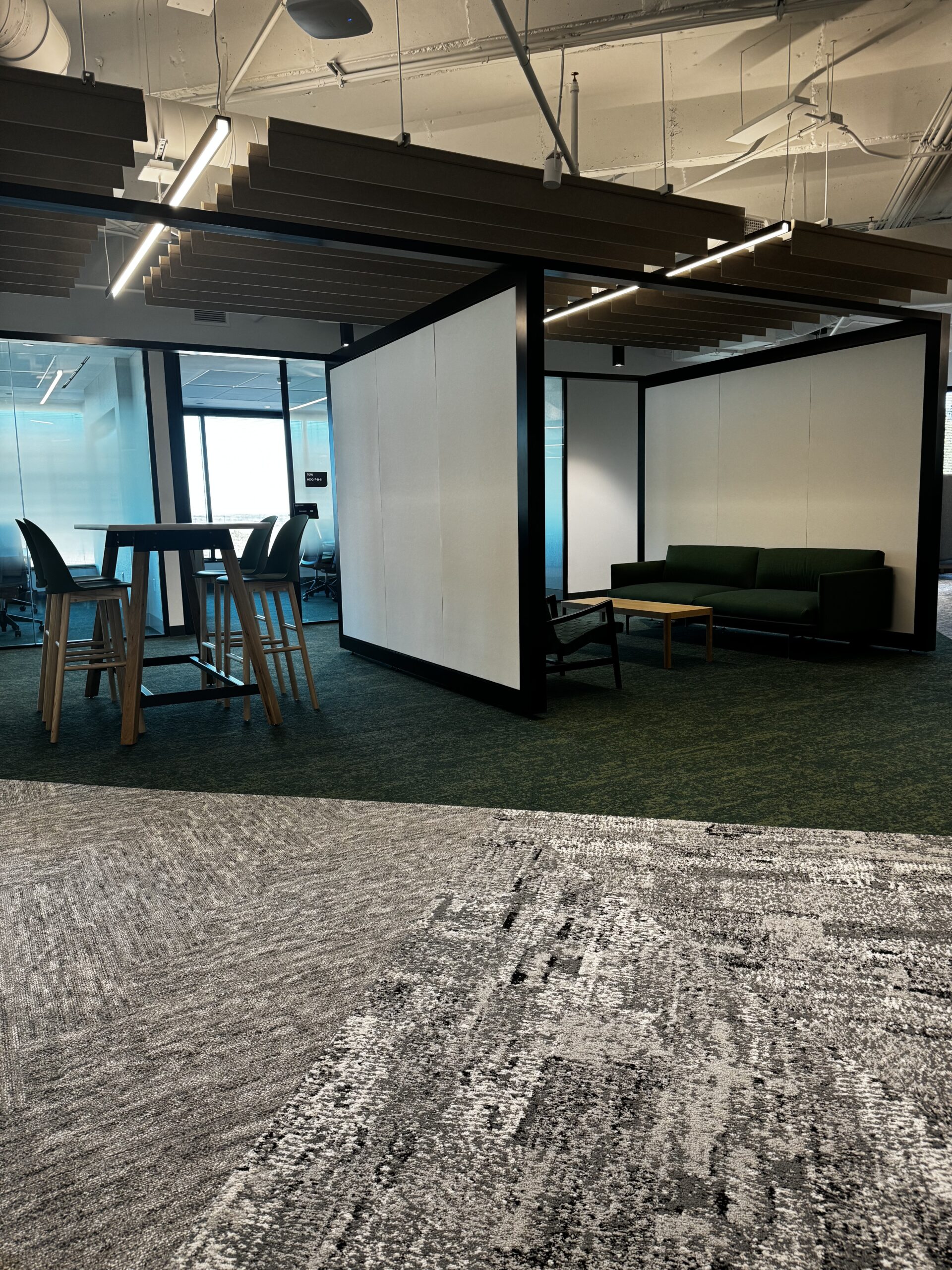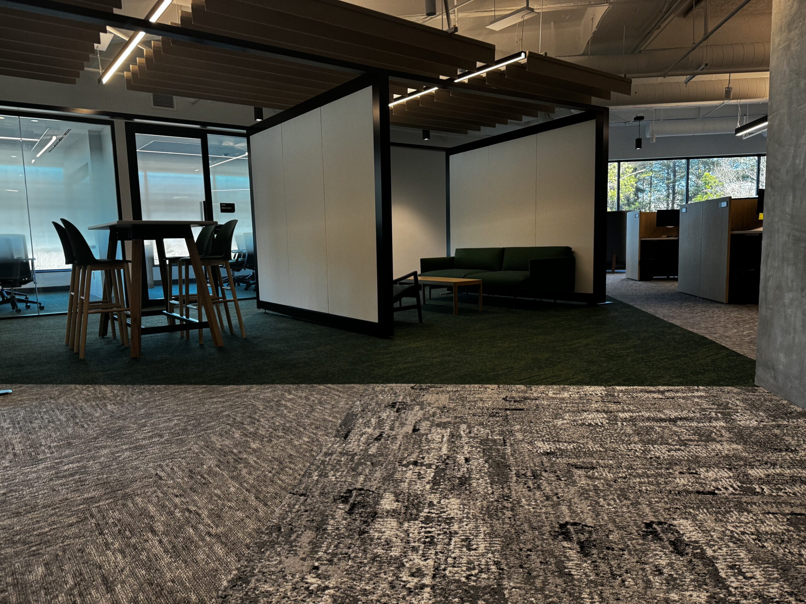 Shaw Contract’s Abide Coriander Oak lvt and a mix of carpet tile selections lend a modern and durable flooring solution for the space, combining style with practicality. The mixture of Shaw’s Translate, Flat Weave and Familiar carpet styles selected for the corridors, collaborative spaces and focus areas provide comfort, acoustic benefits, and sleek design versatility. While the Beyond Broadloom selection was creatively used as an are rug over polished concrete, adding warmth and sophistication to the dynamic bar and café areas. Tarkett’s straight and cove base, in color coil, complements all flooring materials providing a cohesive and visually appealing finish throughout the space.