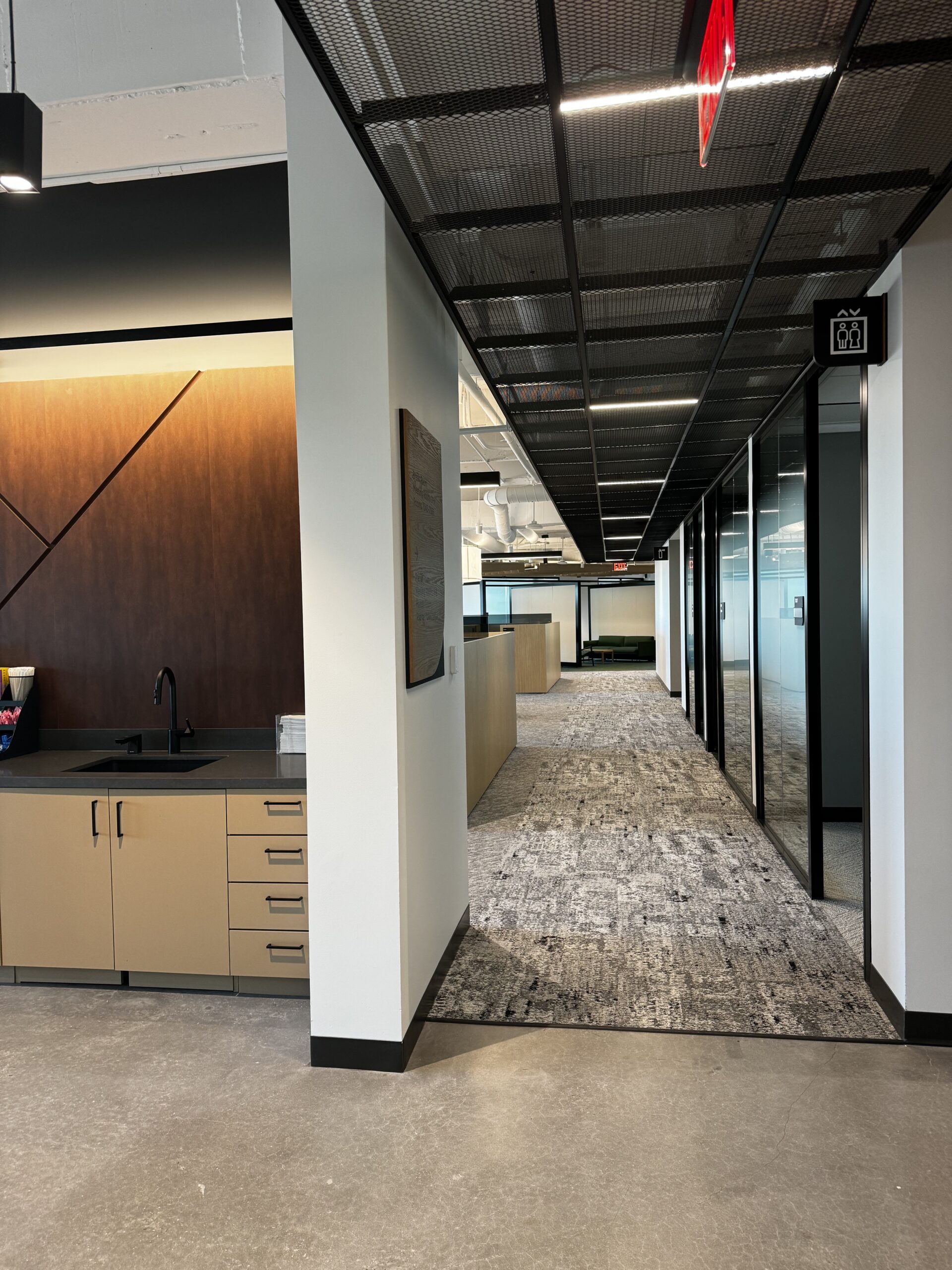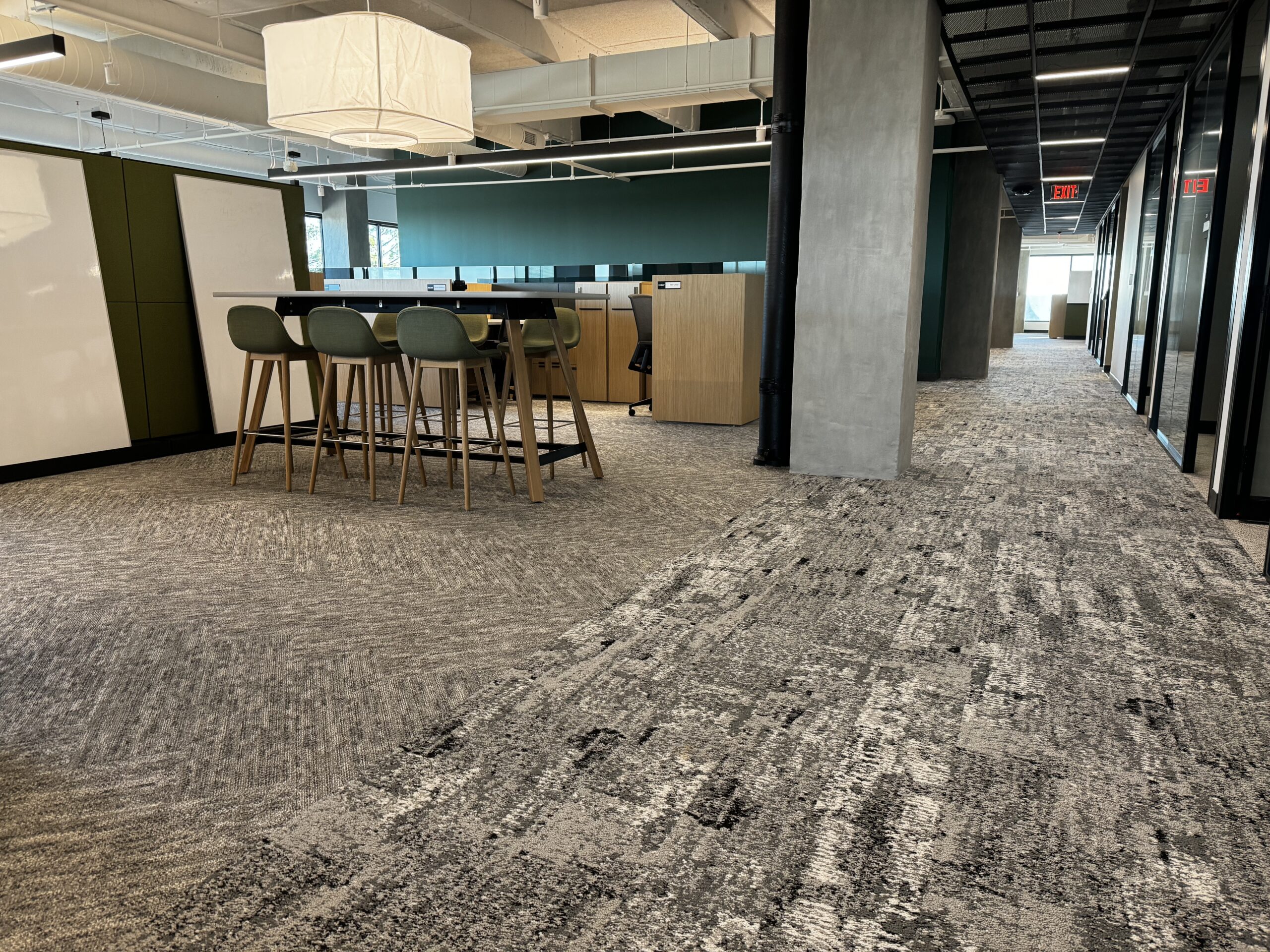 Graphic Packaging’s renovation was characterized by a diverse array of flooring materials and functional zones. The client’s overarching vision was to craft a cohesive and visually captivating environment, ensuring smooth transitions between different flooring materials to maintain both aesthetic continuity and functional integrity. Schluter transitions emerged as the optimal solution for meeting this challenge head-on. Their innovative design and precise engineering enabled us to seamlessly integrate various materials, including tile, LVT, polished concrete, and carpet tile, across the entirety of the space. Notably, Schluter transitions boast durability, ease of installation, and versatility across a range of sizes and applications, effectively mitigating tripping hazards while maintaining visual and structural cohesion. The stone-gray hue of the transitions, employed across different applications, served as a neutral backdrop, effortlessly harmonizing with the surrounding flooring materials and elevating the overall aesthetic impact of the renovation.