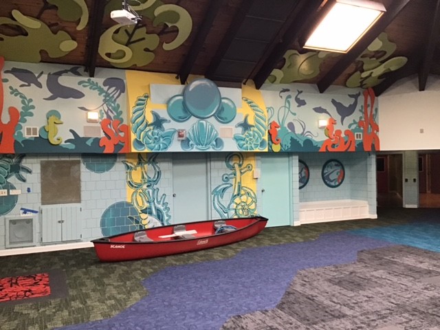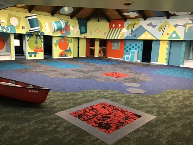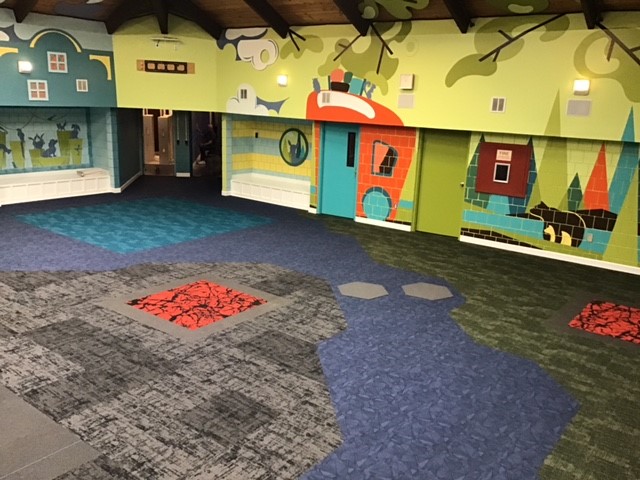 The great room/activity area and adjacent offices were designed to stimulate imagination with wall painted murals and floor patterns using Kinetex 24×24 tiles, which create an abstract depiction of anything from camping outdoors to underwater life and even space exploration.