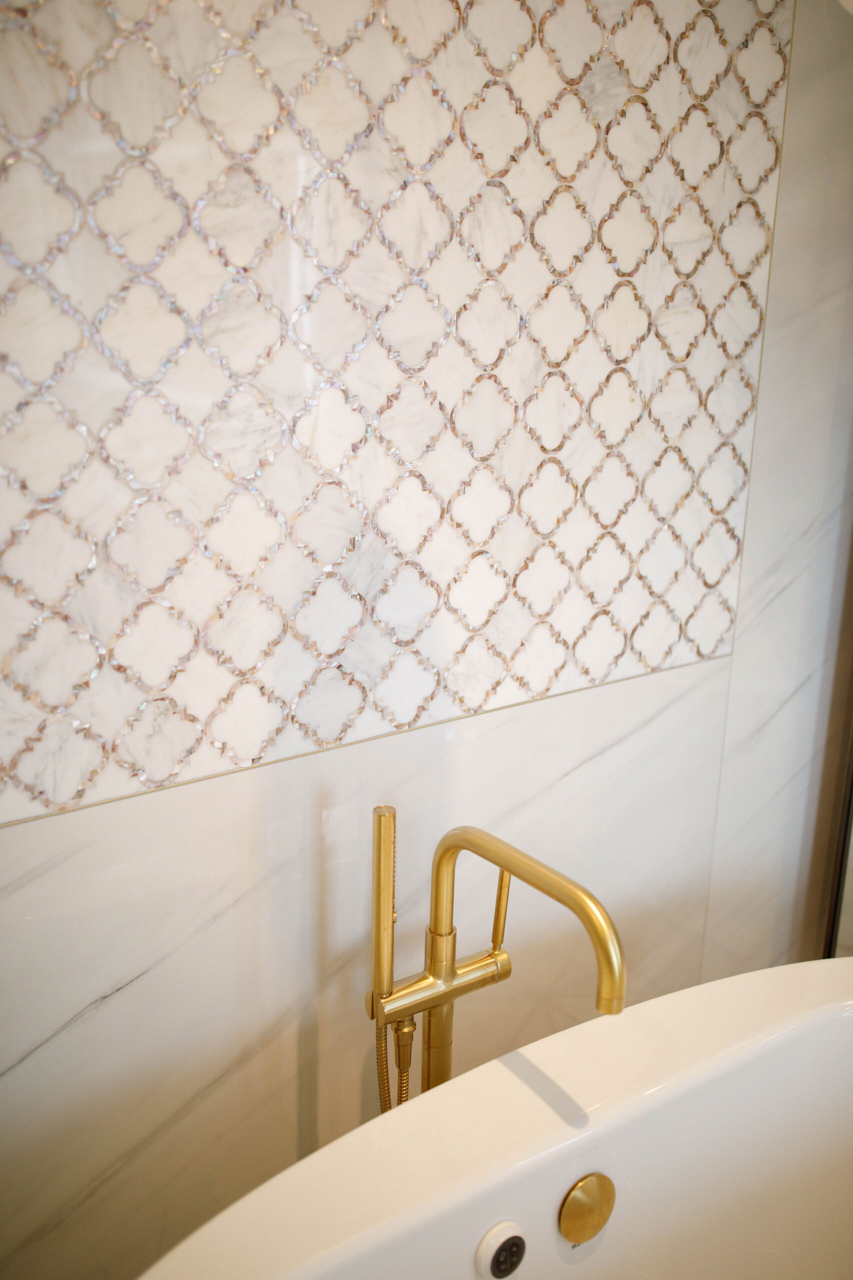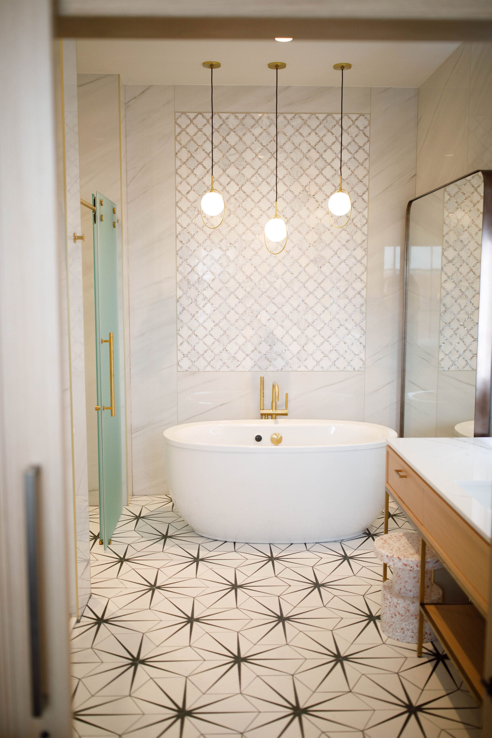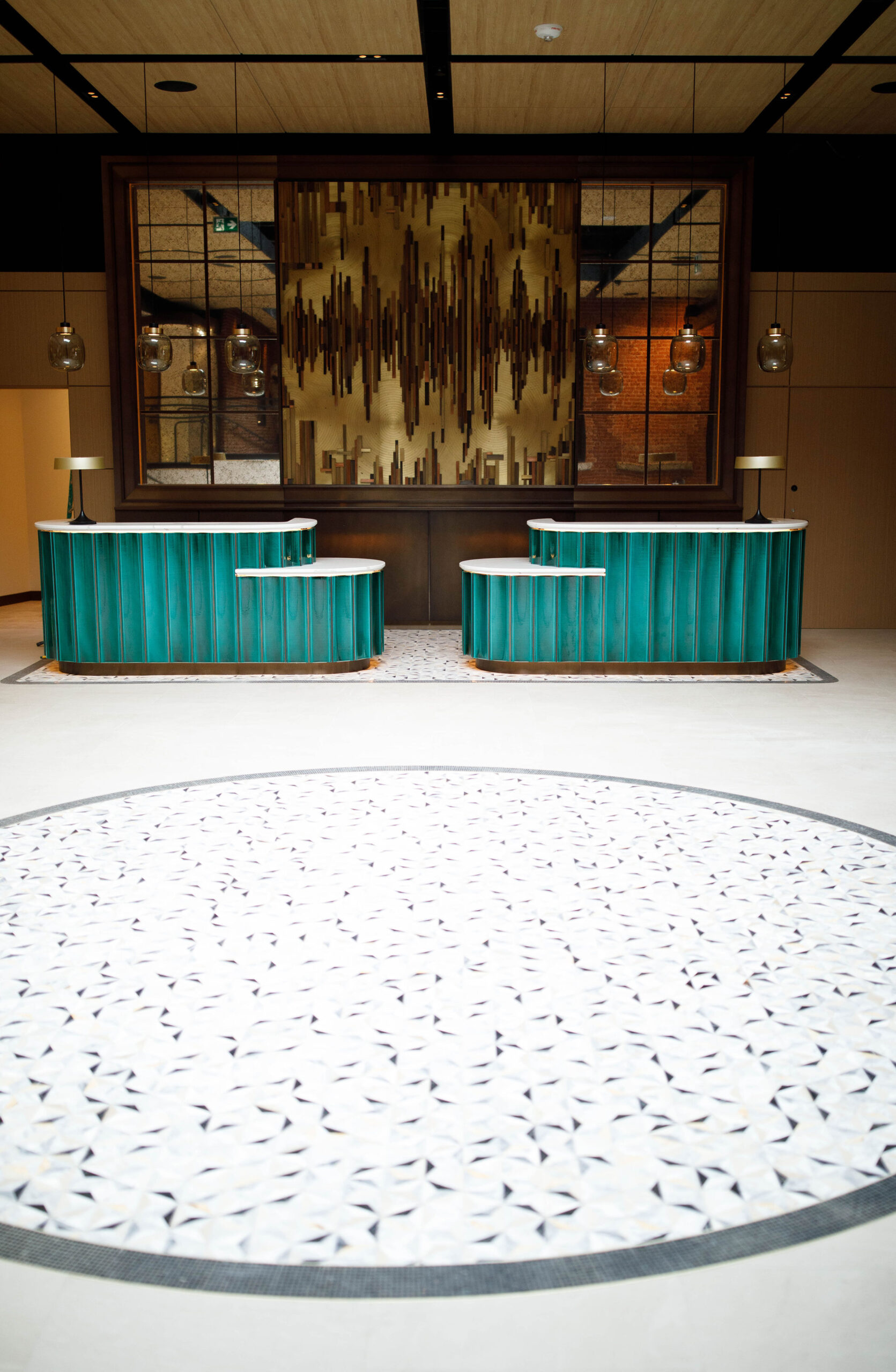 In guest bathrooms, 5′ x 10′ porcelain slab installations create a seamless, refined environment executed across both floors and walls for a monolithic spa like effect. Guests also experience comfort and warmth in all 164 guestroom bathroom floors from the heat systems installed underneath the stylish hexagon floor tiles. In the lobbies and public spaces, custom tile compositions on floors and feature walls introduce movement, contrast, and visual depth, guiding guests through dynamic social zones. Carpeted guestroom corridors provide warmth, acoustic comfort, and a sense of arrival, balancing the hotel’s energetic public spaces with quiet retreat.