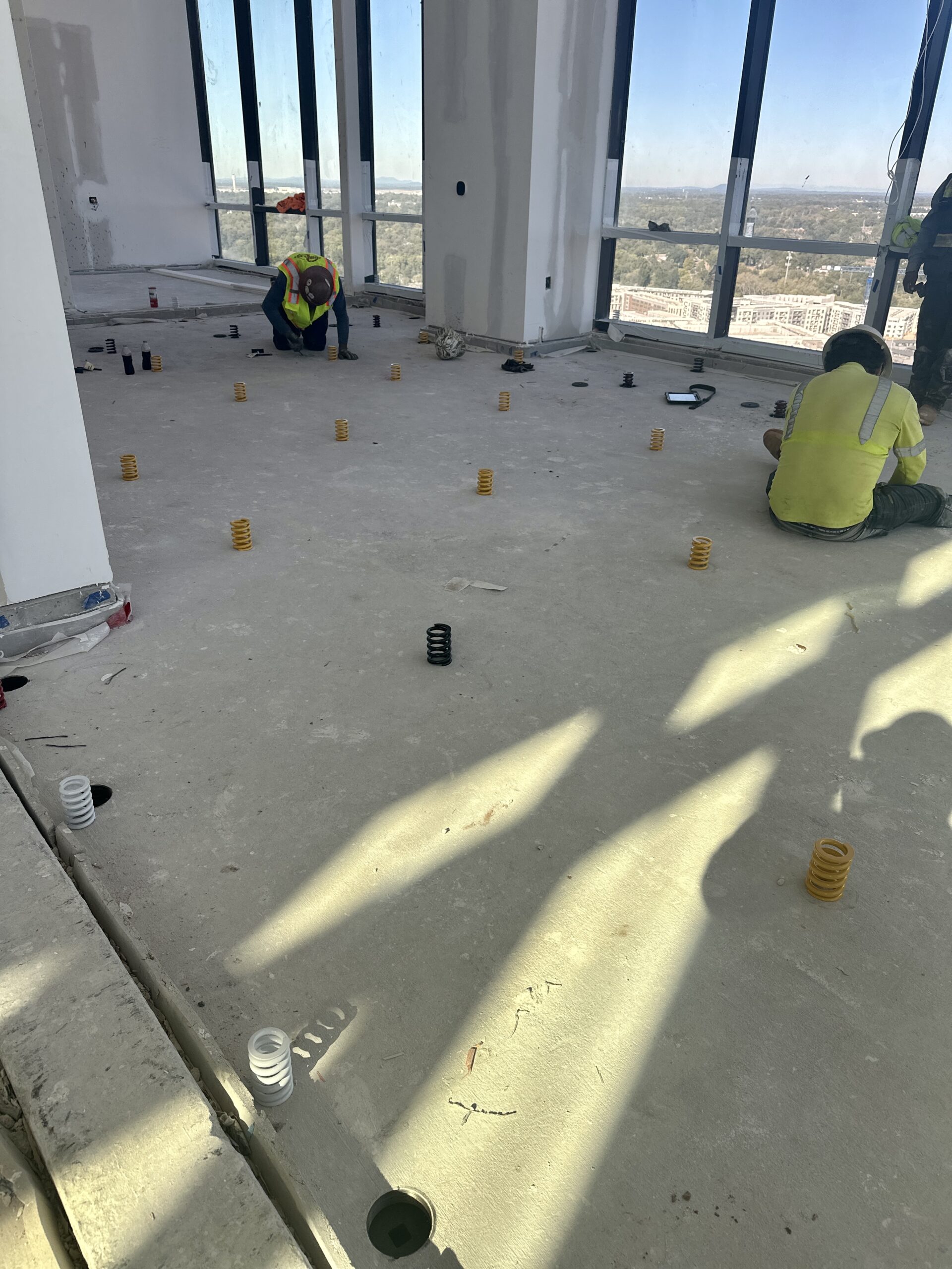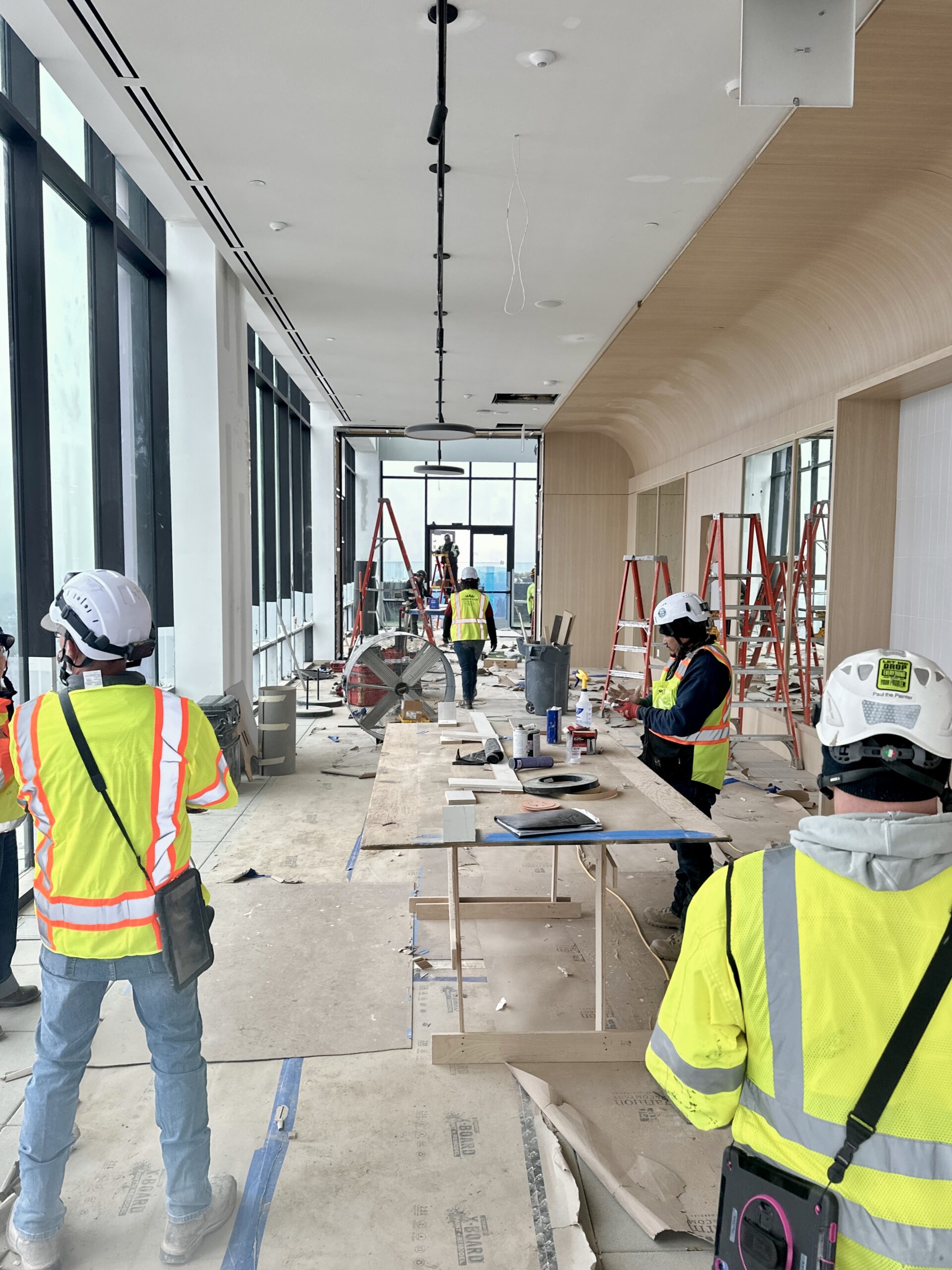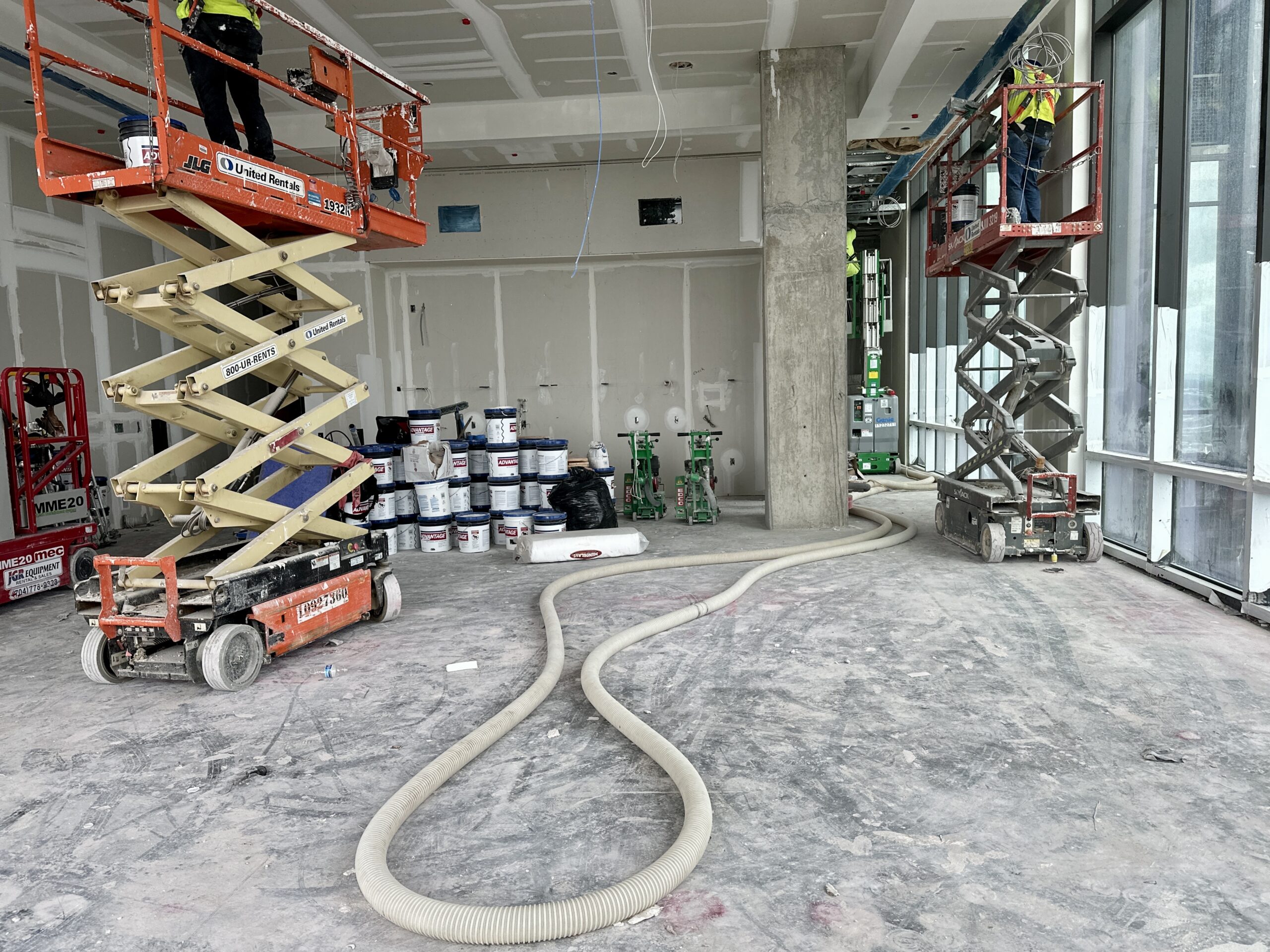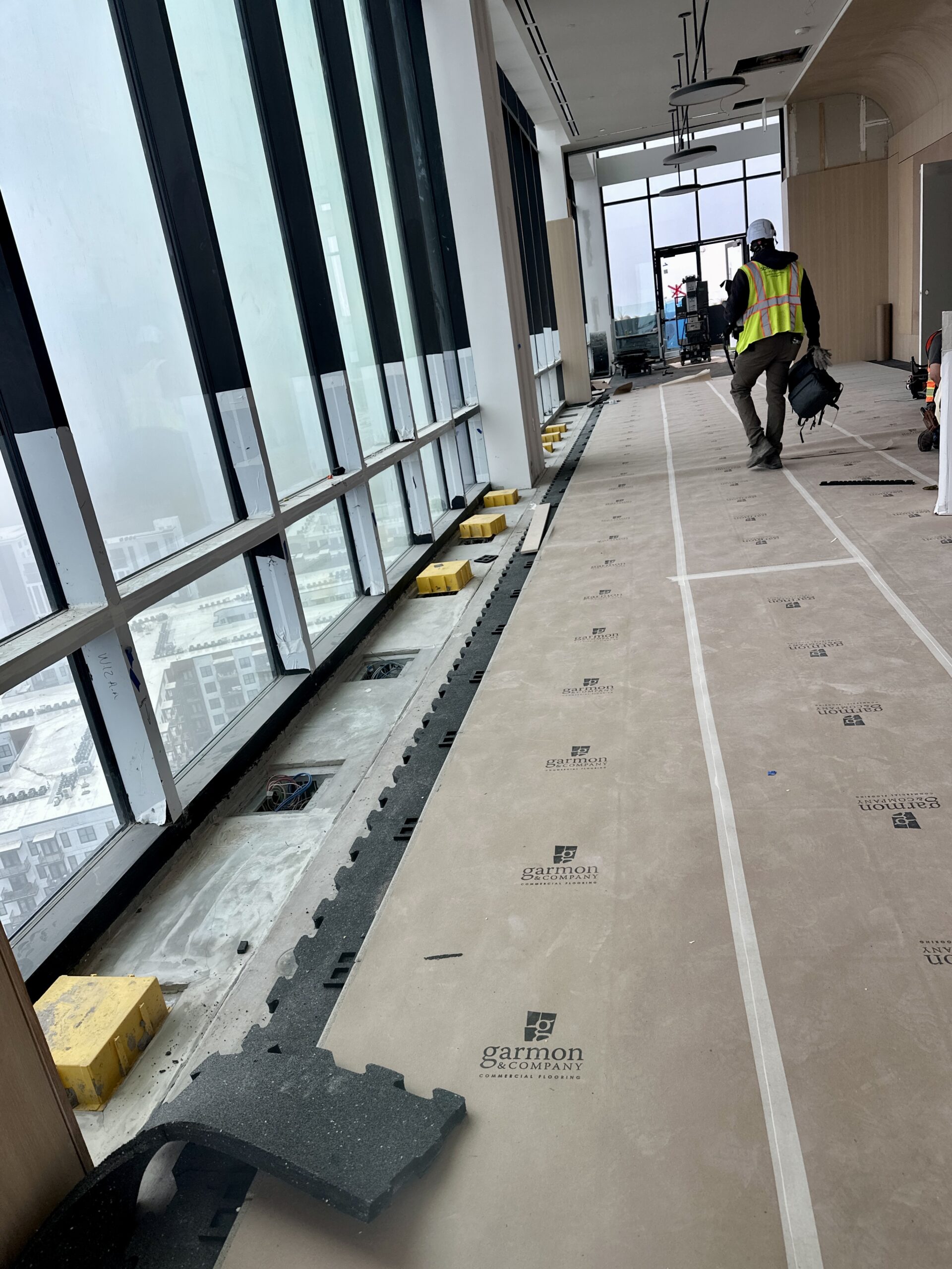 Beyond these obstacles, moving materials and mobilizing crews up and down the tower proved exceptionally difficult due to restricted elevators, buck hoist, and stairwell access, leading to lost productivity hours and requiring strategic staging solutions. The EcoSurfaces installation in an amenity space presented additional hurdles, including incomplete electrical boxes, unconventional transitions, and ongoing work by other trades. Despite these roadblocks, our team executed a flawless flooring installation that met the designer’s vision and functional needs. Through meticulous planning, creative problem-solving, and continuous communication, we overcame some of the toughest site conditions we have encountered to deliver a durable, high-quality flooring system.