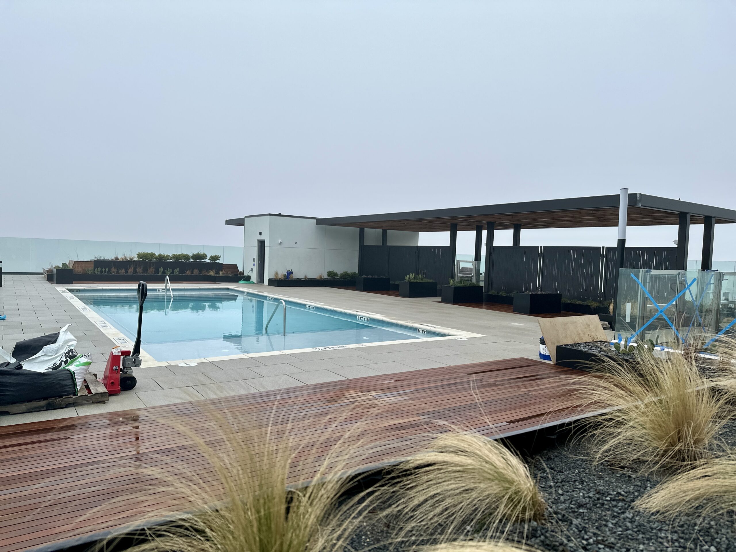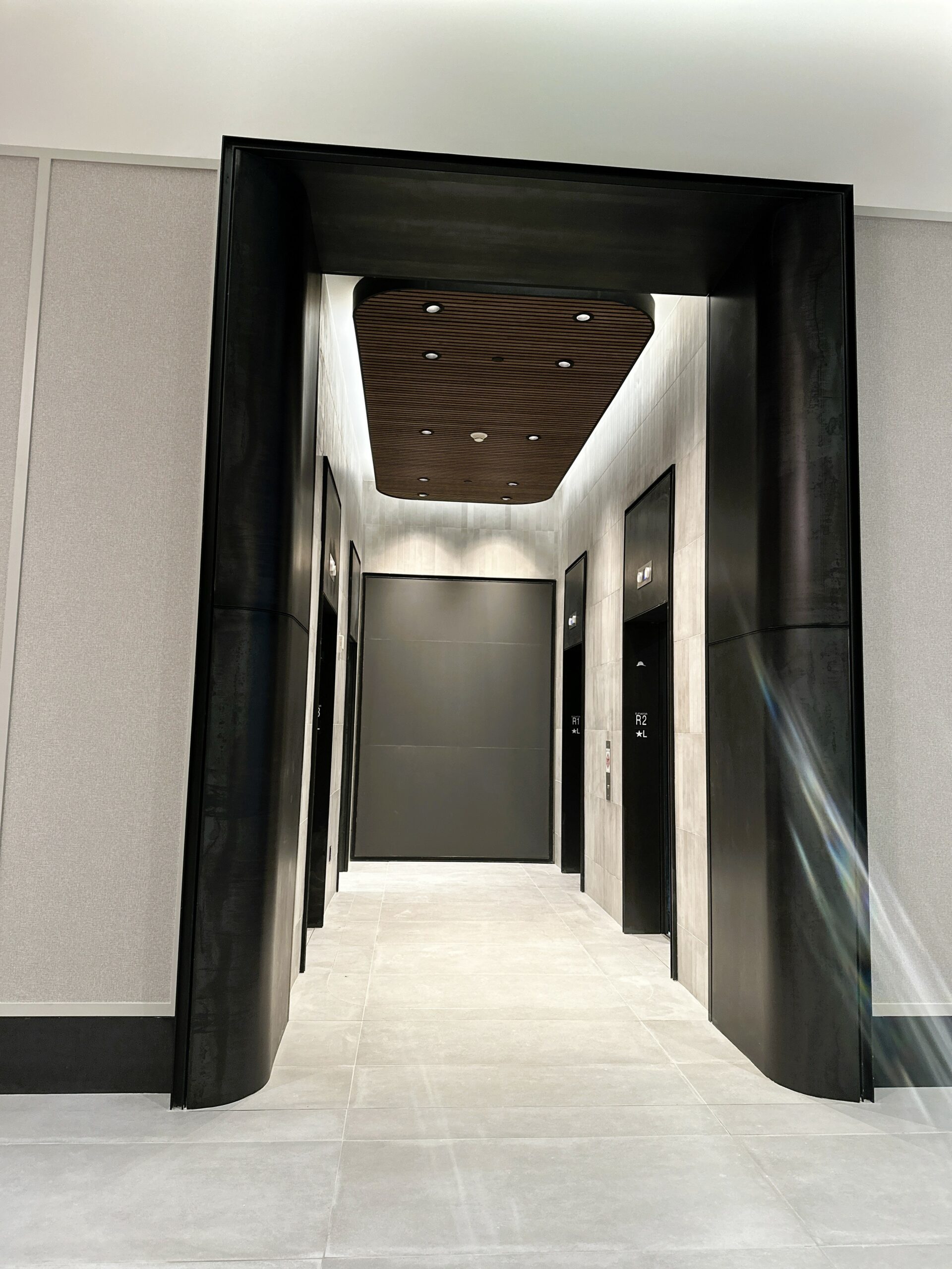 Additionally, the 96 unique room layouts demanded a custom approach for nearly every flooring transition, requiring our team to adapt on the fly while maintaining quality control. Moving materials up and down the tower was another persistent obstacle, with limited elevator, buck hoist, and stairwell access creating bottlenecks that resulted in lost productivity hours. In the amenity space, the EcoSurfaces installation presented its own set of issues, including incomplete electrical work, challenging transitions between materials, and continued disruptions from other trades working over unfinished flooring.