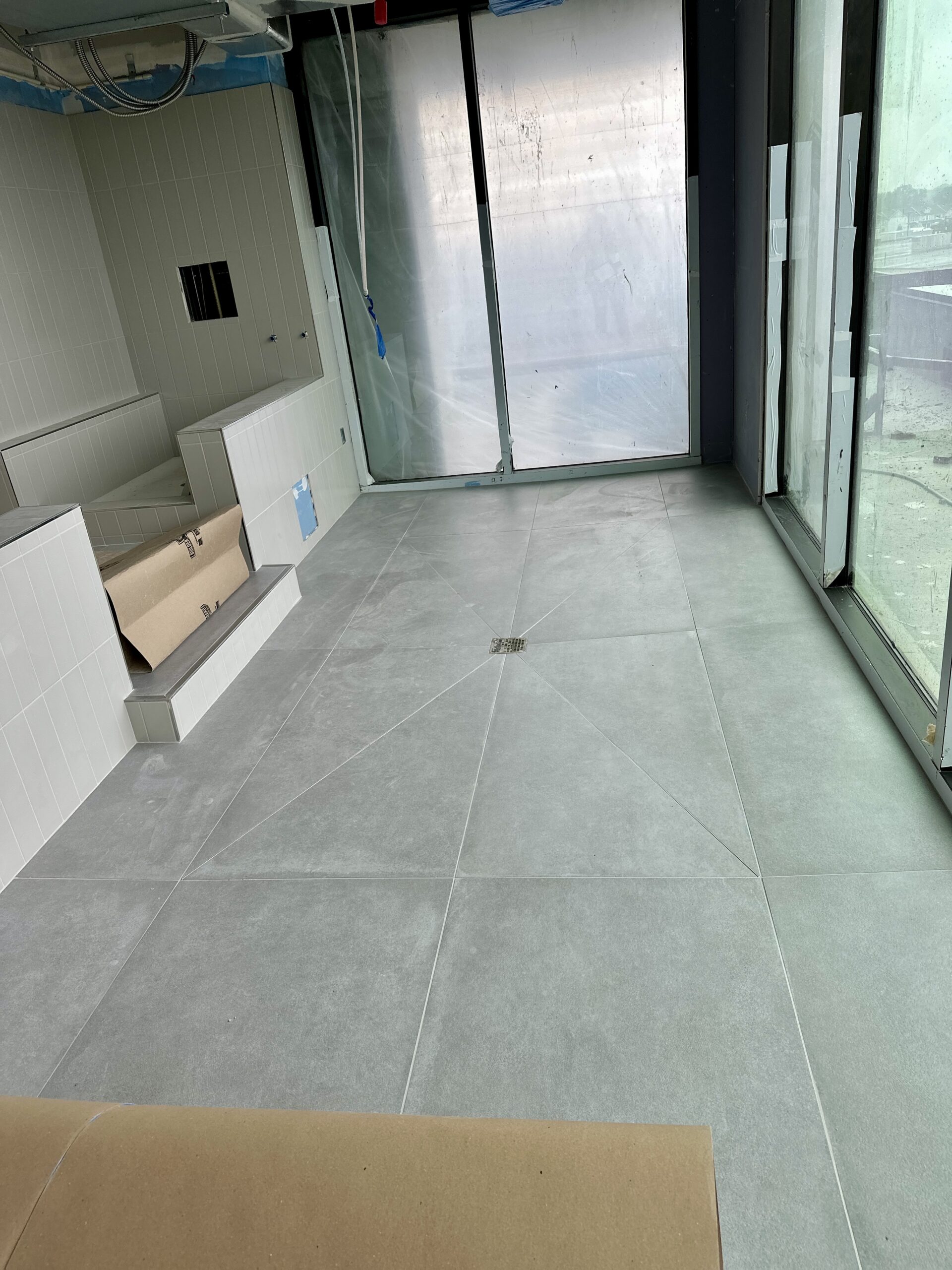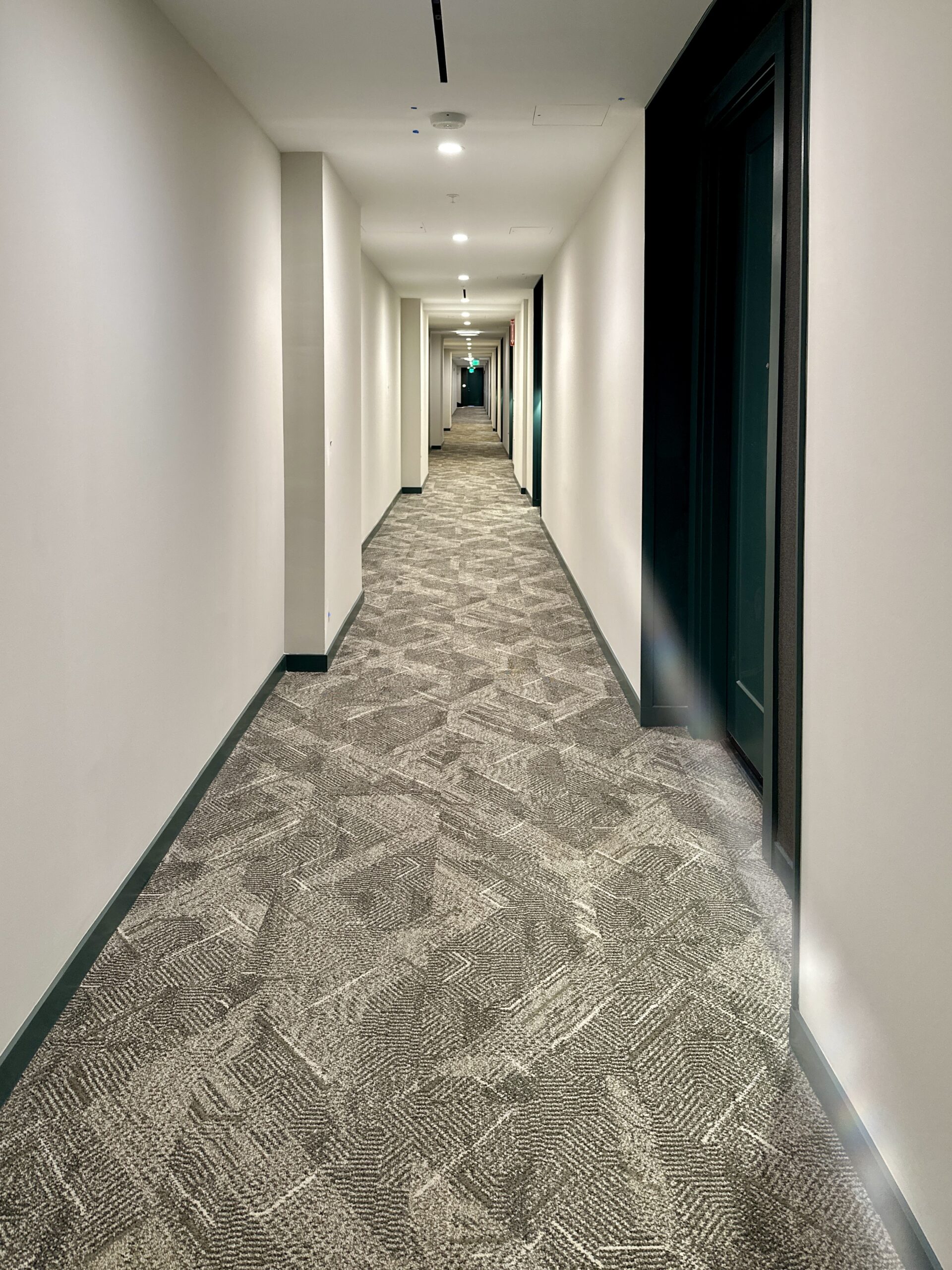 The interior space challenges at Hawkins Residential Tower significantly impacted every stage of the flooring installation, from preparation to execution and follow-up. One of the most demanding issues was the uneven subfloors, which required extensive grinding, leveling, and patching before we could begin installing Bentley carpet and Daltile porcelain tile. This additional prep work not only extended the installation timeline but also required careful coordination with other trades to ensure accessibility and efficiency.