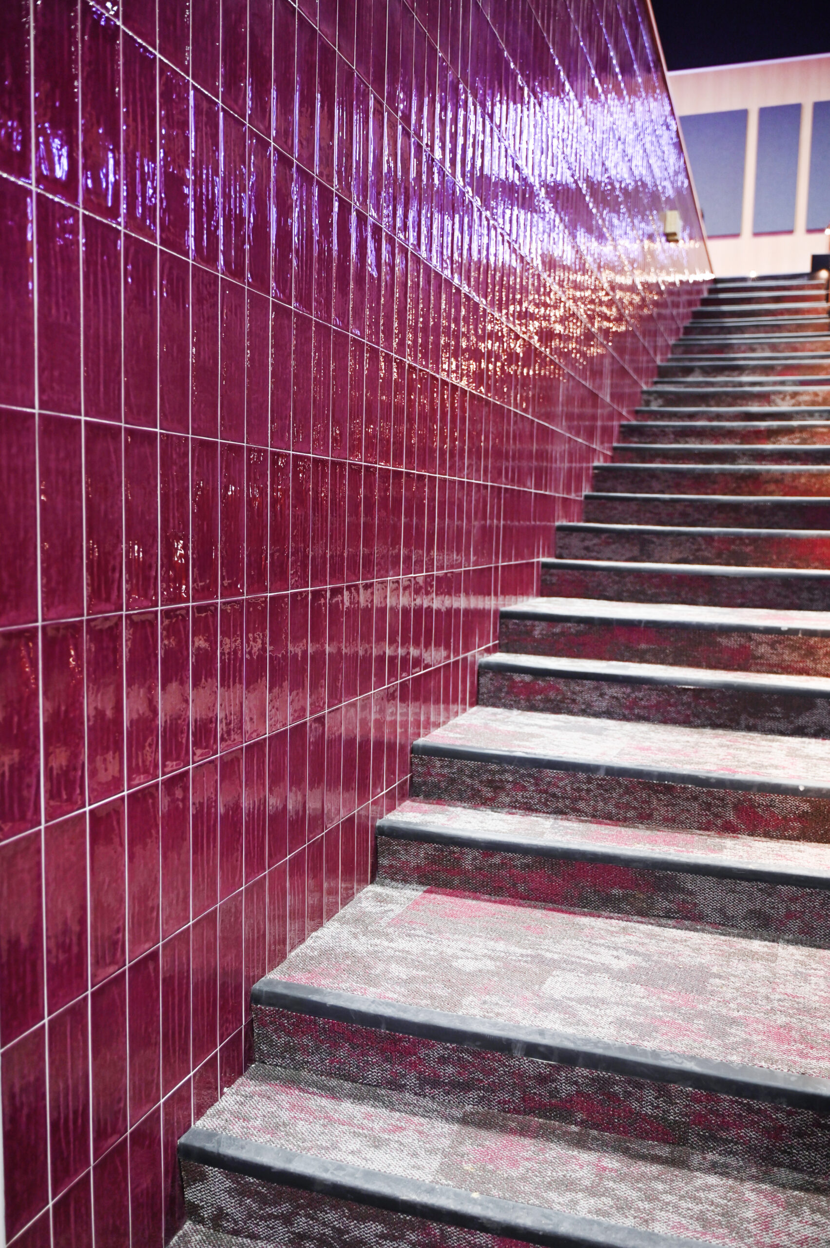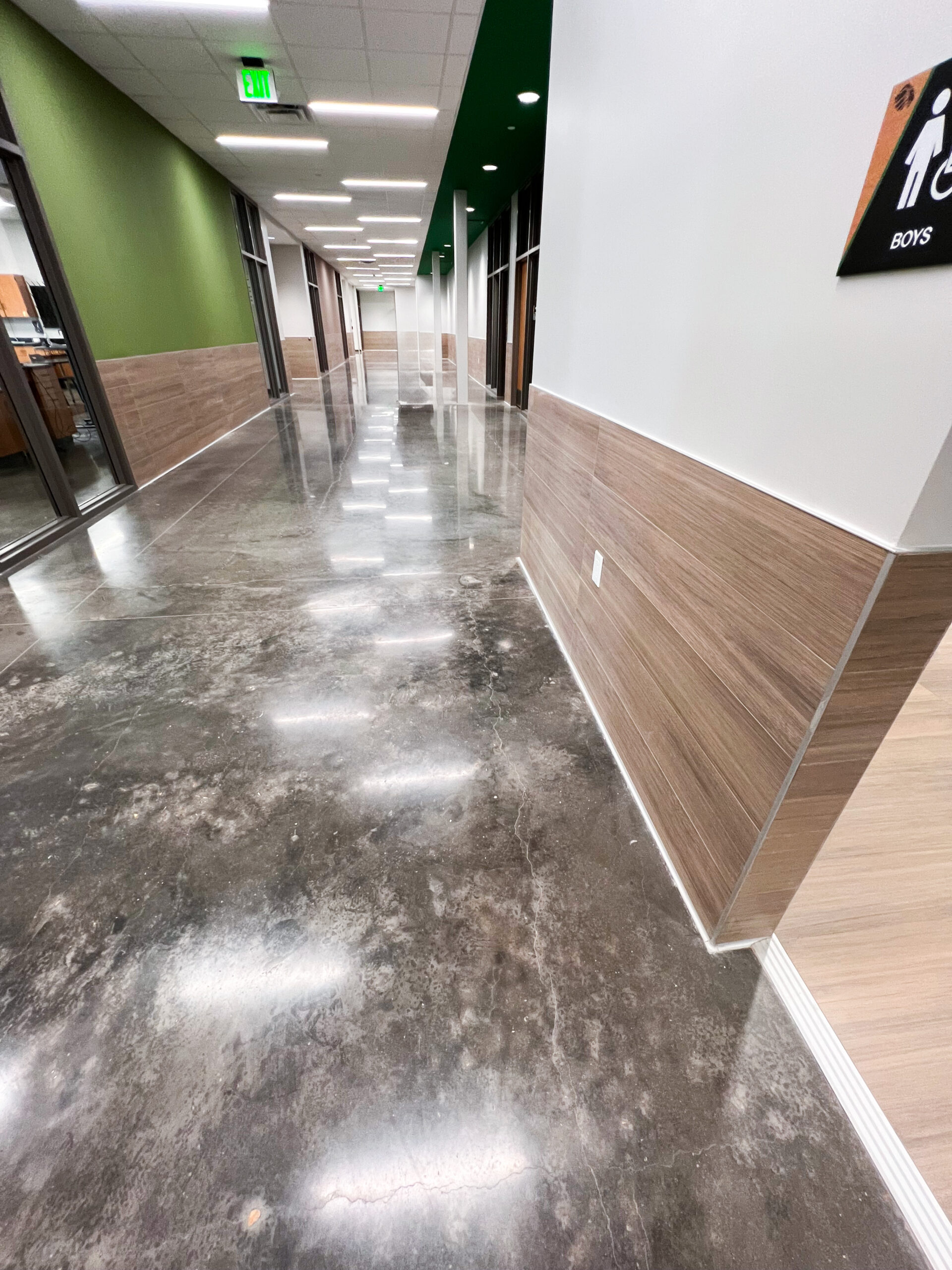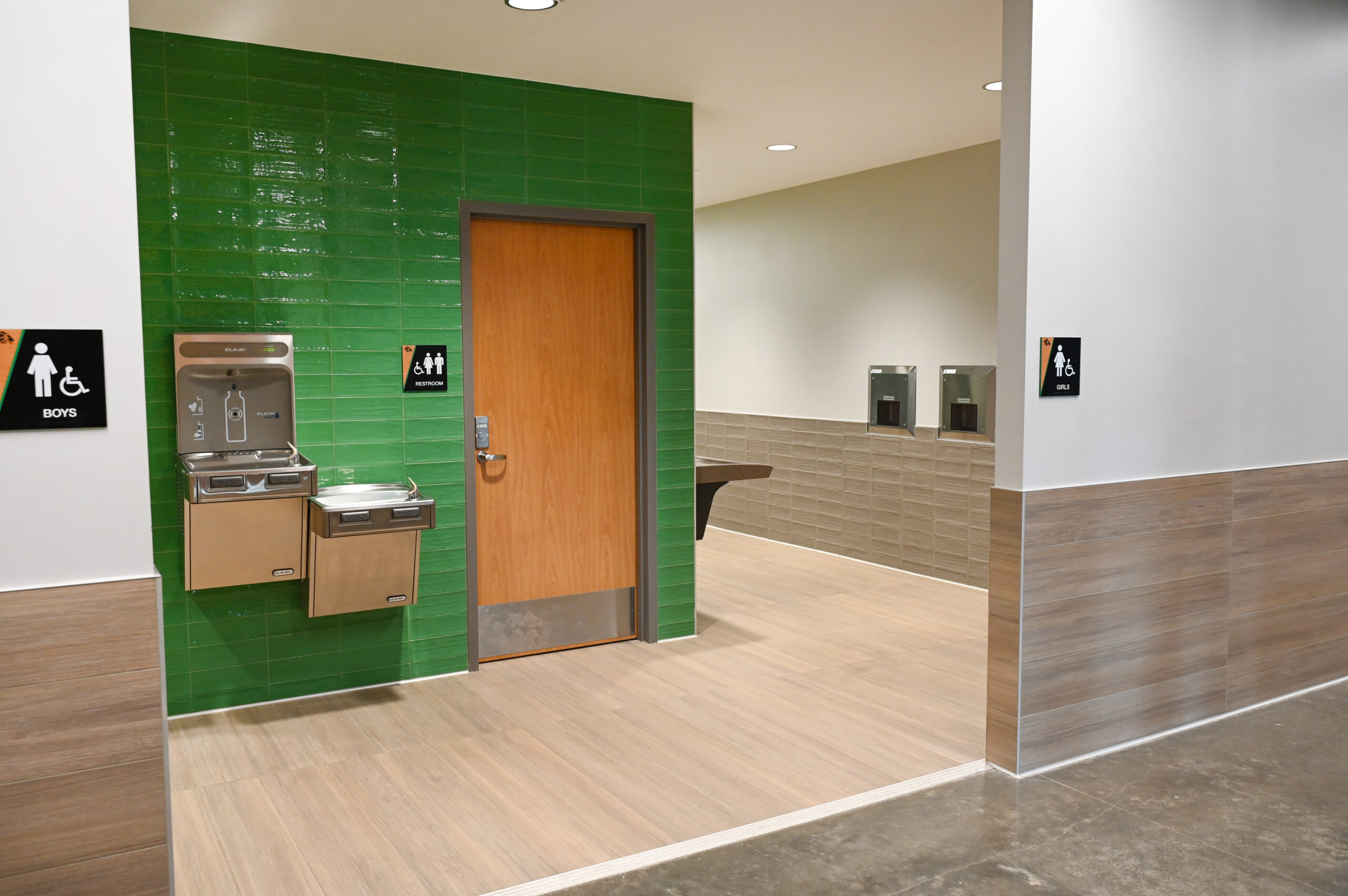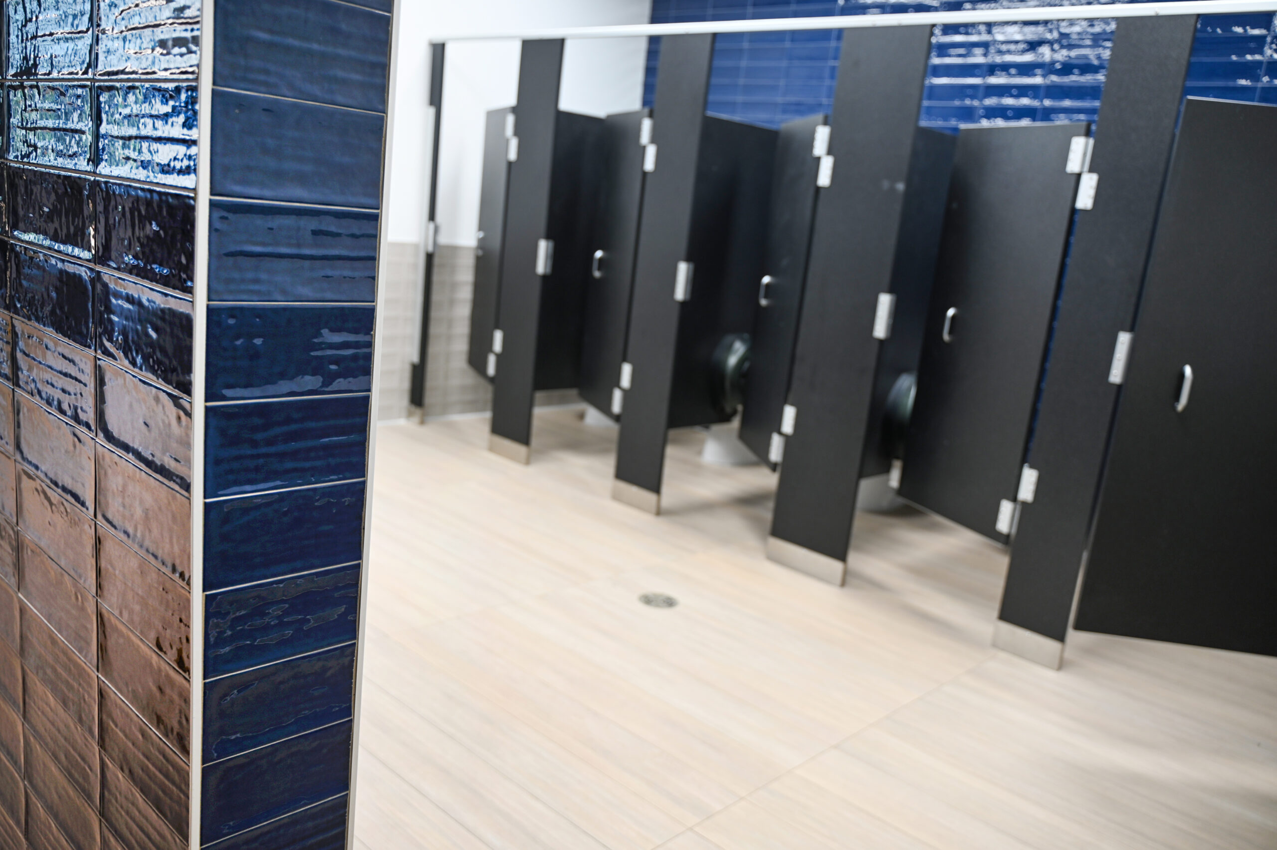 A defining feature of the project is the extensive use of elongated subway tile, installed in a stacked pattern that creates clean, uninterrupted lines throughout the space. Unlike traditional staggered layouts, this precise installation leaves little room for error and required a high level of craftsmanship to achieve its striking visual impact. Complementing the tile work, Anytime Flooring installed expansive corridors of LVT for durability and ease of maintenance, along with significant amounts of carpet tile in areas where added acoustical control was essential. In spaces such as restrooms, multiple materials converge seamlessly, resulting in subtle yet modern transitions that elevate the overall design. The finished project reflects Anytime Flooring’s continued commitment to excellence and innovation in the educational market, and the team is exceptionally proud of the result.