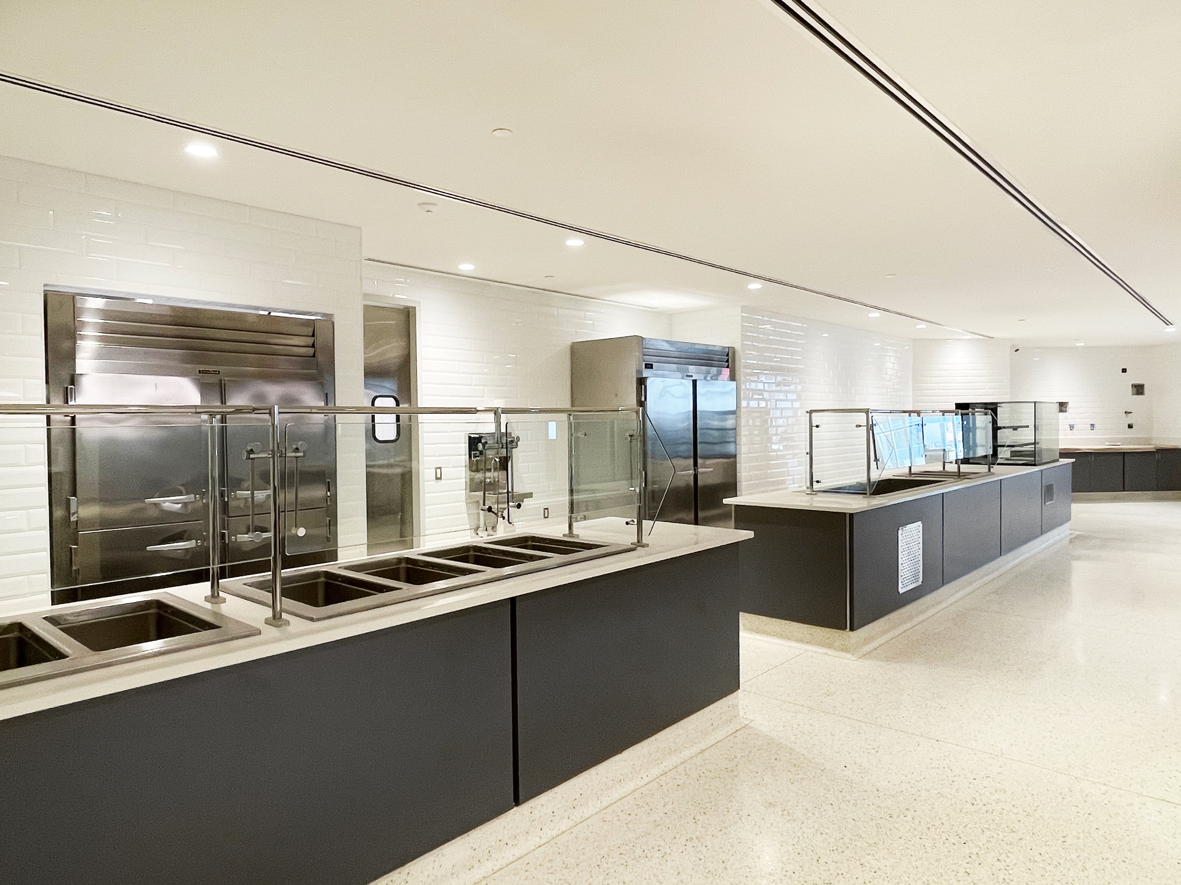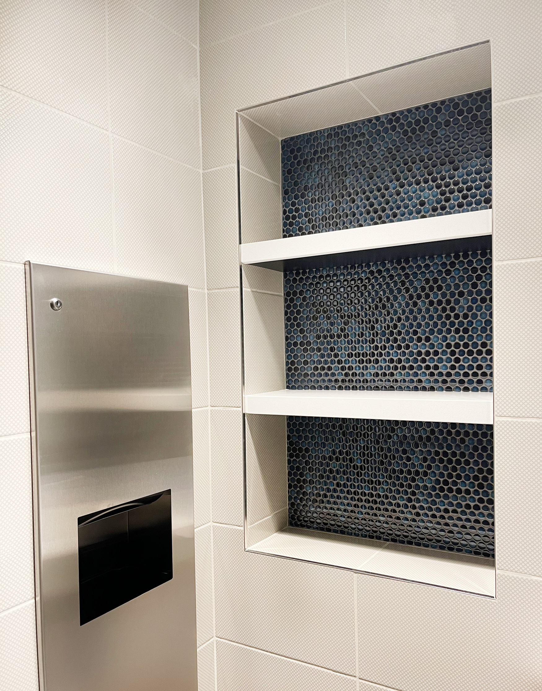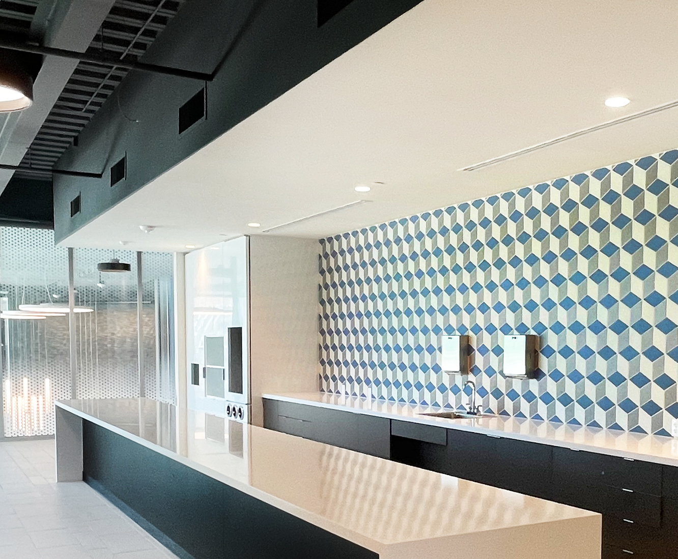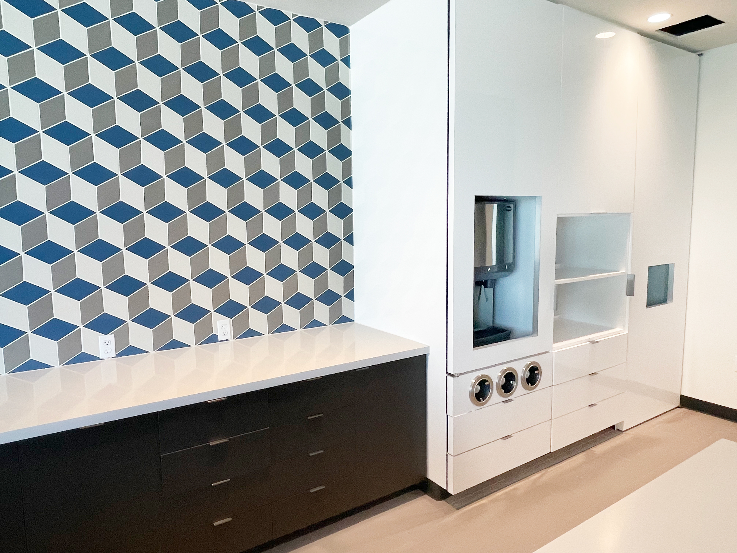 As you move through the space you can’t help but notice what may be our favorite part of this project – a grand staircase where we used warm custom wood and metal trim to continue the contemporary tone of this building. Since the cafeteria/dining hall serves over 1000 healthcare providers daily, we made it feel bright and calm, allowing workers to relax and enjoy their time away from patients. We used over-sized beveled white subway tile throughout the space keeping the overall look clean. Because long hours are part of the job, this facility added a beautiful coffee/refreshment area where we were able to flex our creativity and also present our eye for detail. The extravagant mosaic tile back splash adds a pop of color and an exciting visual to this break area.