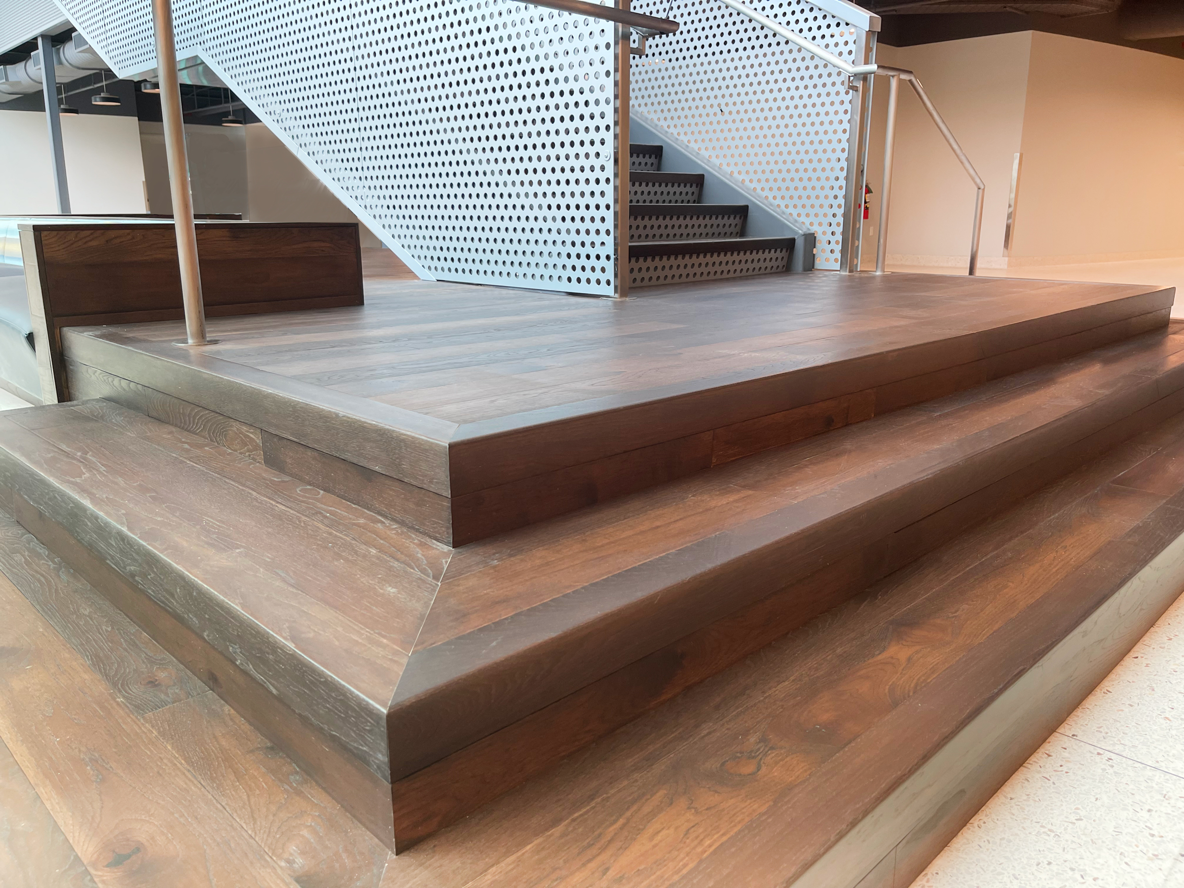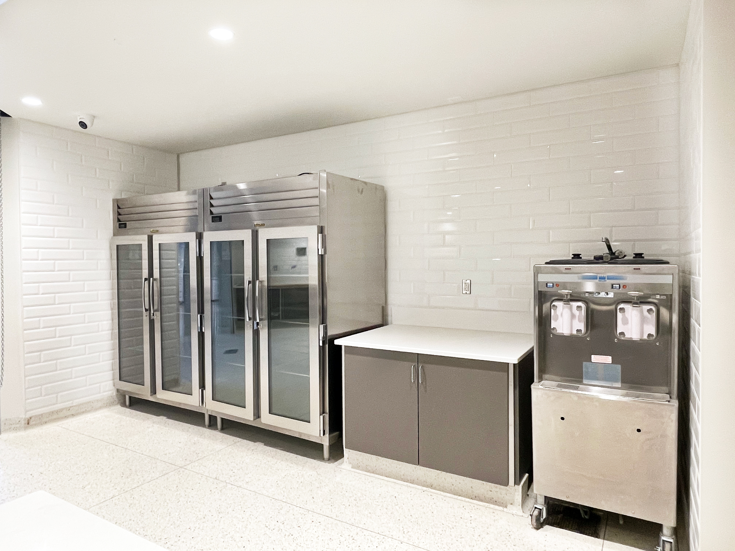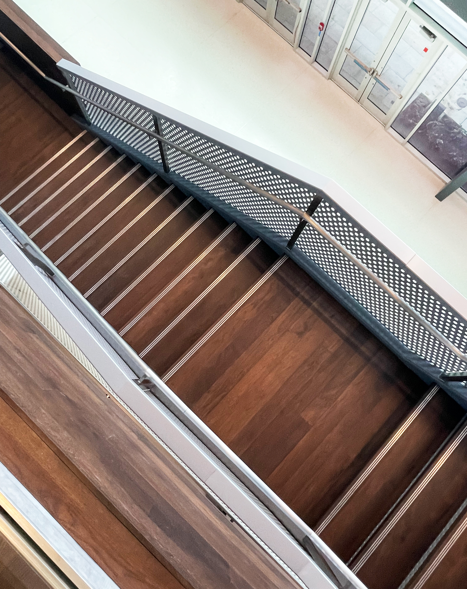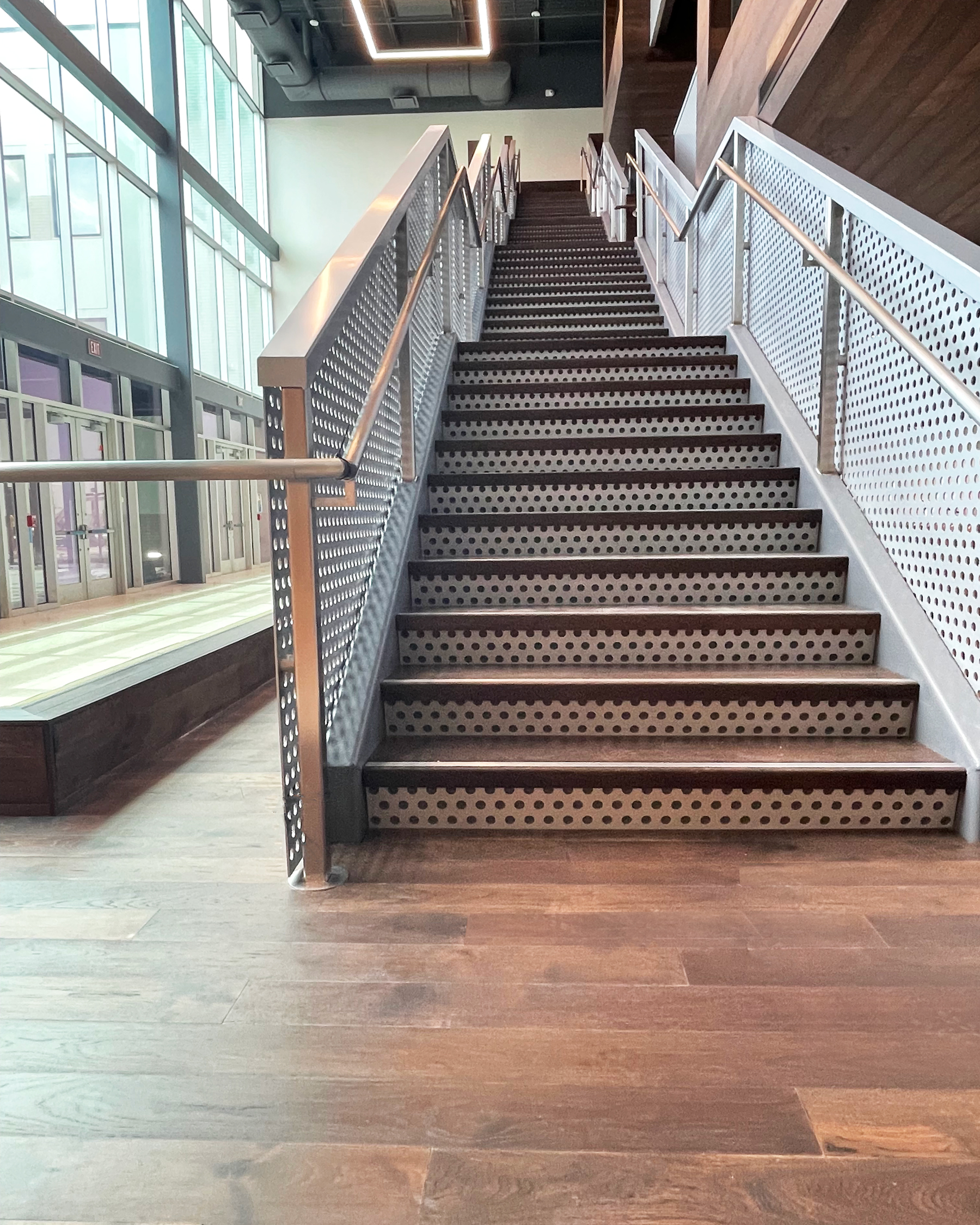 As you move through the space you can’t help but notice what may be our favorite part of this project – a grand staircase where we used warm custom wood and metal trim to continue the contemporary tone of this building. Since the cafeteria/dining hall serves over 1000 healthcare providers daily, we made it feel bright and calm, allowing workers to relax and enjoy their time away from patients. We used over-sized beveled white subway tile throughout the space keeping the overall look clean. Because long hours are part of the job, this facility added a beautiful coffee/refreshment area where we were able to flex our creativity and also present our eye for detail. The extravagant mosaic tile back splash adds a pop of color and an exciting visual to this break area.