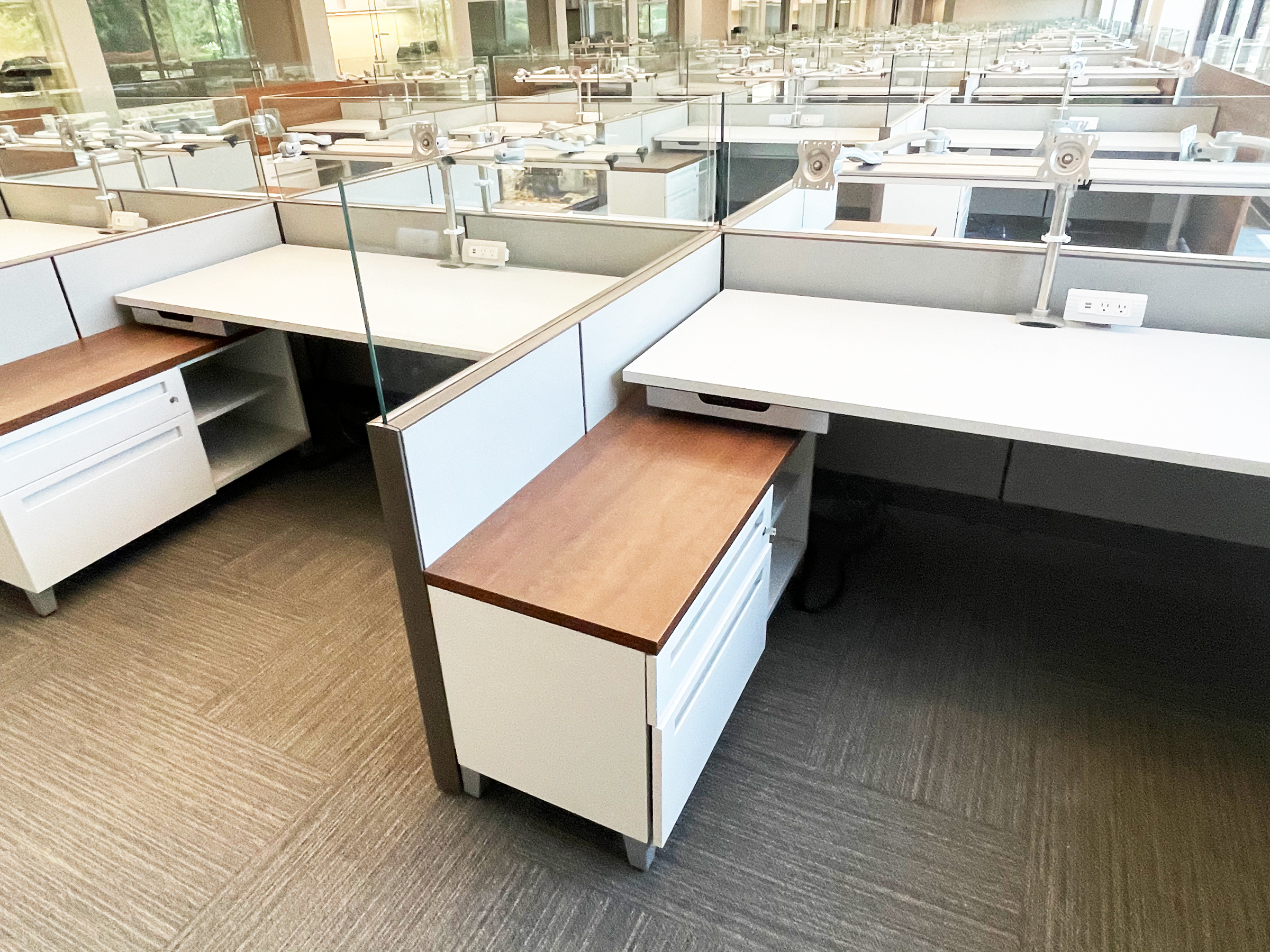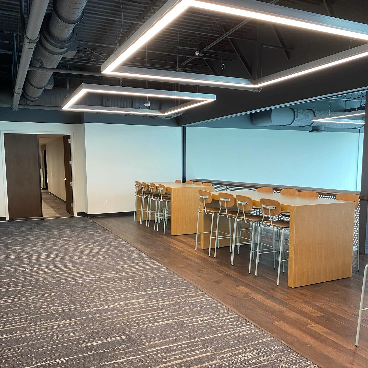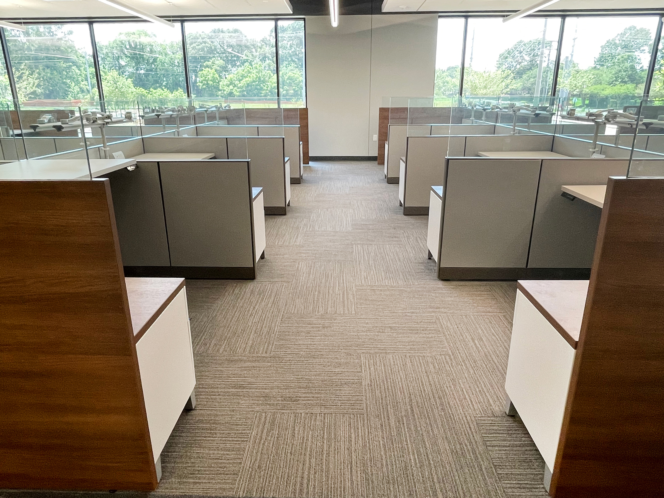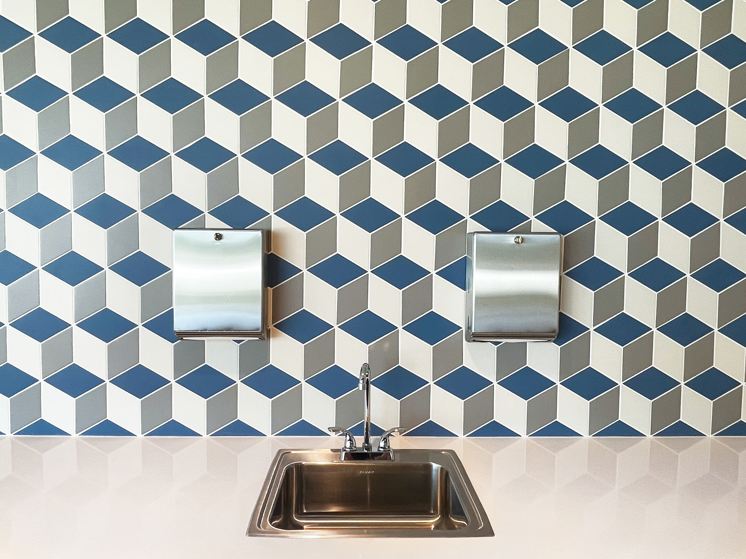 Don’t forget about the bathrooms! Large format tile is used on the floors while paper towel niches are covered in stunning blue penny round tile. Lastly, the office space/call center hosts hundreds of employees and cubicle areas. Carpet tiles line these vast areas making the space comfortable and resistant to echoing. Each material that we used is beautiful in its own right, but when we step back and look at the space as a whole there is unity and consistency – and that makes us proud as a team and organization.