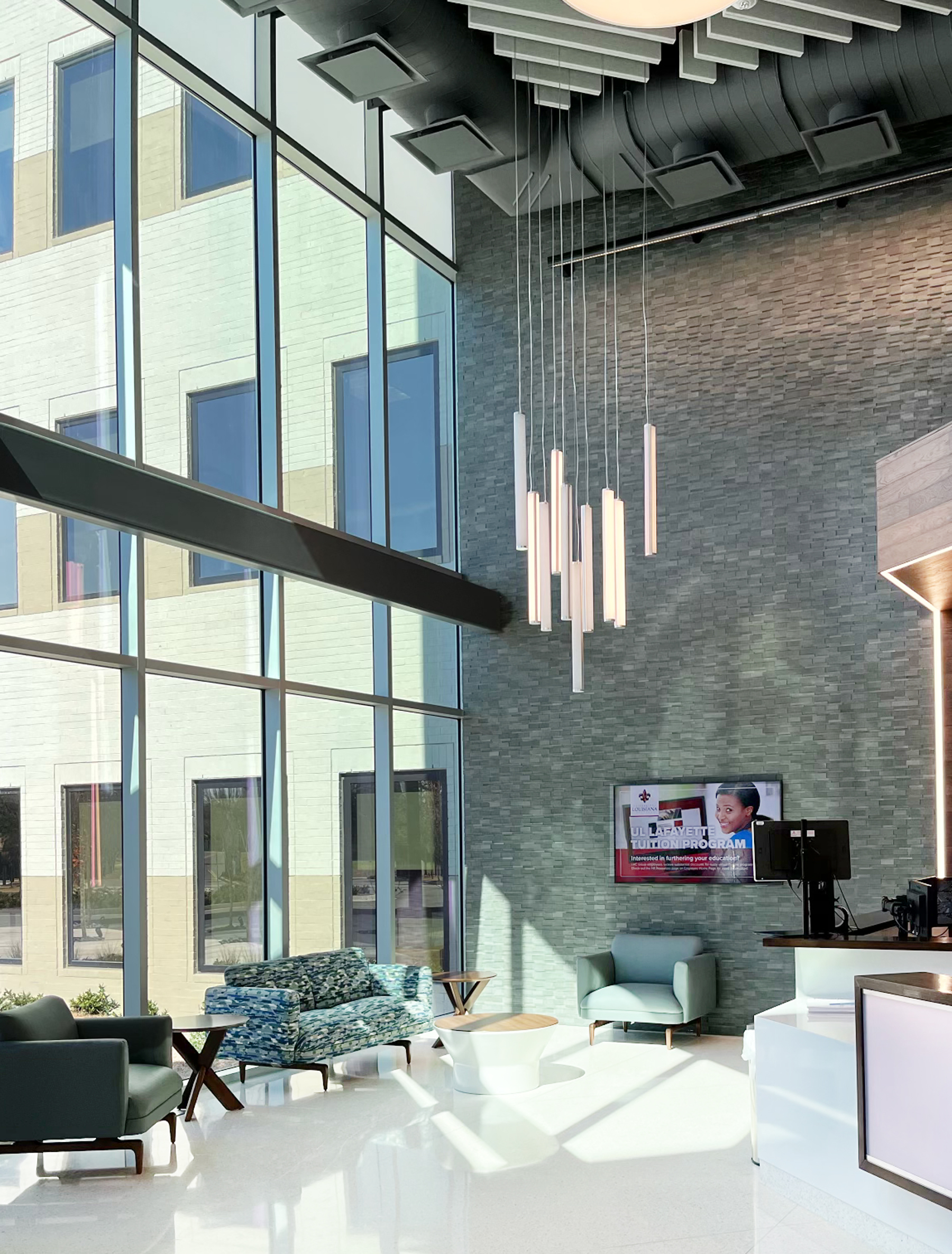 Supporting patients and caretakers with comfortable and familiar spaces has long been a priority for healthcare organizations, and it shows no signs of letting up. Anytime Flooring was pleased to be a part of building a new healthcare campus in Lafayette, Louisiana. The LHC Group offers office space for administrators and multiple clinic settings, as well as dining and break areas for all. In an effort to maintain durability and comfort while delivering chic and modern design, we incorporated a wide variety of materials into this build. The stone accent wall in the main lobby is impressive not only because of its scale but also because of the texture and depth that the stone tiling introduces to the space.