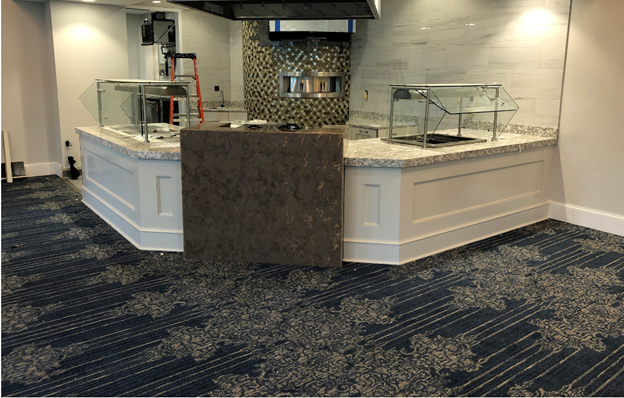 In the common areas, the Kahrs engineered wood is paired beautifully with the Shaw custom broadloom carpet. Broadloom designs add the statement-making style needed to bring this space to life and provides more cushion under foot than a normal commercial carpet tile to protect against joint pain. Additionally, broadloom is preferred in an assisted living facility, as its advantage is keeping spills above the subfloor due to the welded seams, making for an easy clean up!