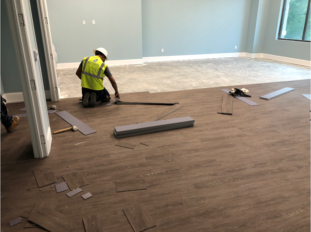 We installed this heterogenous vinyl flooring in the on-site fitness facility. It’s an easy fit to our continuing product mold, as it has a 5mm base layer made of vulcanized composition rubber that adds another aspect of comfort to the tenants during wellness gatherings. Not to mention, the wood-look design is sharp and home-y!
