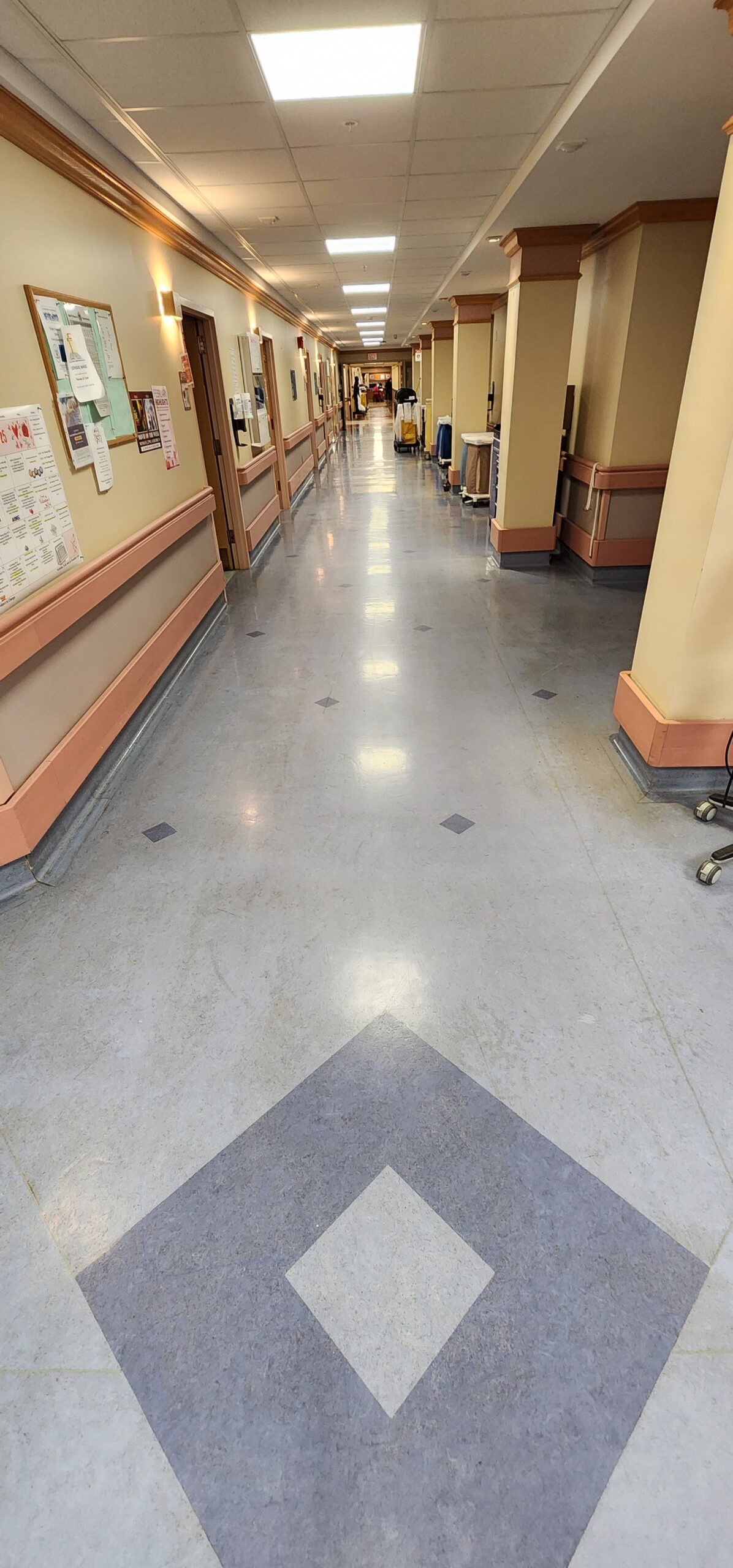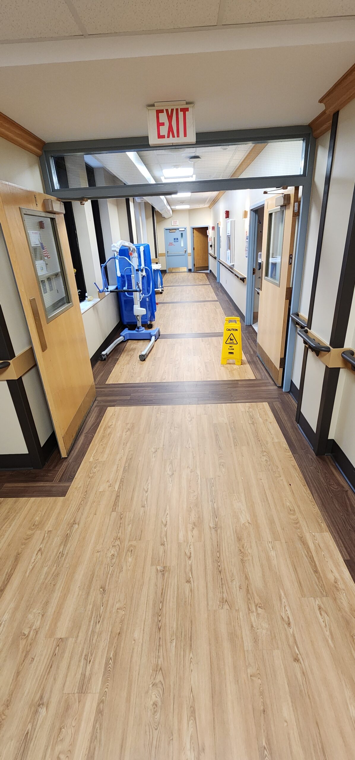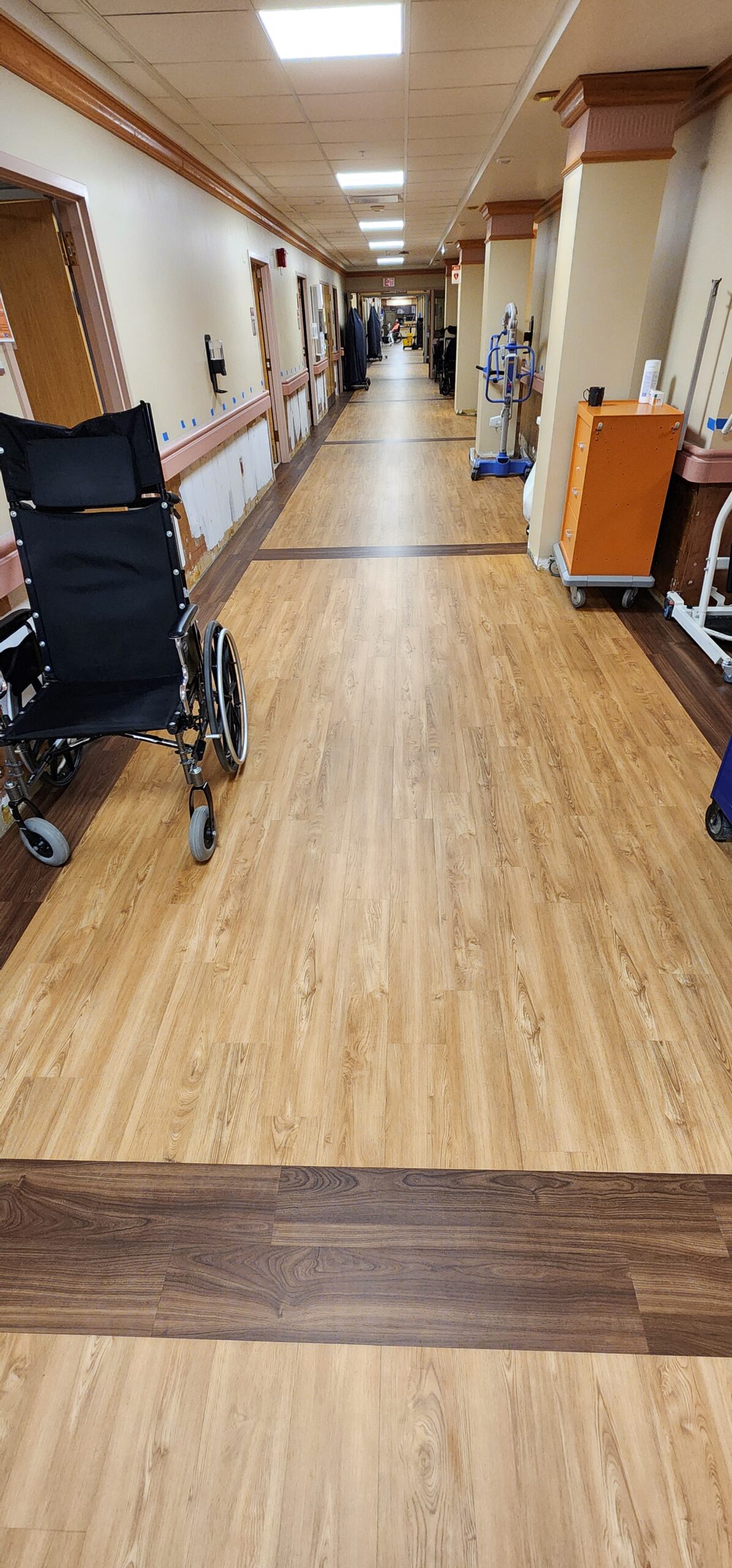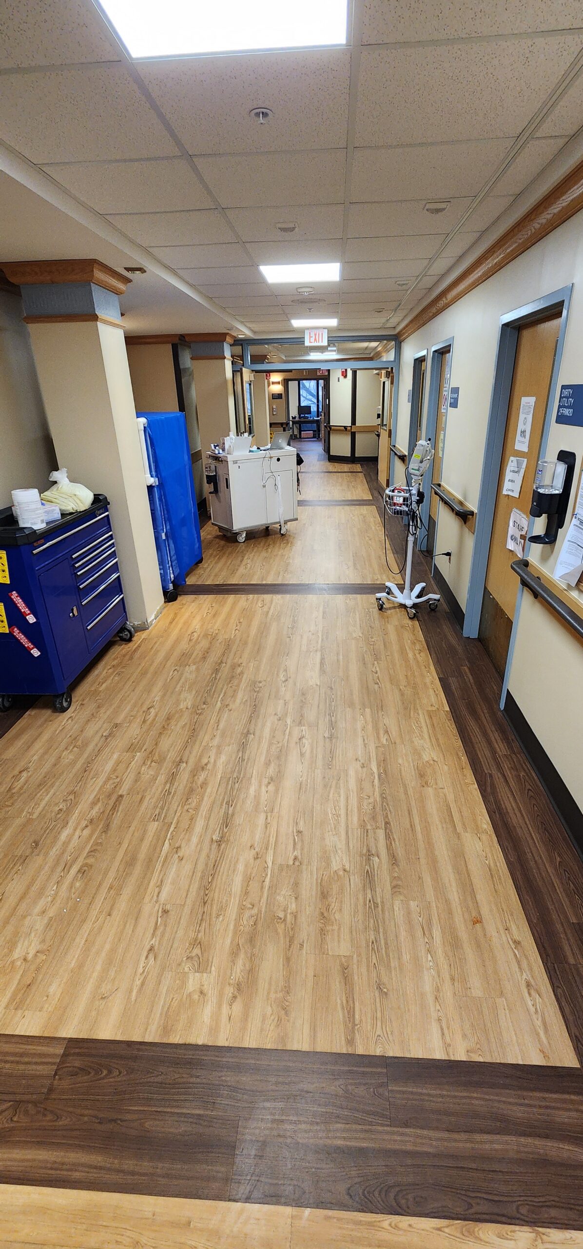 Our team had the privilege of revitalizing the flooring in an existing community hospital dedicated to providing accessible healthcare to underserved populations. The goal was to create a welcoming, uplifting environment that reflected the hospital’s mission of care and compassion while addressing the practical needs of a high-traffic medical facility. Using a creative combination of Tarkett LVT in various colors and sizes, Roppe wall base, and Bostik floor leveling products, we delivered a design that was both functional and inspiring.