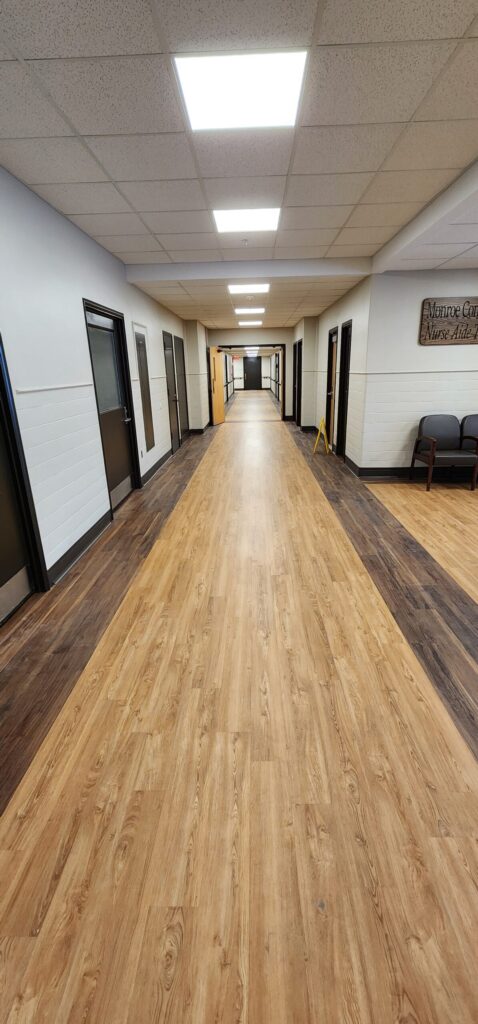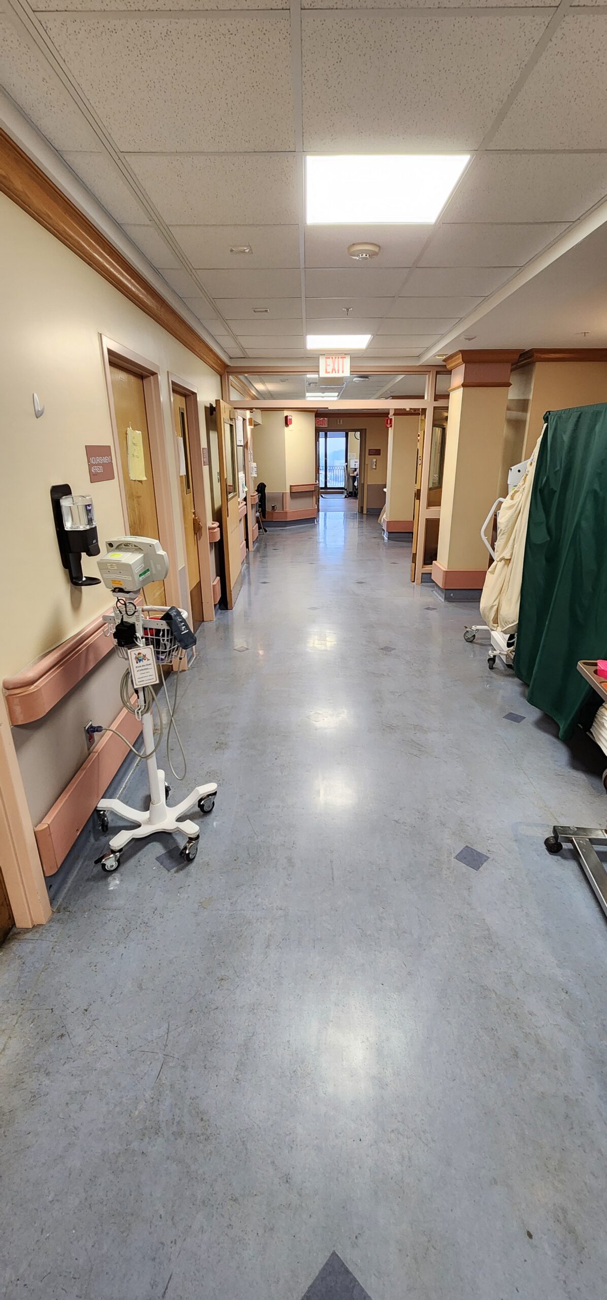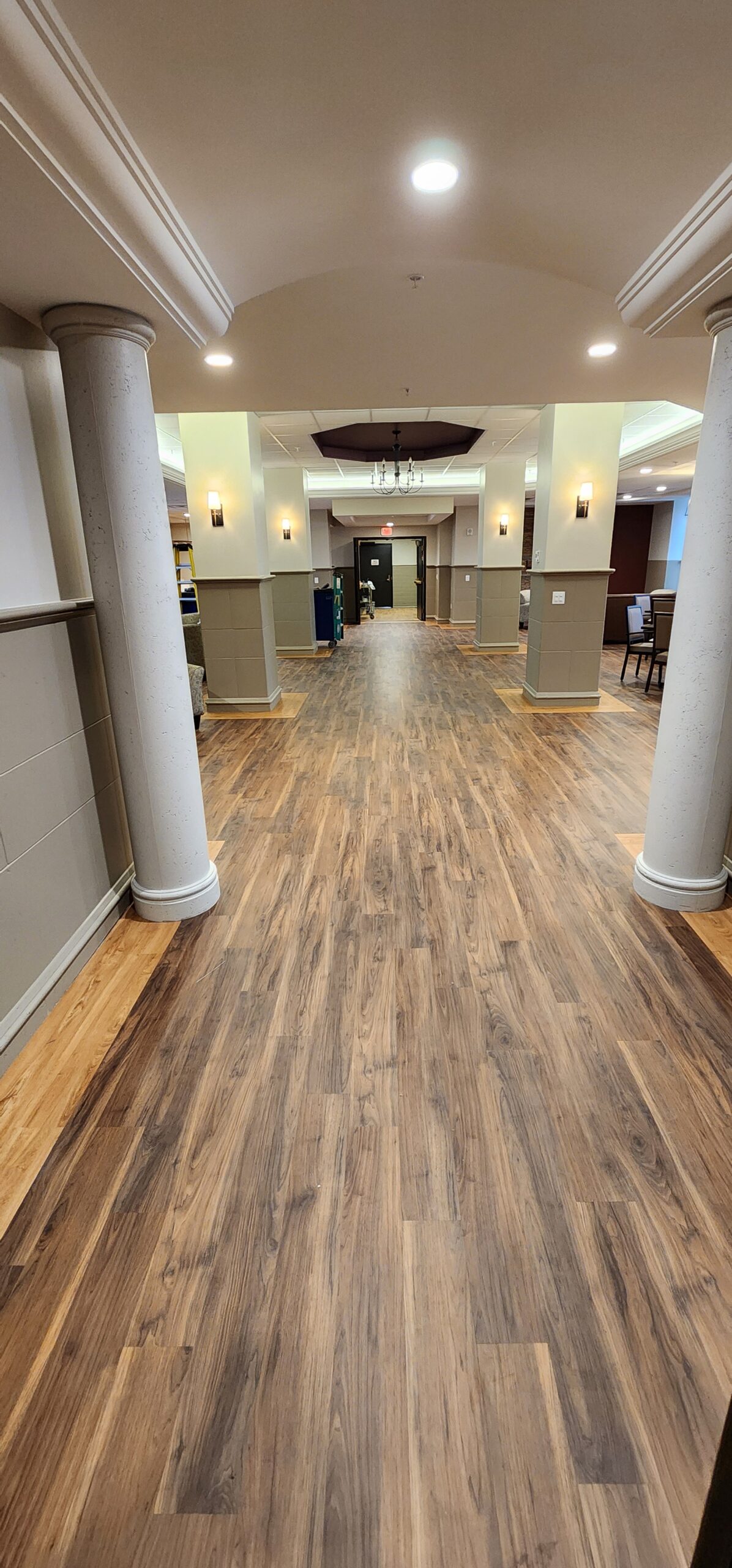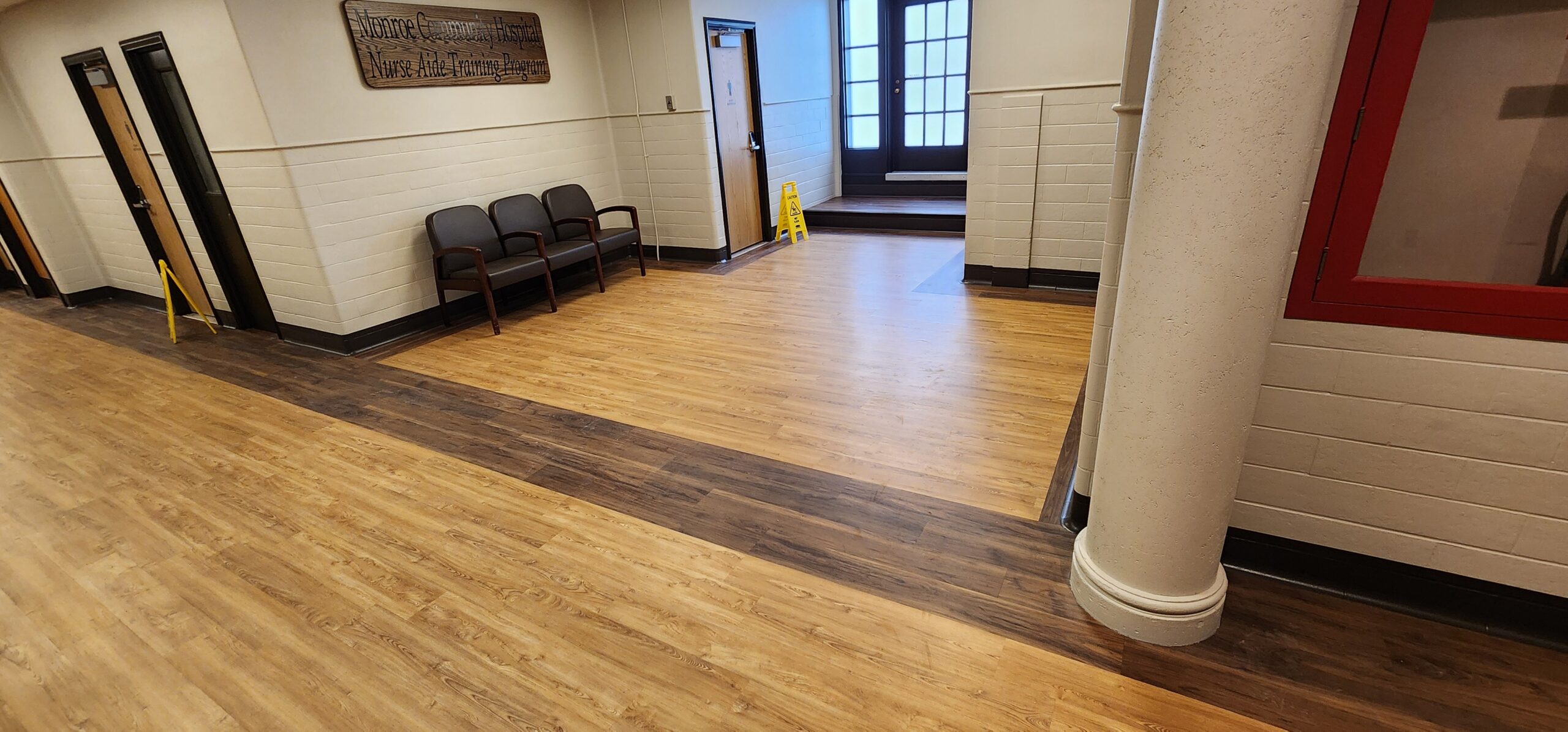 Our team had the privilege of revitalizing the flooring in an existing community hospital dedicated to providing accessible healthcare to underserved populations. The goal was to create a welcoming, uplifting environment that reflected the hospital’s mission of care and compassion while addressing the practical needs of a high-traffic medical facility. Using a creative combination of Tarkett LVT in various colors and sizes, Roppe wall base, and Bostik floor leveling products, we delivered a design that was both functional and inspiring.
