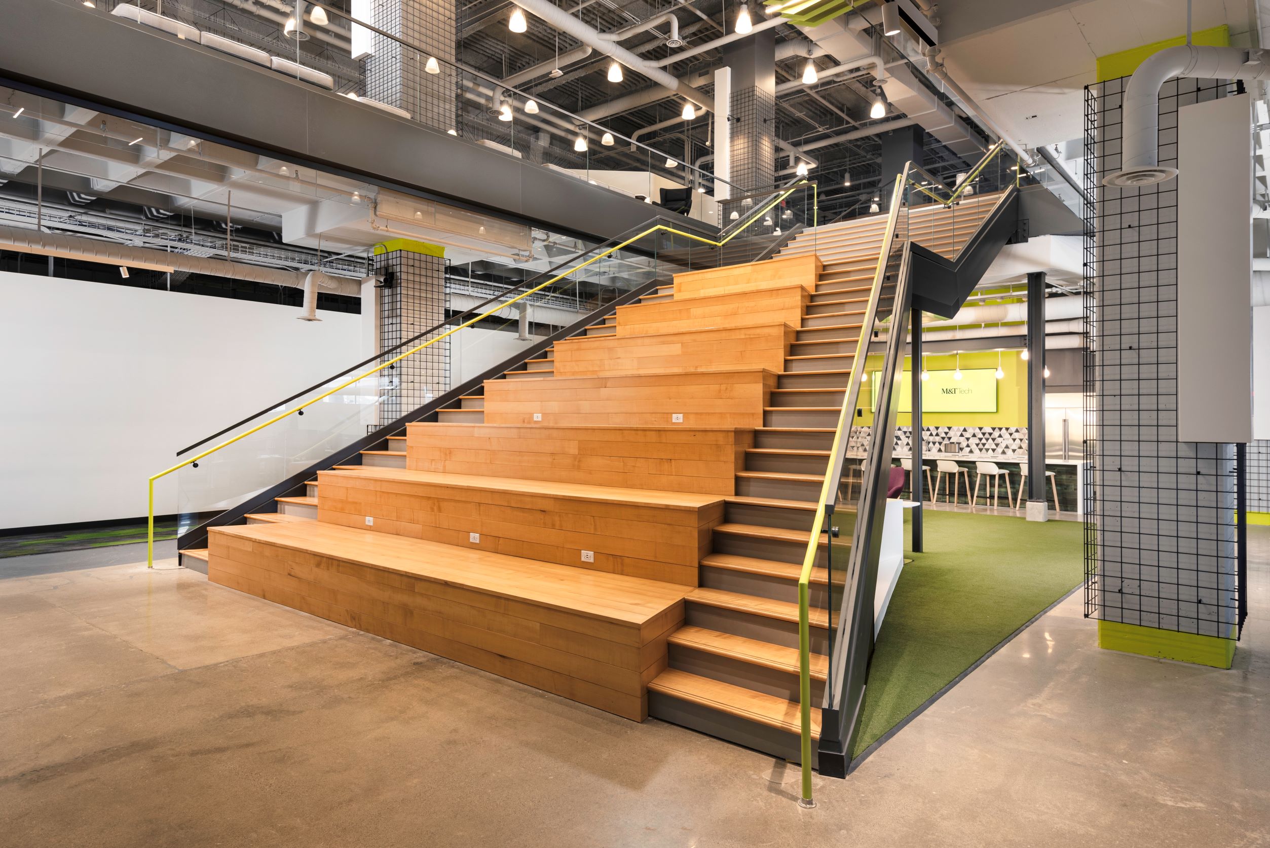 The flooring in this creative space is a perfect combination of versatility and style. The Milliken carpet tile brings a comfortable feel to the space, creating an inviting atmosphere for production and collaboration. The tiles come in a variety of textures, patterns, and colors, allowing the creation of a unique environment.
