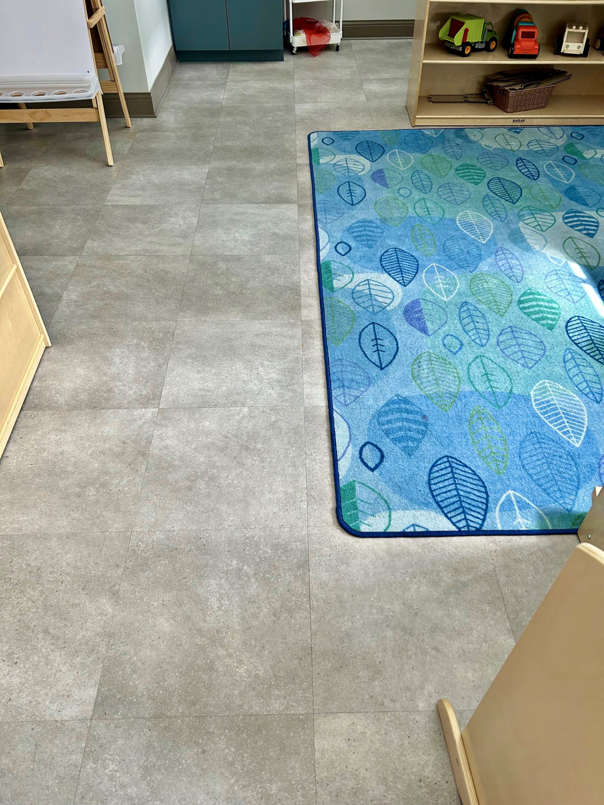 Garmon and Company played a pivotal role in executing this vision with precision and expertise. Starting as the substrate, all floor prep was achieved using Uzin floor patch. Understanding the material compatibility ensured seamless transitions between Marmoleum, Shaw LVT, and carpet tile, enhancing both durability and aesthetic appeal. Complementing the Marmoleum, the installation of Shaw Luxury Vinyl Tile (LVT) was strategically chosen to bring a subtle hint of stone terrazzo into the space, seamlessly integrating with the church’s classic and contemporary design elements. The Shaw carpet tile was also creatively selected not just for comfort and durability but for its ability to create a warm, inviting ambiance throughout the corridors and learning spaces. To achieve a cohesive and polished look, Johnsonite rubber base and quarter round were expertly installed to mimic wood, adding a sophisticated yet practical finishing touch. The meticulous installation of Johnsonite rubber base and quarter round further refined the project, mimicking wood for a sophisticated yet durable finish.