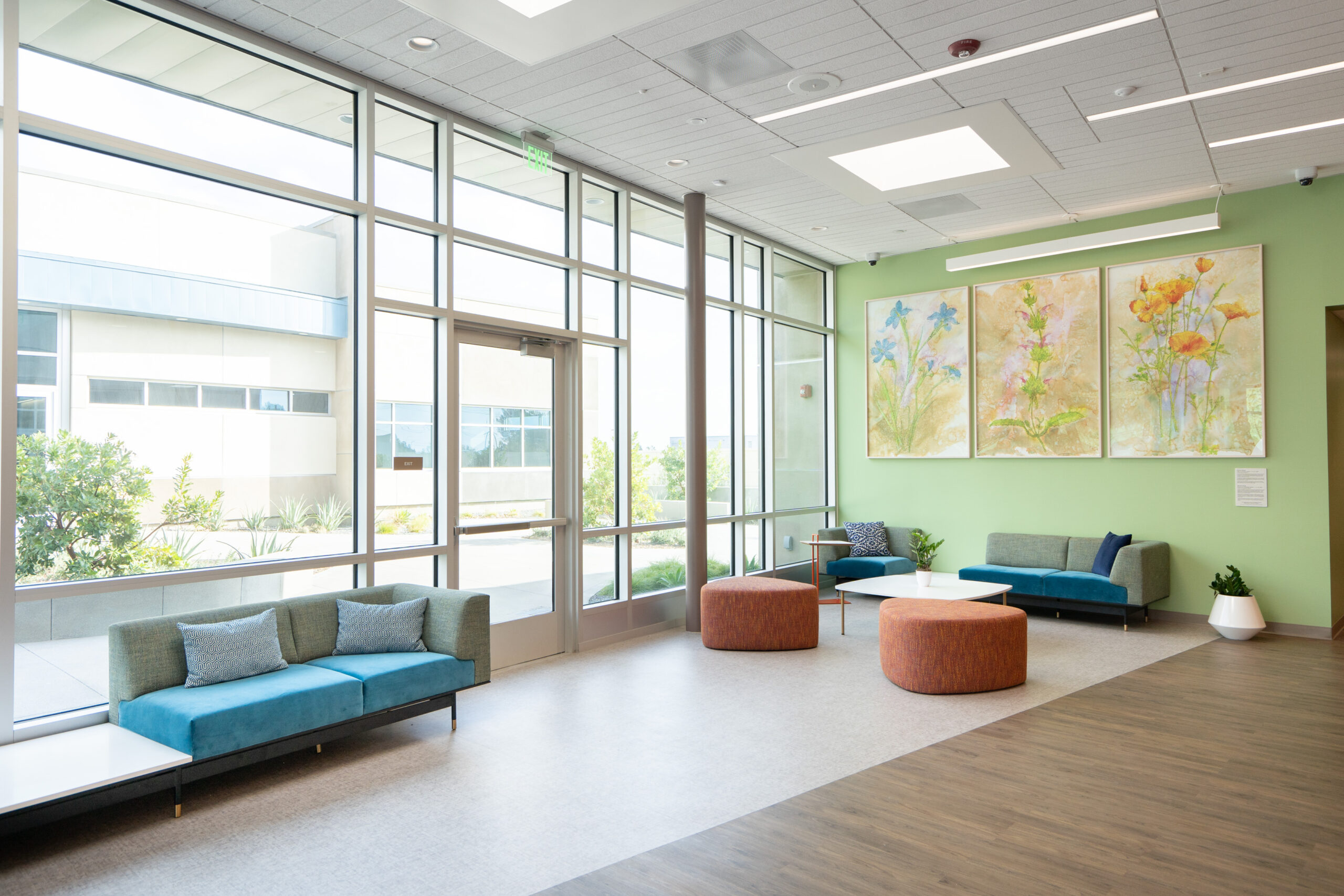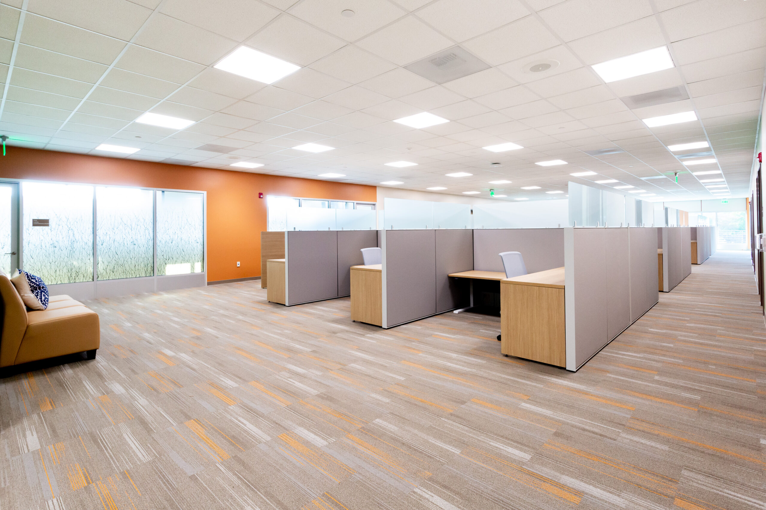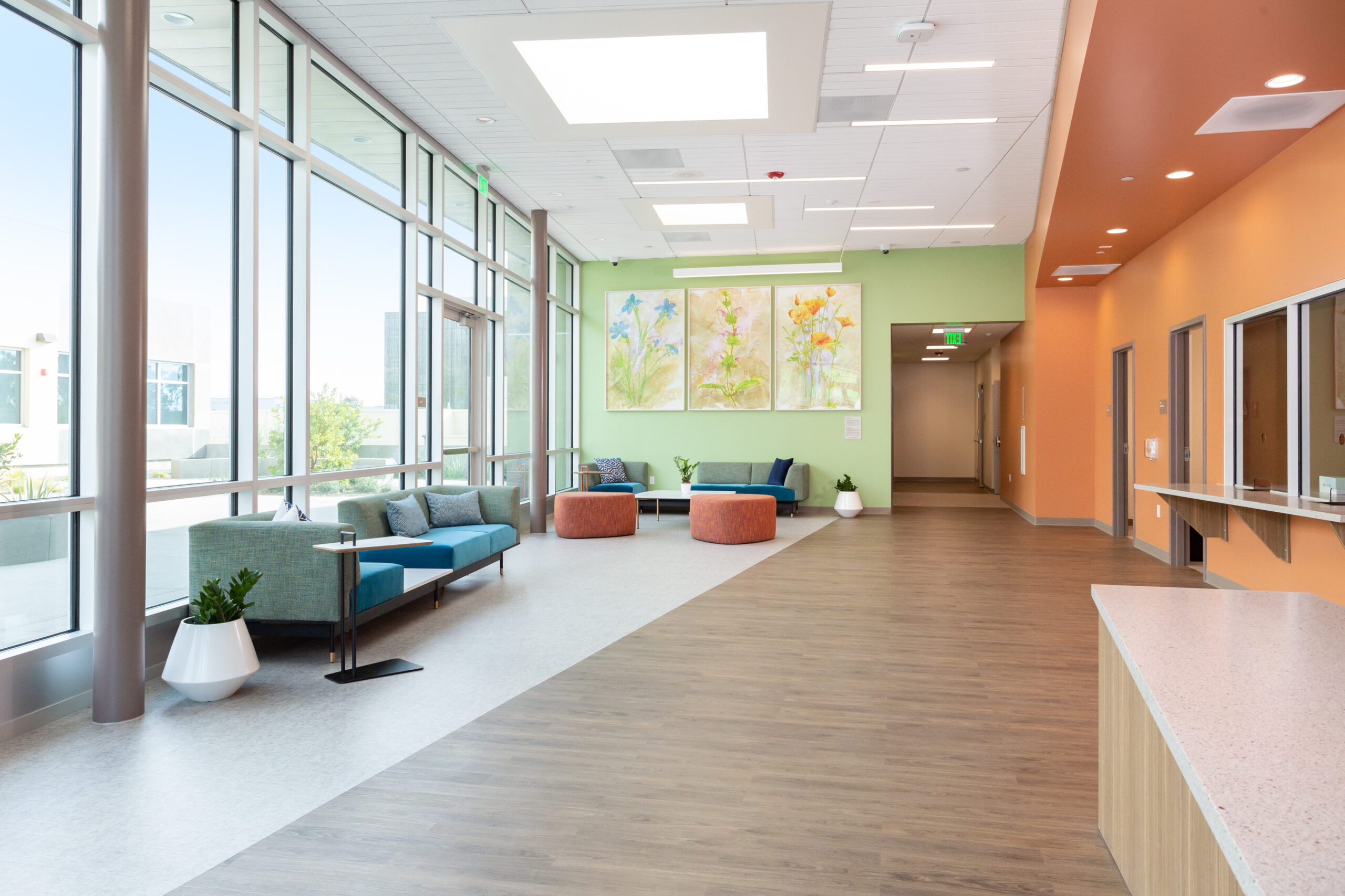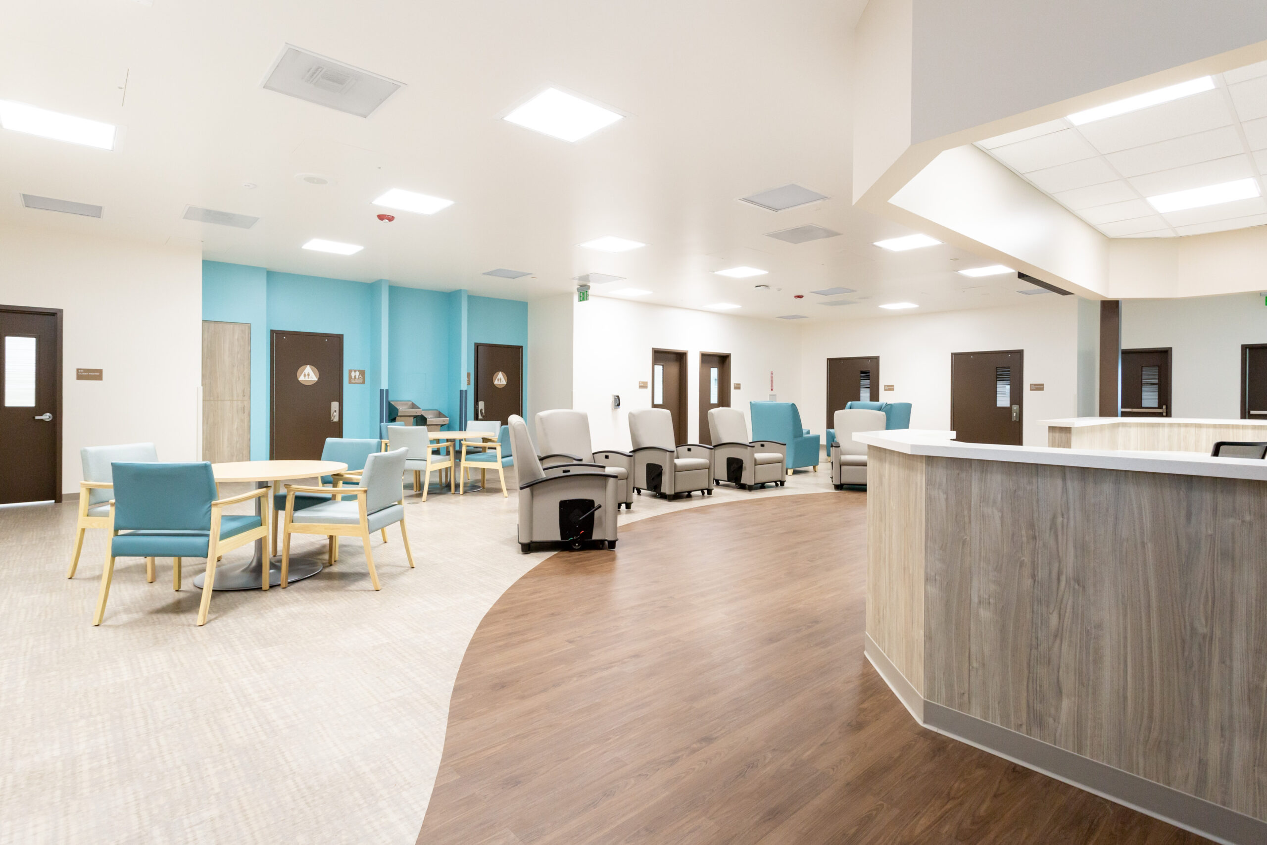 Package B features two traditional ground-up buildings – a 10,000 SF Mental Health Urgent Care Center and a 10,000 SF Mental Health Wellness Center. Similarly, we installed Daltile floor tile and full-height wall tile in the 14 Restrooms and Teknoflor Forest Plank HPD, Teknoflor Medscapes HPD Resilient Sheet, Armstrong VCT and Carpet throughout the remaining areas.