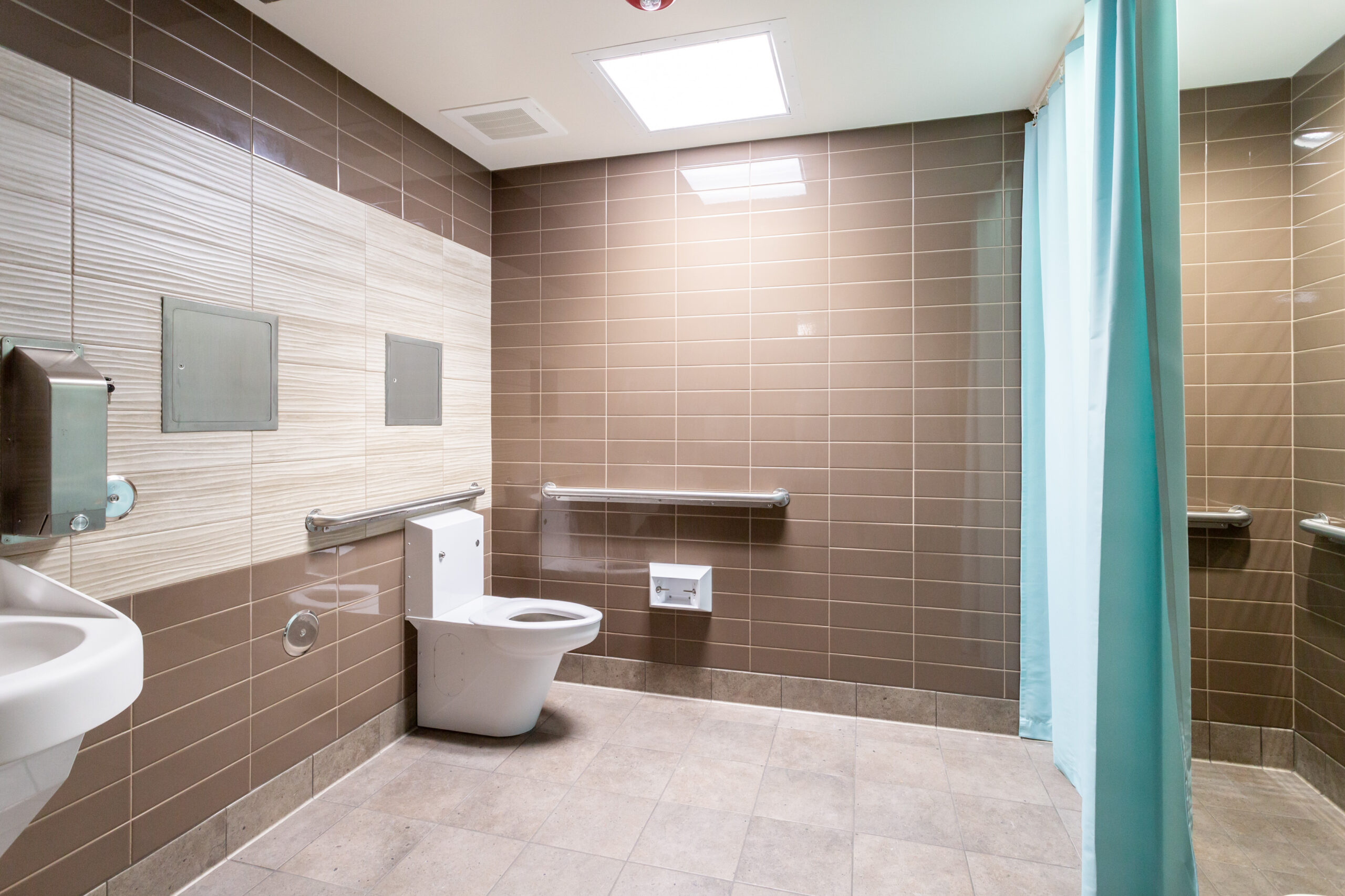 Package A features 5 Residential Treatment Programs (RTP) made up of 5 two-story modular buildings with 80 beds (47,000 SF total) and the Recuperative Care Center (RCC), a two-story 18,000 SF building with 44 beds (6 modular buildings total). We installed Daltile floor tile and full-height wall tile throughout the 45 RTP and 19 RCC Restrooms along with Teknoflor Nature’s Tile HPD, Teknoflor Naturescapes HPD Resilient Sheet, Armstrong Bio-Based Striations Tile and Carpet throughout the remainder of each space.