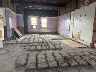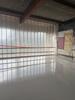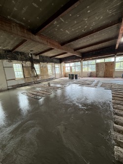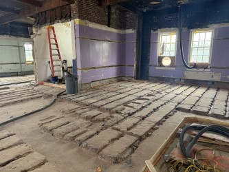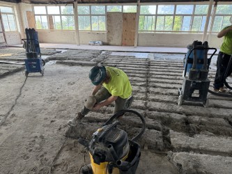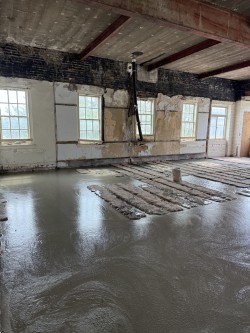 Existing building was built in 1903, we encountered several layers of old flooring that was removed by the demo contractor. We worked closely with Uzin to have the demo contractor remove everything required at we were required to hit depths up to 5″ in most areas. The weight of the subfloor prep materials was a major concern. Working with the architect and Uzin we determined that Uzin LW144 was the ideal product for the situation considering depths and weight. The Uzin LW144 is their lightweight leveler that was a great choice for the job. We pumped over 2000 bags over an area consisting of 10,000 sf. We also used Uzin PE460 in the basement that was on grade with no moisture barrier present, so this also was a perfect choice to insure no future moisture issues.
