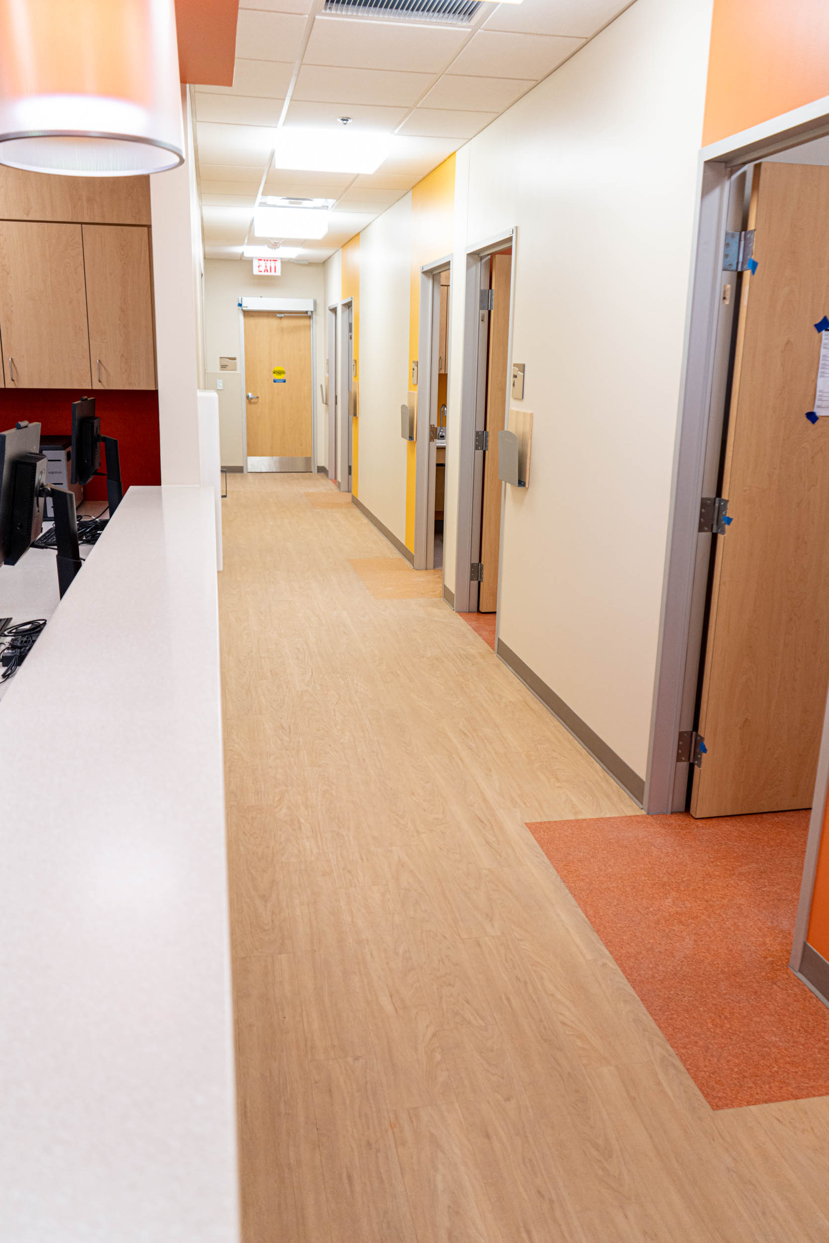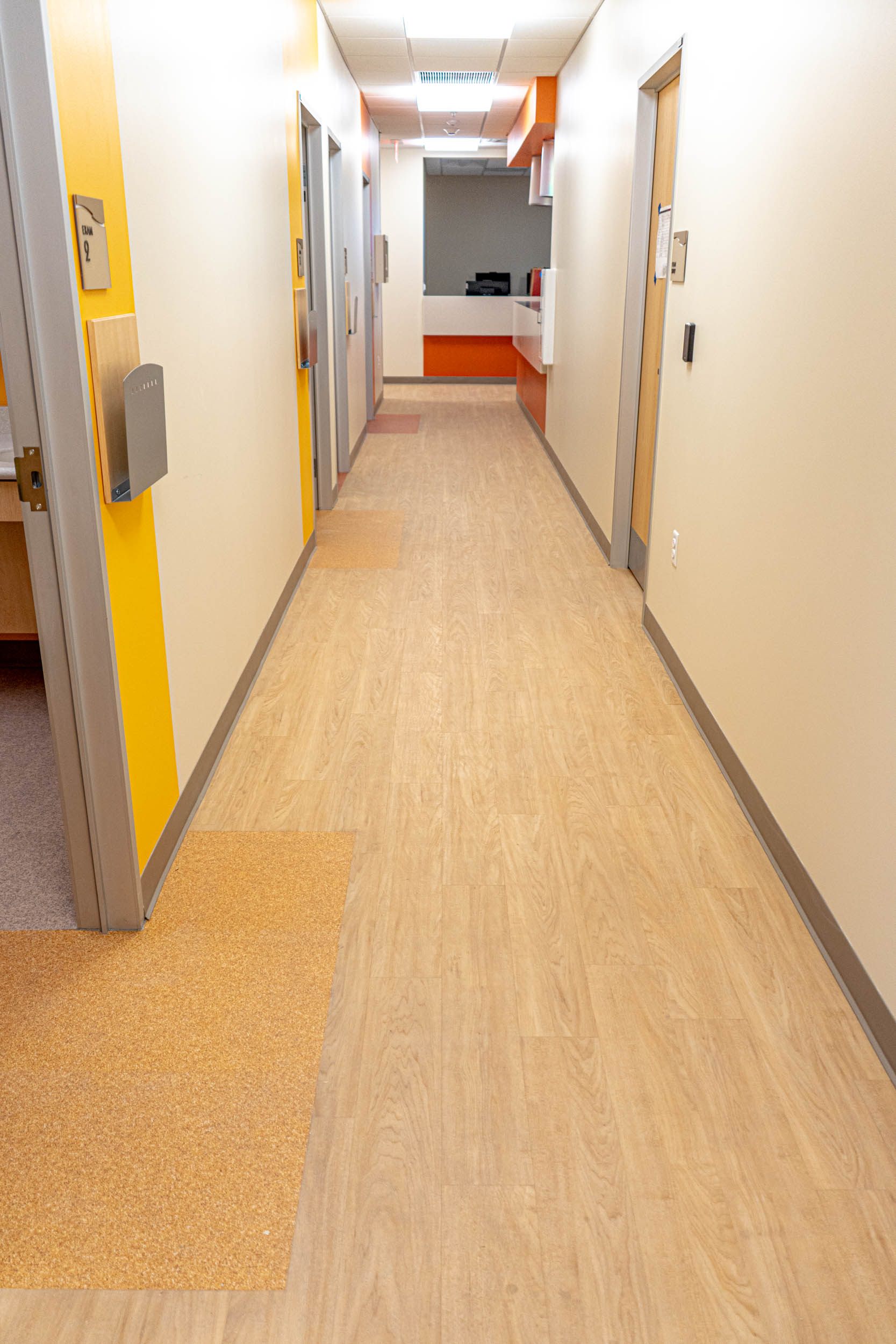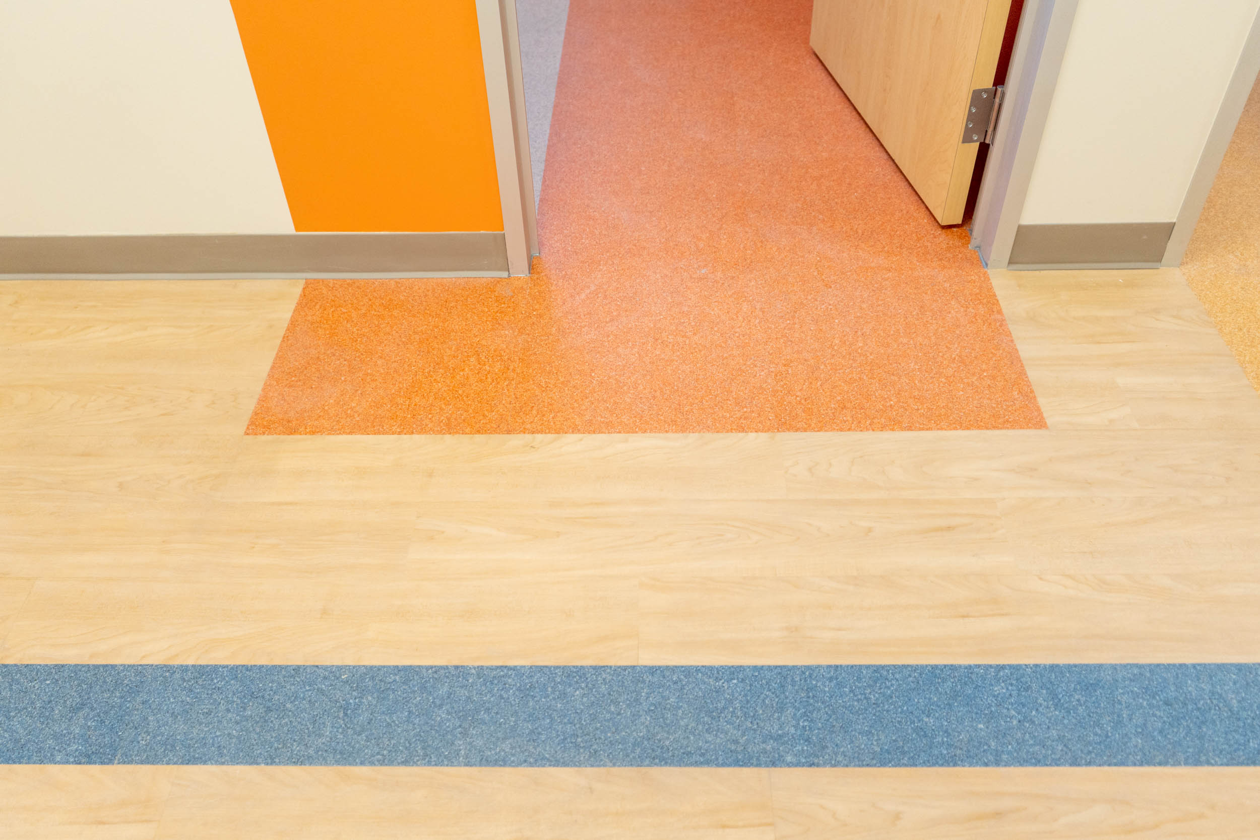 A total of ten different colors were introduced with the consistent background of Canadian Maple Wood as well as a Tarkett Luxury Vinyl Tile Color Play / Color Pop Apricot, Cardinal, Paprika, Dandelion, Lime, Bermuda, Plum and Pink. Each color provided specific guidance to procedure rooms, assisting patients to locate the correct location of their treatment.