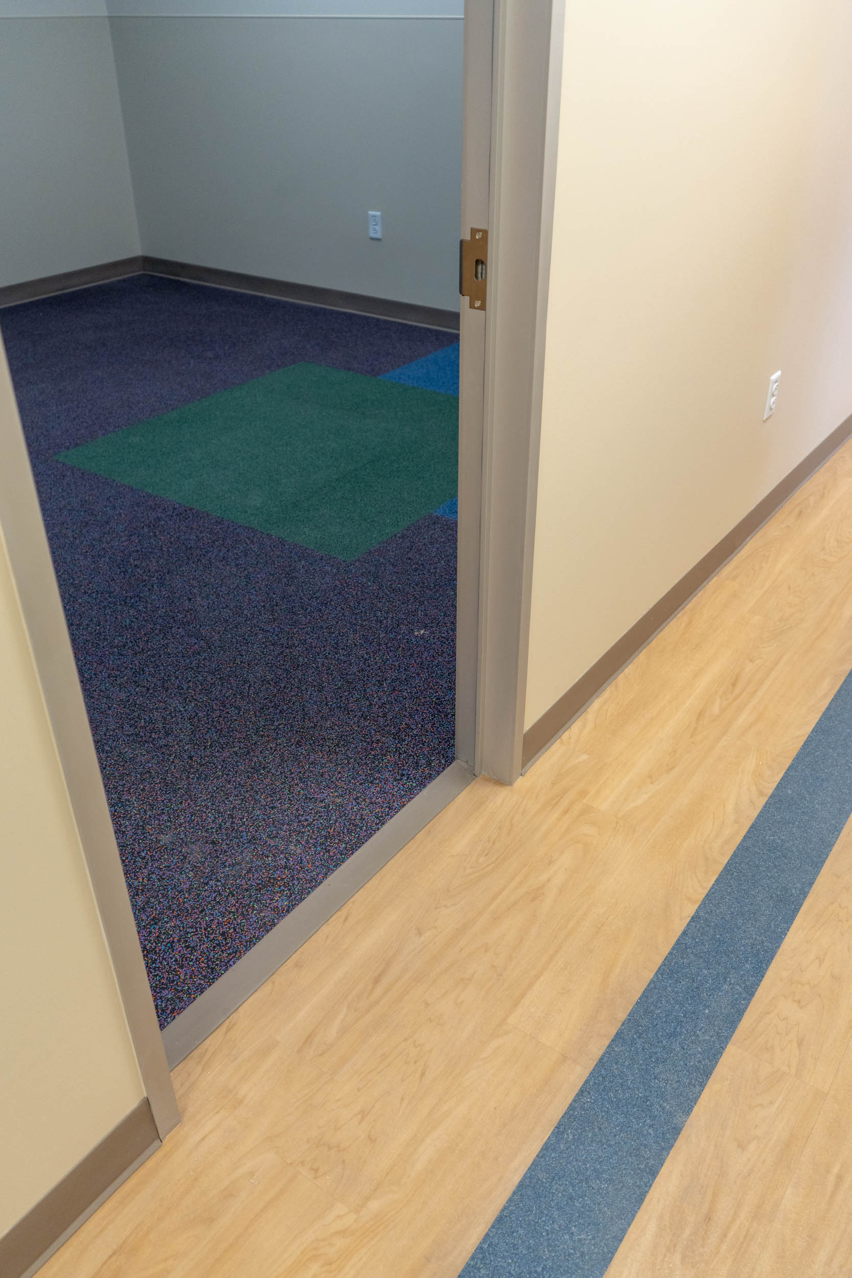 Johnsonite cove base, t-moldings, thin line transitions and transitions were used throughout the installation, complimenting each room with complimentary or contrasting colors and finishing affects. All products were set, according to manufacturer specifications, utilizing Mapei adhesives.