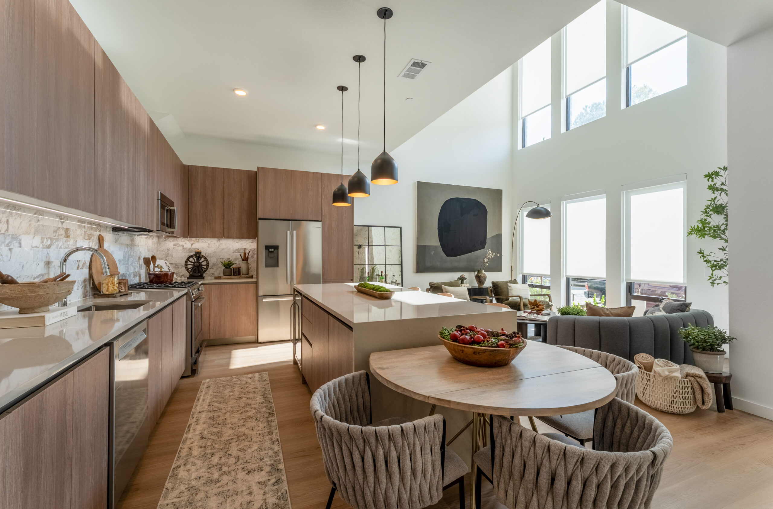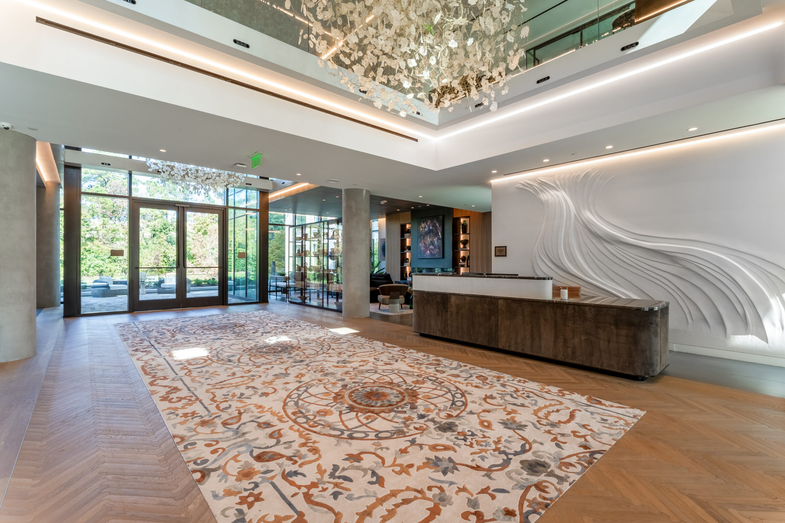 The flooring scope included 211,350 square feet of Dal-Tile LVT and 36,000 square feet of Dal-Tile ceramic tile within the residential units, complemented by Milliken carpet, Shaw LVT, and Johnsonite base throughout the common areas. These materials were thoughtfully selected and integrated to create a cohesive, durable, and visually refined environment across two distinctly scaled buildings.